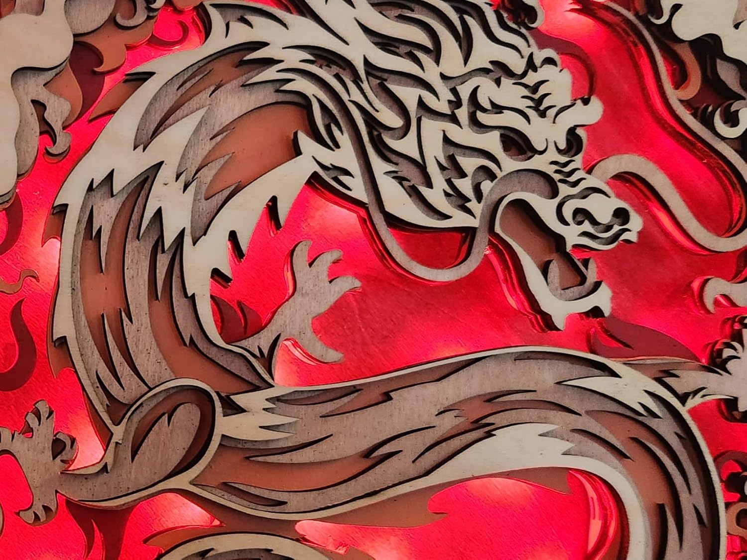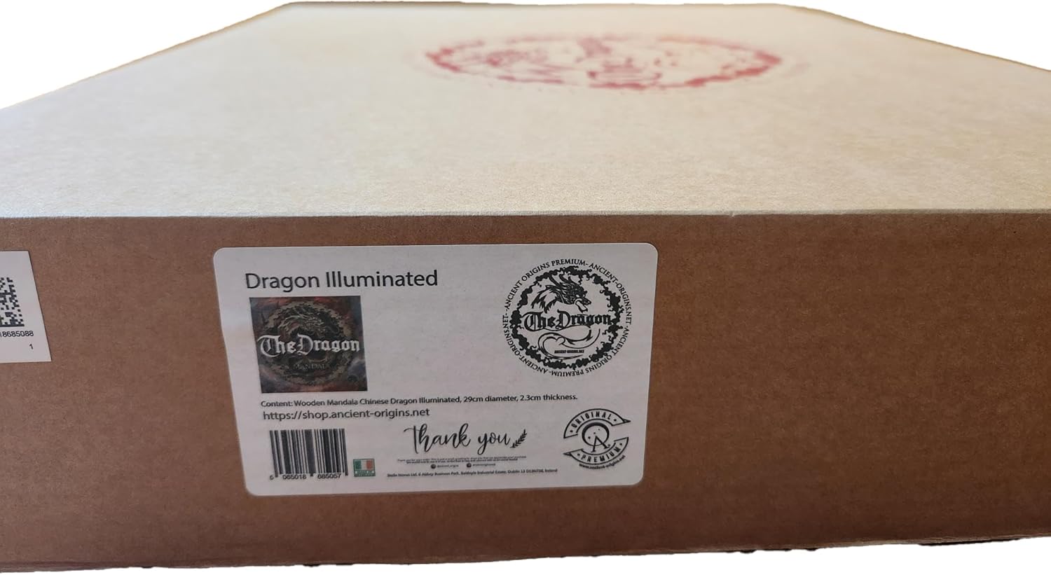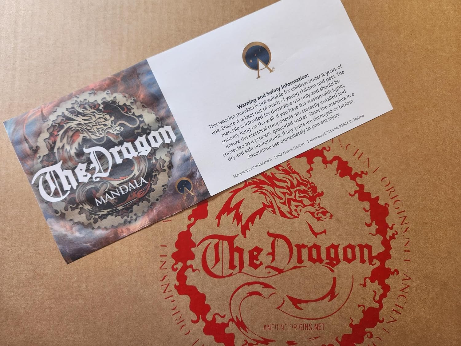 Design mistico del drago cinese: celebra la mitologia cinese con un'opera d'arte mandala raffigurante "Loong", il leggendario drago cinese, che simboleggia potere e buon auspicio. Squisita fattura e dettaglio: intagliato al laser da più strati di legno, ognuno aggiunge profondità e complessità, con bordi leggermente bruciati per un aspetto autentico e antico. Omaggio culturale e simbolismo: più che un semplice arredamento, questo pezzo rende omaggio al significato mitologico e culturale duraturo del drago nel patrimonio cinese. Illuminazione a LED interattiva: Dotato di illuminazione a LED multicolore, controllabile da remoto o app, trasformando il mandala in un display artistico dinamico e coinvolgente. Opera d'arte esclusiva e personalizzata: ogni mandala è numerato in modo univoco, indicando il mese e l'anno di incisione, rendendolo un oggetto da collezione distintivo. Kit di illuminazione completo incluso: viene fornito con un versatile caricatore USB multi-porta, adattatore multi-paese e un cavo di prolunga da 2 metri, che garantiscono un utilizzo facile e adattabile in qualsiasi ambiente.