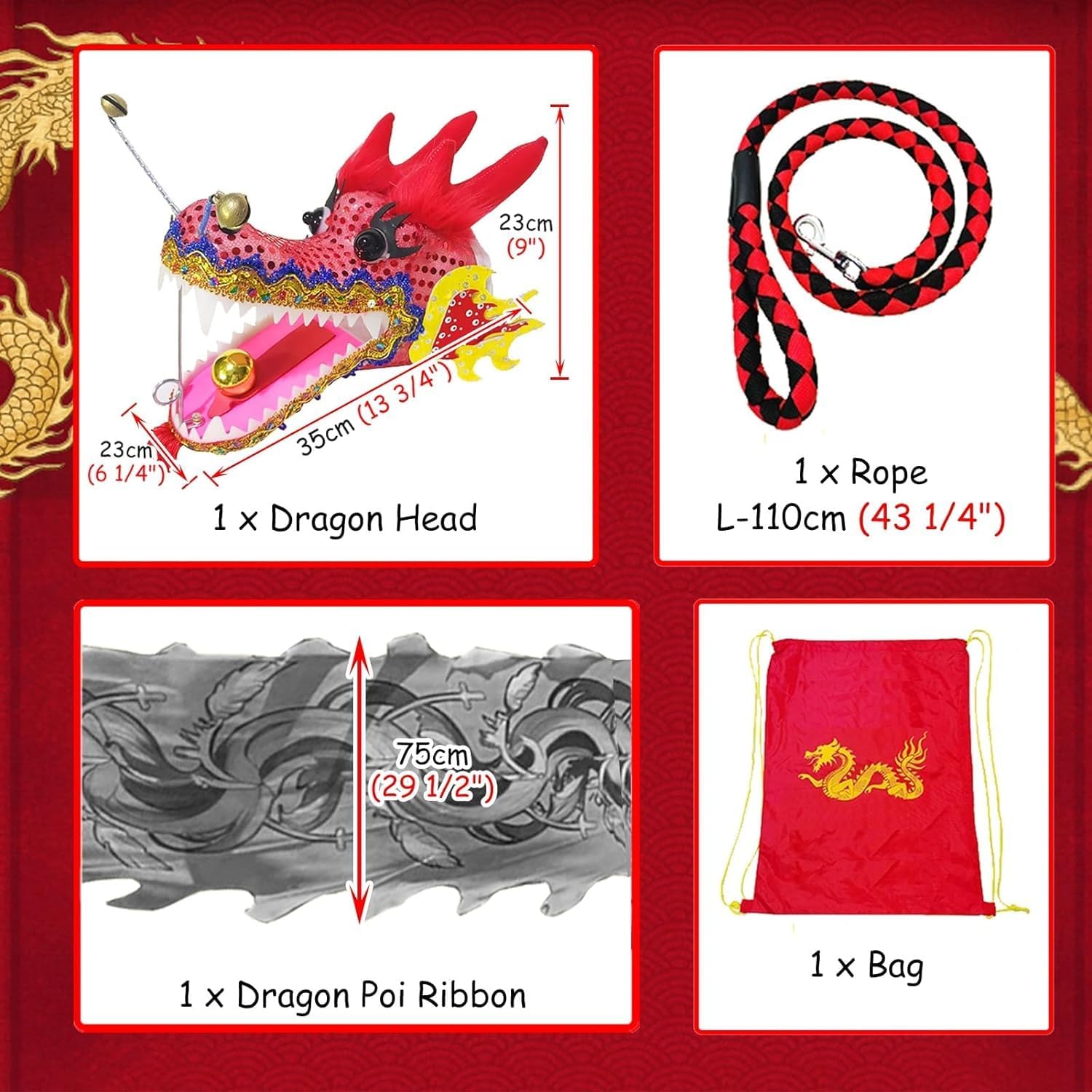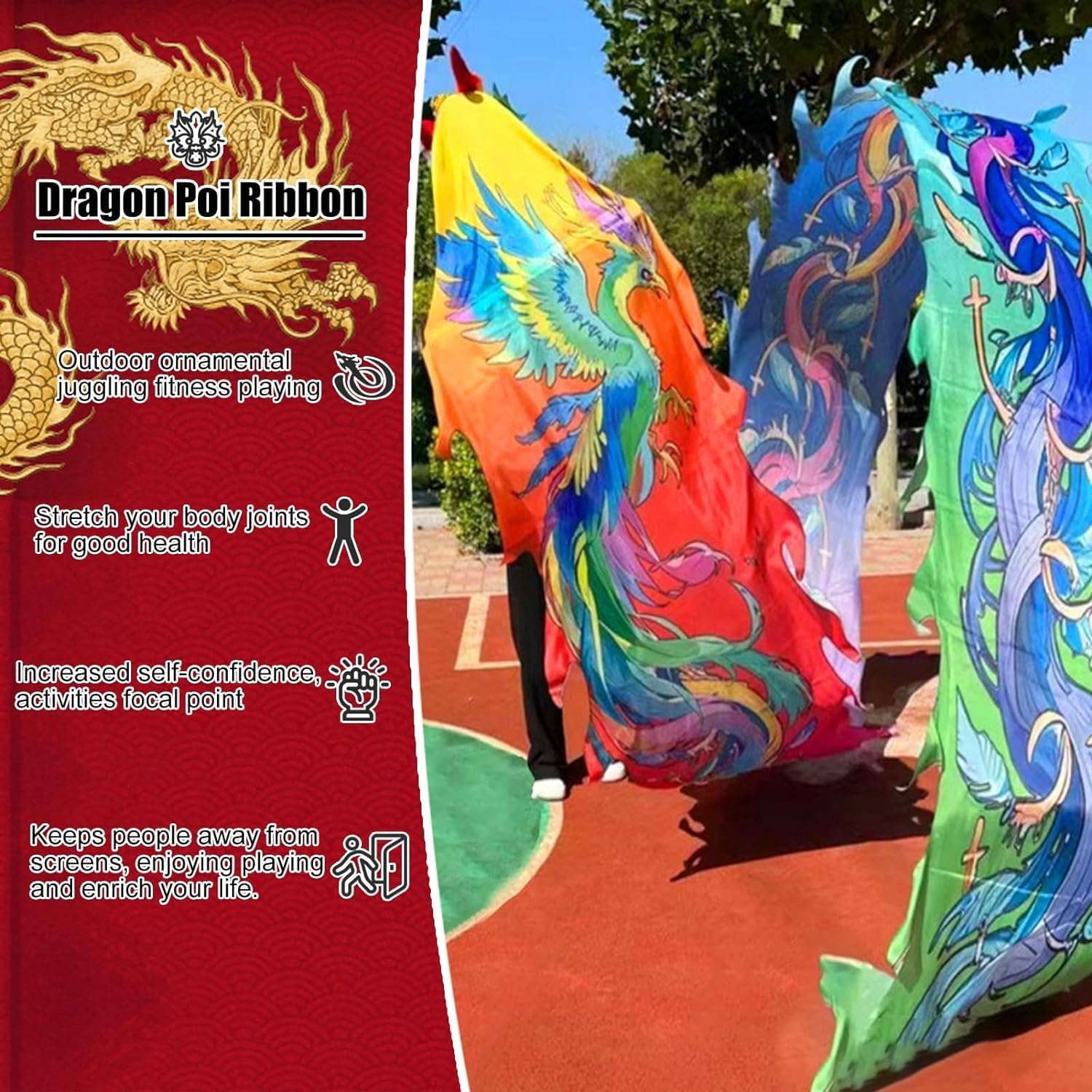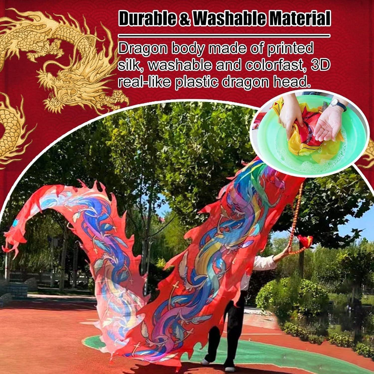 Allenamento della parte superiore e inferiore del corpo Questa è un'attrezzatura tradizionale per il fitness sportivo popolare. Attrezzature tradizionali per il fitness sportivo popolare per attività divertenti come la rotazione del bastone, la danza artistica, la ginnastica, l'esercizio fisico, il circo, i festival per bambini e così via. La combinazione di colori è brillante e realizzata in tessuto di raso di seta. Il tessuto è trattato in modo particolare, il colore è solido e non si stacca. Ottima scelta regalo. Ottimo regalo di compleanno, Natale e vacanze per parenti, genitori, amici e vicini. INSTALLAZIONE FACILE: basta attaccare gli occhielli di metallo alla testa del drago, quindi attaccare il velcro sul corpo del drago e sulla testa del drago a turno, quindi legare il corpo del drago con la corda per completare l'installazione. Gioco fantasioso: puoi ruotare la testa del drago sopra la tua testa e goderti l'effetto tornado dell'acqua che scorre o simulare la sensazione di un giro sulle montagne russe dal punto di vista di un bambino. (Consigliato per giocare in un'area aperta).