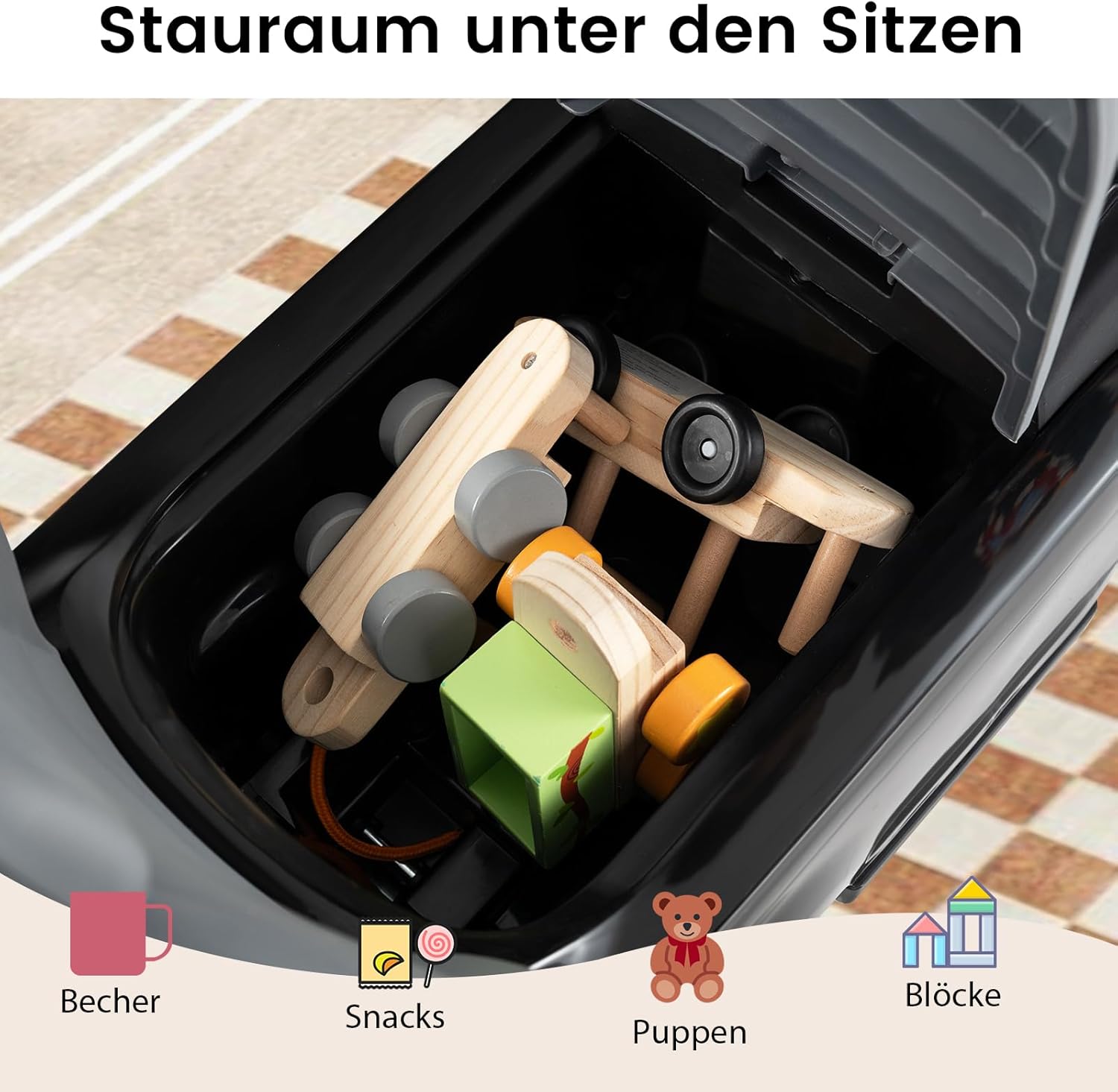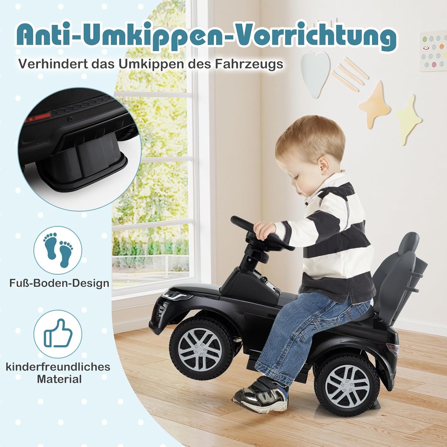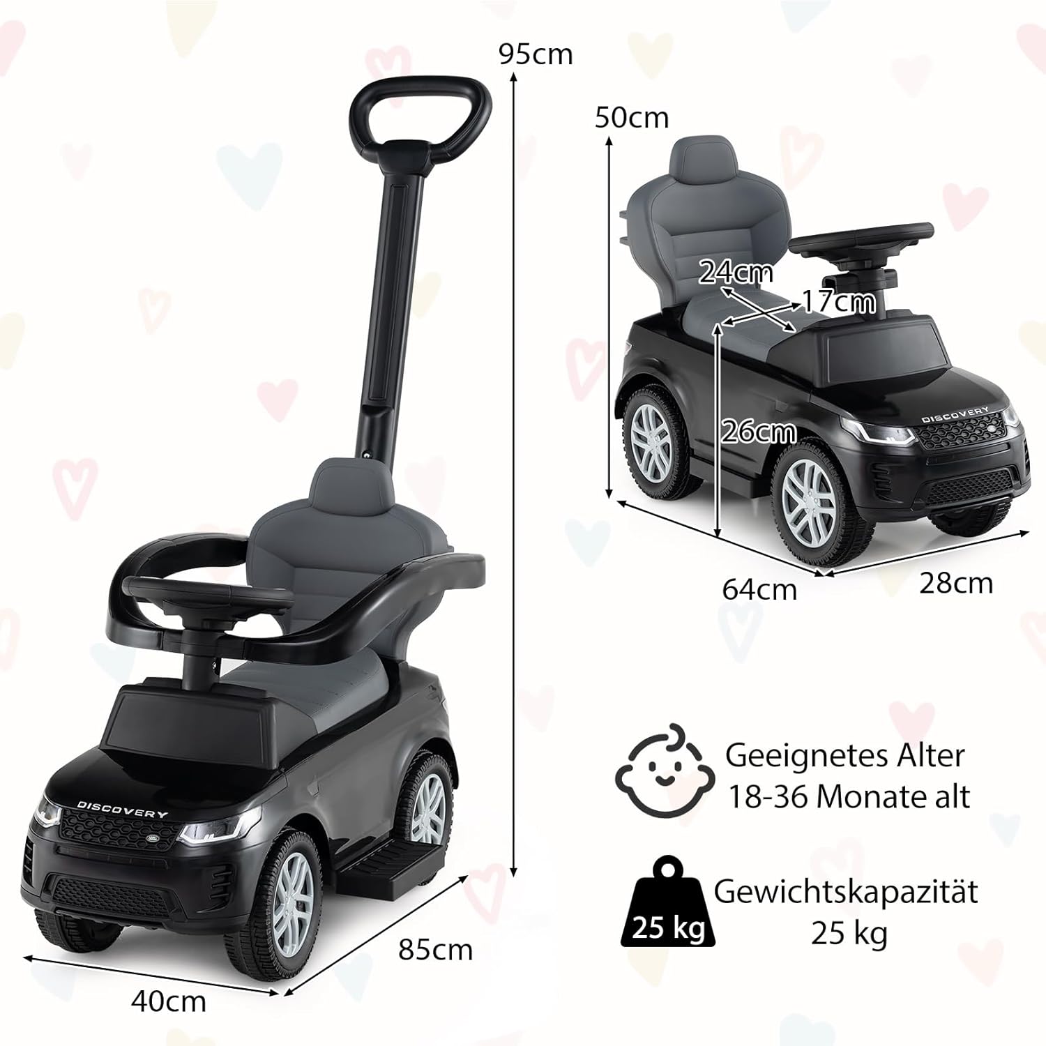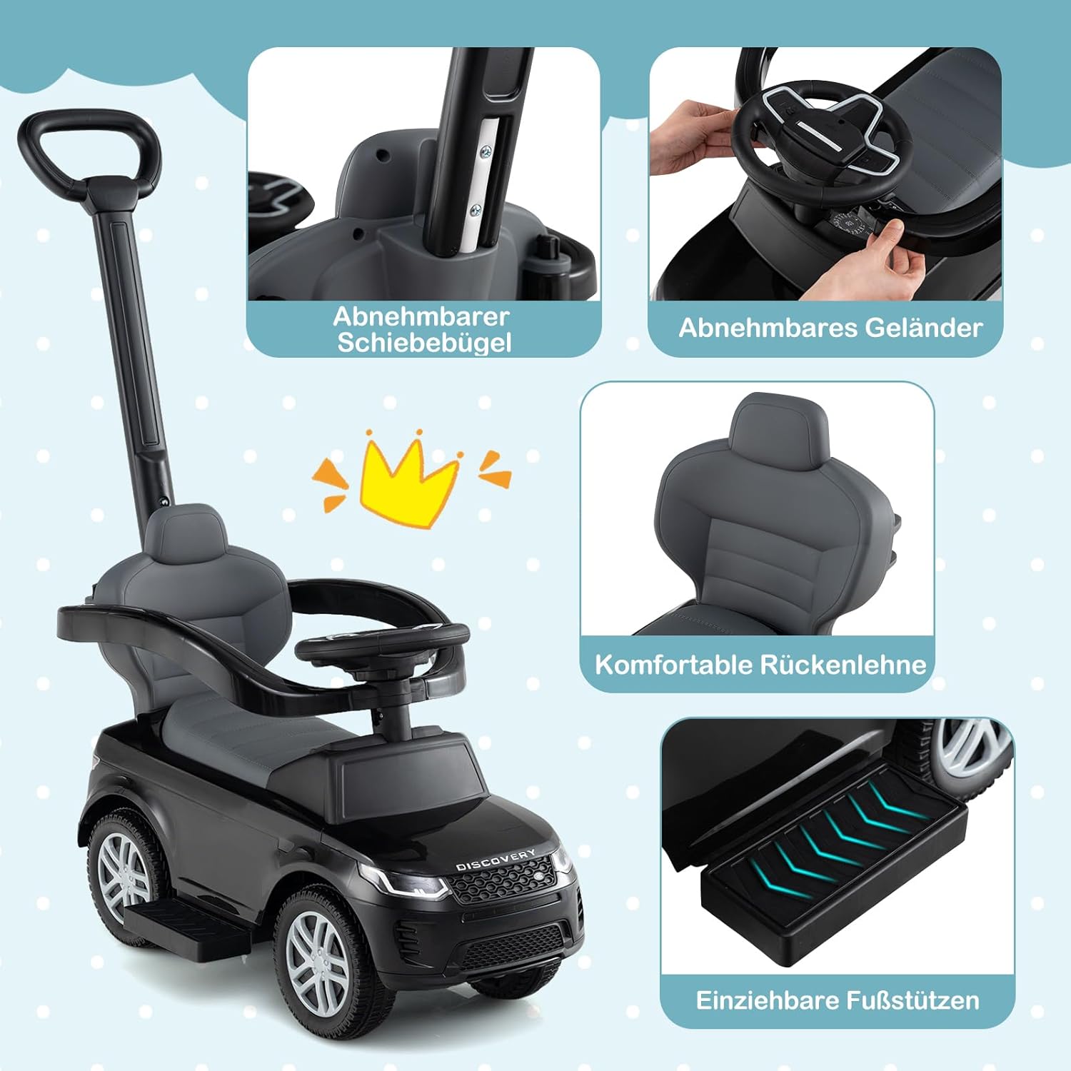 Modello flessibile 3 in 1: l'auto a spinta multifunzionale può essere dotata di una barra di spinta e di una barra di sicurezza per diventare un'auto a spinta. Senza la barra di spinta, diventa un passeggino che rende divertente la guida, impara a camminare e i bambini più grandi possono controllare liberamente da soli la macchina a spinta. Design accurato: il sedile di questa macchina da corsa è rimovibile e lo spazio nascosto sotto il sedile può riporre i giocattoli preferiti di tuo figlio e mettere di nuovo in ordine la stanza. Inoltre, il poggiapiedi retrattile aiuta i bambini piccoli a salire e scendere più comodamente dall'auto per bambini. Vera esperienza di guida: l'auto per bambini richiede 2 batterie AA da 1,5 V (non incluse) nel volante, in modo che il piccolo guidatore possa godersi il clacson e avviare gli effetti sonori mentre è in movimento. Con un dashboard chiaro, grafica del lettore musicale e percorsi di navigazione pianificati, può iniziare il divertimento della guida reale. La sicurezza è la massima priorità: la sicurezza viene prima di tutto. La barra di spinta dell'auto a spinta controlla la direzione di rotazione in modalità auto a spinta per garantire la sicurezza. La protezione antiribaltamento impedisce inoltre che l'auto per bambini si ribalti all'indietro durante la guida. Buon compagno per i bambini - Il veicolo da cavalcare per bambini dai 12 ai 36 mesi può sostenere fino a 25 kg, il che offre al tuo bambino un divertimento senza fine e rafforza la forza delle sue gambe quando fa scorrere l'auto per bambini: il giocattolo perfetto per uso interno o esterno.