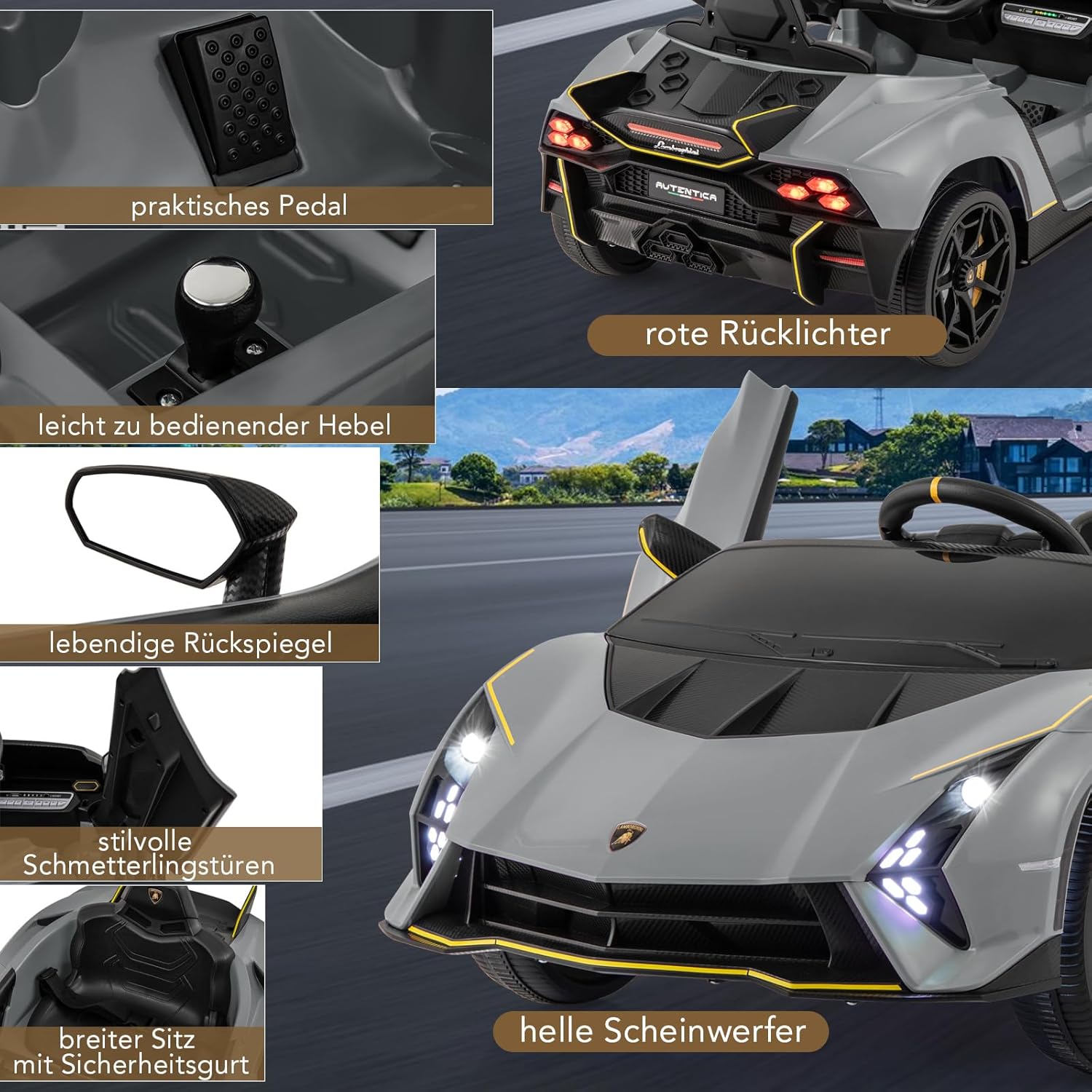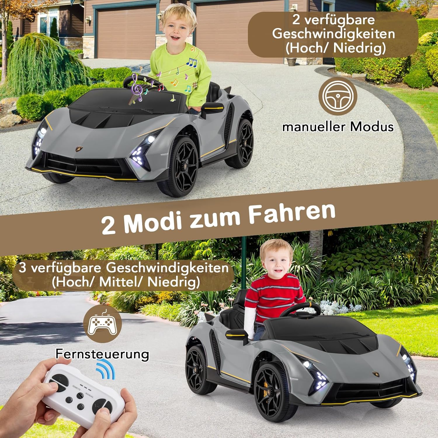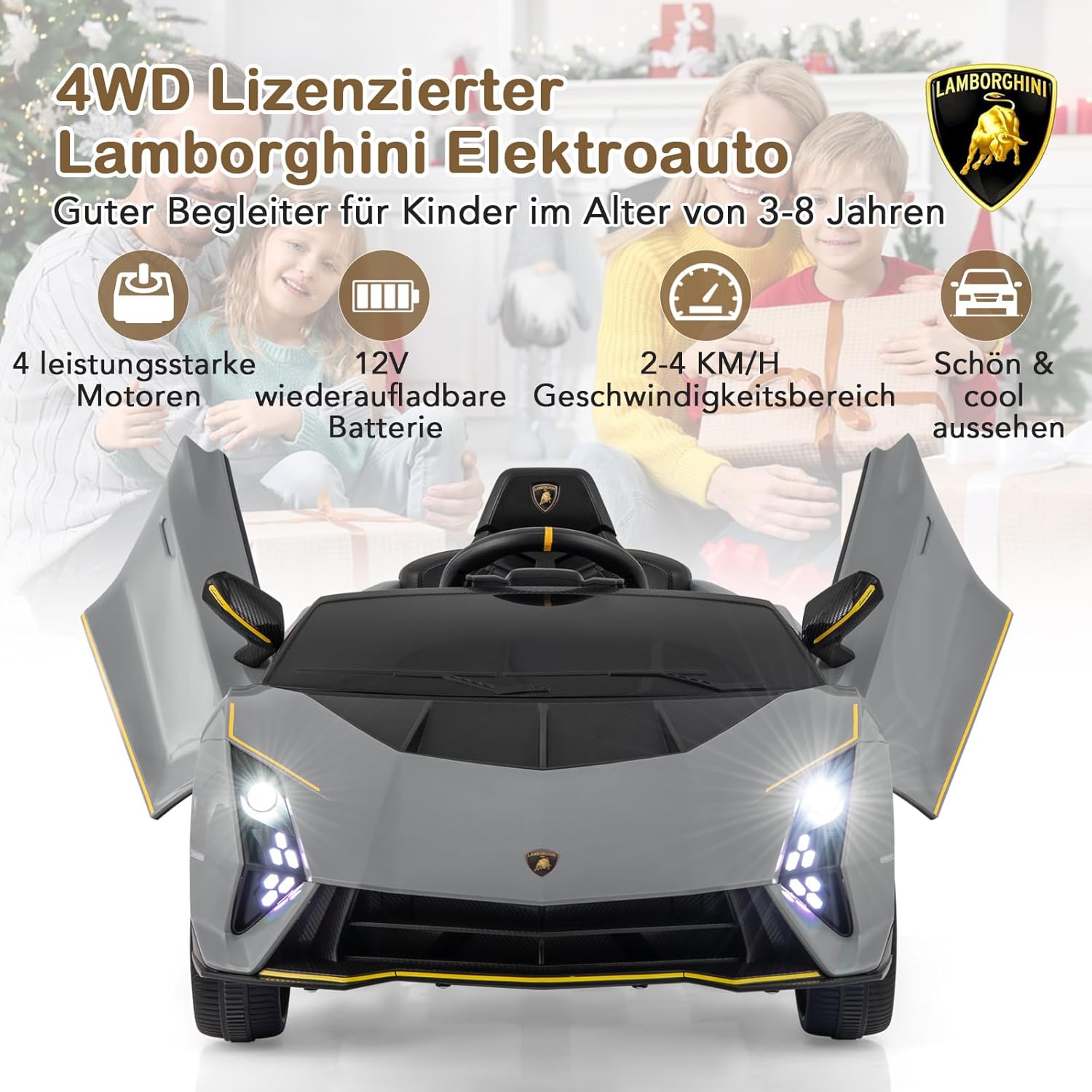Eccellente design Lamborghini: questa auto per bambini replica l'emozione di una vera auto con il suo design autentico con linee eleganti, porte idrauliche, spoiler accattivante e fari a LED, offrendo un'esperienza di guida coinvolgente per il tuo bambino. Modalità a doppio controllo: i genitori possono guidare in sicurezza il proprio bambino con un telecomando a 2 velocità, mentre i giovani conducenti possono utilizzare l'auto in modo indipendente utilizzando i pedali e i pulsanti, con 3 velocità tra cui scegliere. L'emozionante modalità swing aggiunge ulteriore divertimento. Funzionalità di intrattenimento - Questa auto elettrica per bambini è dotata di connettività wireless e porta USB in modo che i bambini possano ascoltare la loro musica preferita e la radio FM mentre guidano la loro auto sportiva. Queste funzionalità migliorano l'esperienza di guida e rendono il gioco più interattivo e divertente. Guida fluida e sicura: questa auto elettrica per bambini è alimentata da una batteria da 12 V e dispone di una trazione integrale sospesa con 4 ruote resistenti. La funzione di avvio lento garantisce un viaggio sicuro e l'ampio sedile con cintura di sicurezza offre ulteriore comfort e sicurezza. Buon compagno per i bambini: questa auto con licenza Lamborghini è realizzata in materiale PP adatto ai bambini e offre un divertimento duraturo. Questo giocattolo promuove le capacità motorie e il legame genitore-figlio, perfetto per ragazzi e ragazze dai 3 agli 8 anni.