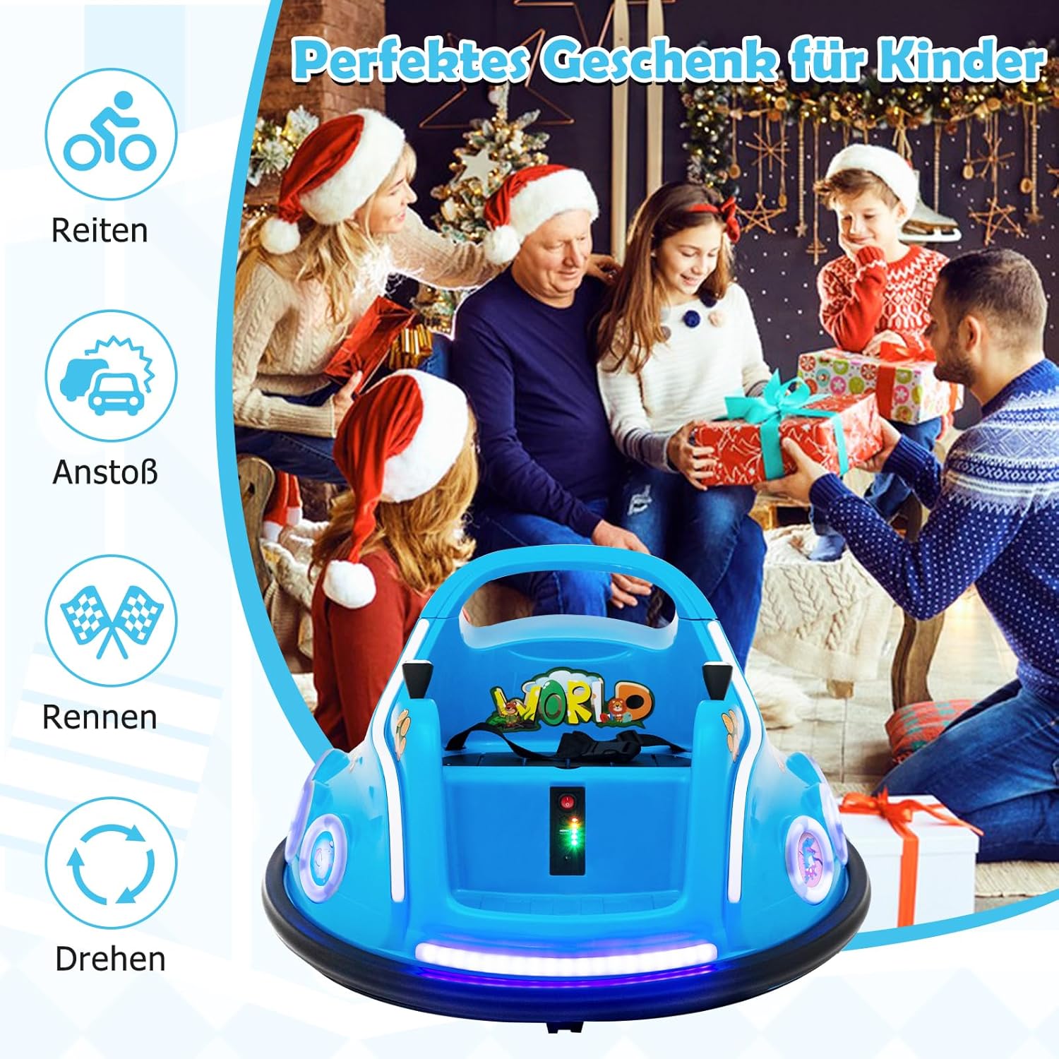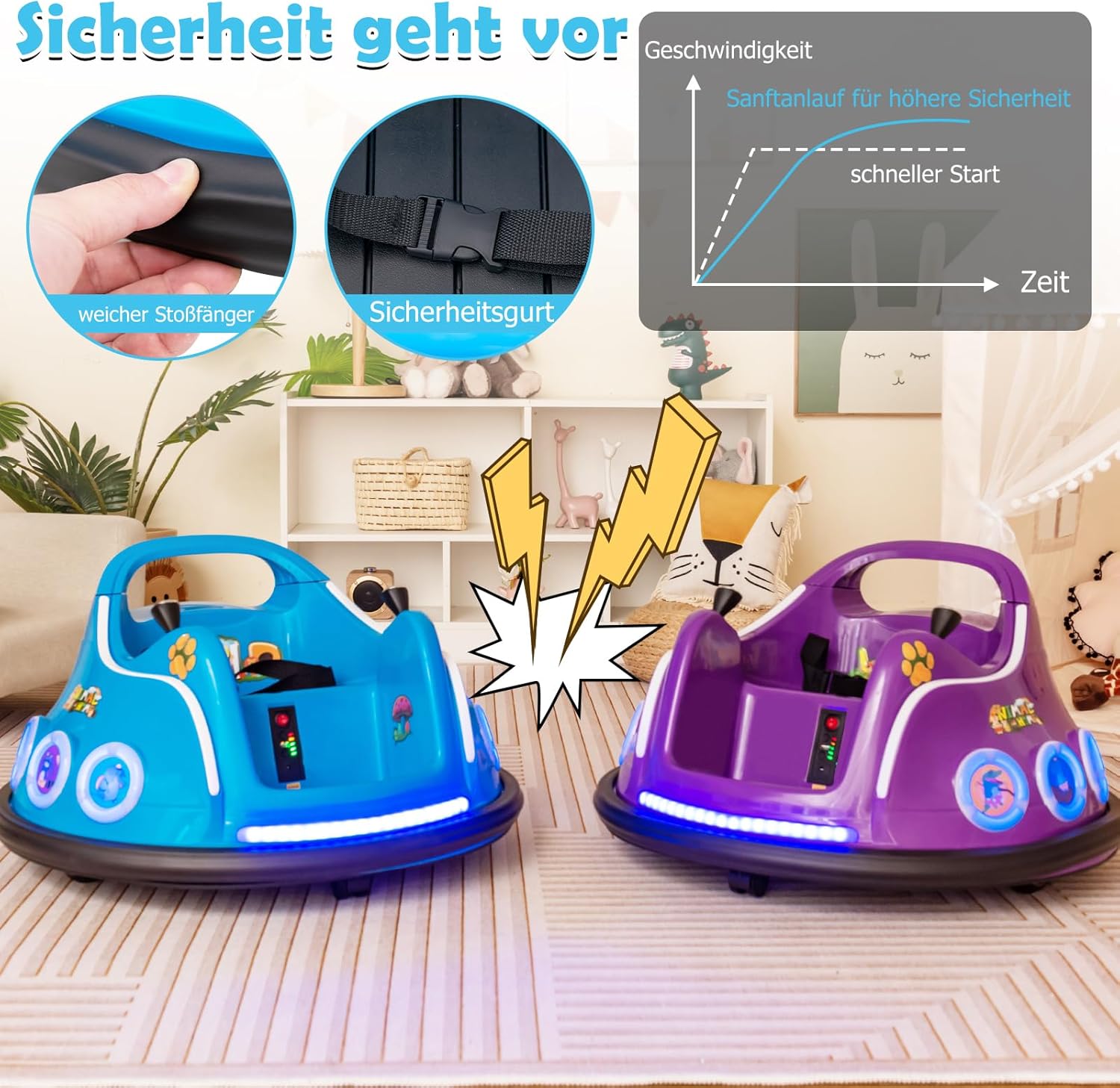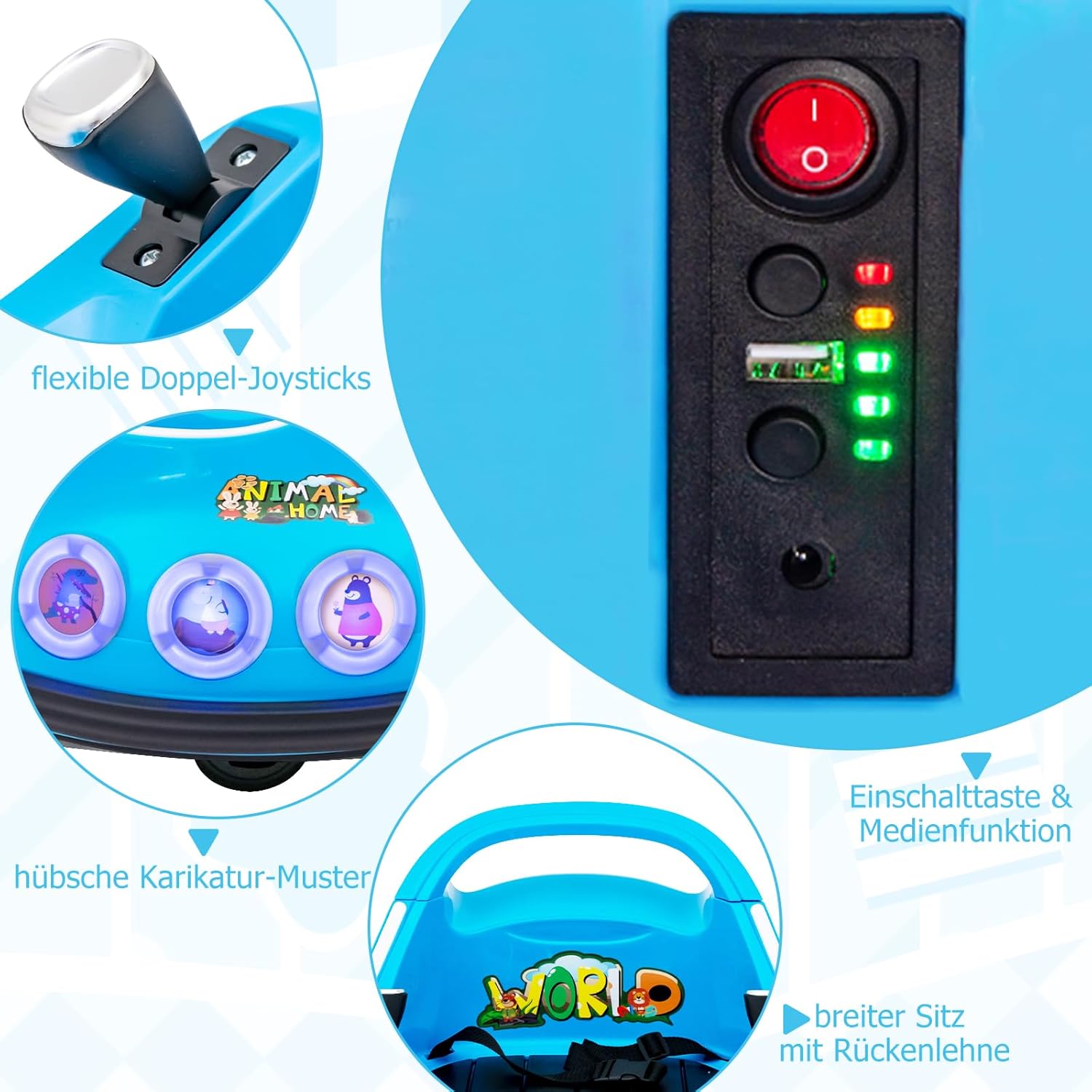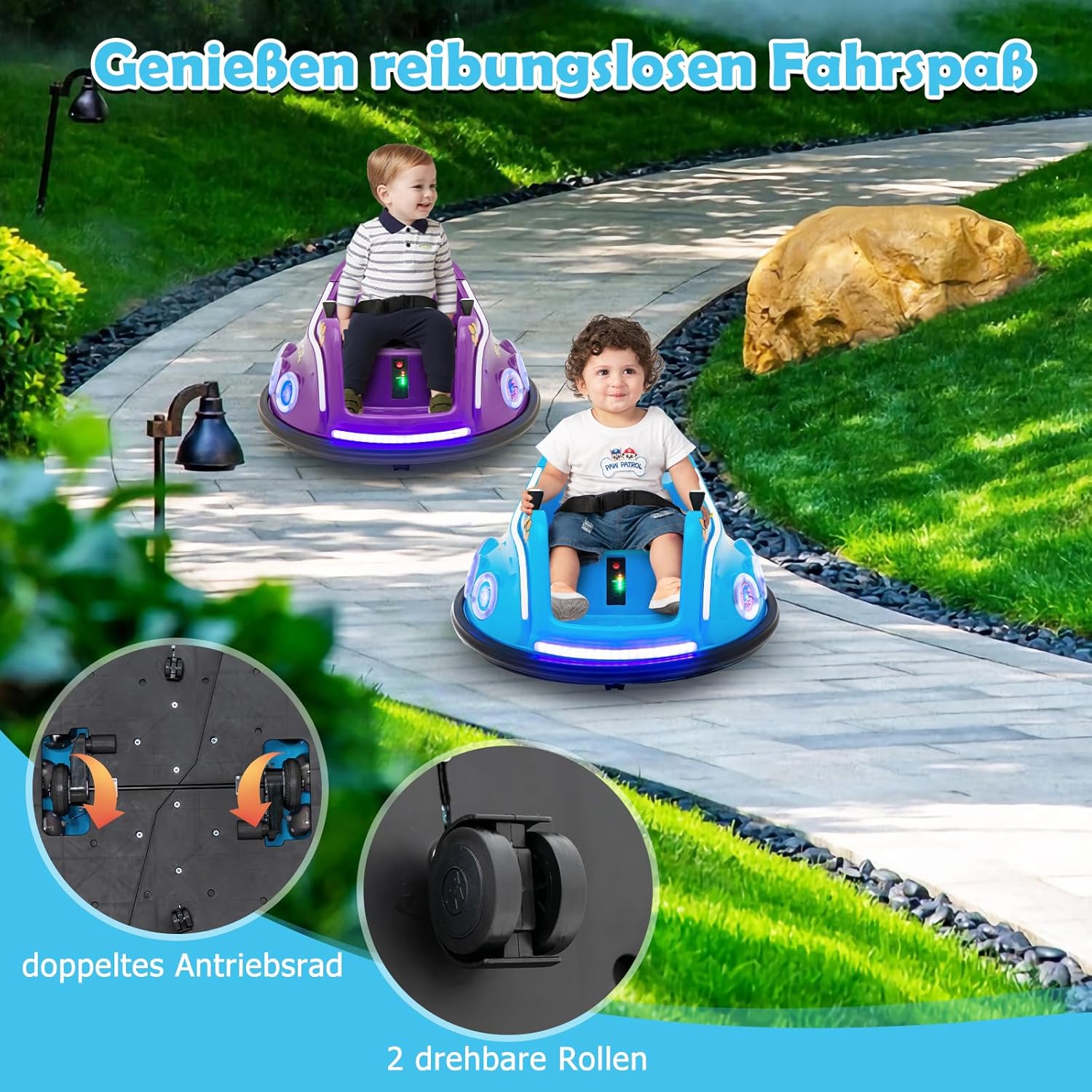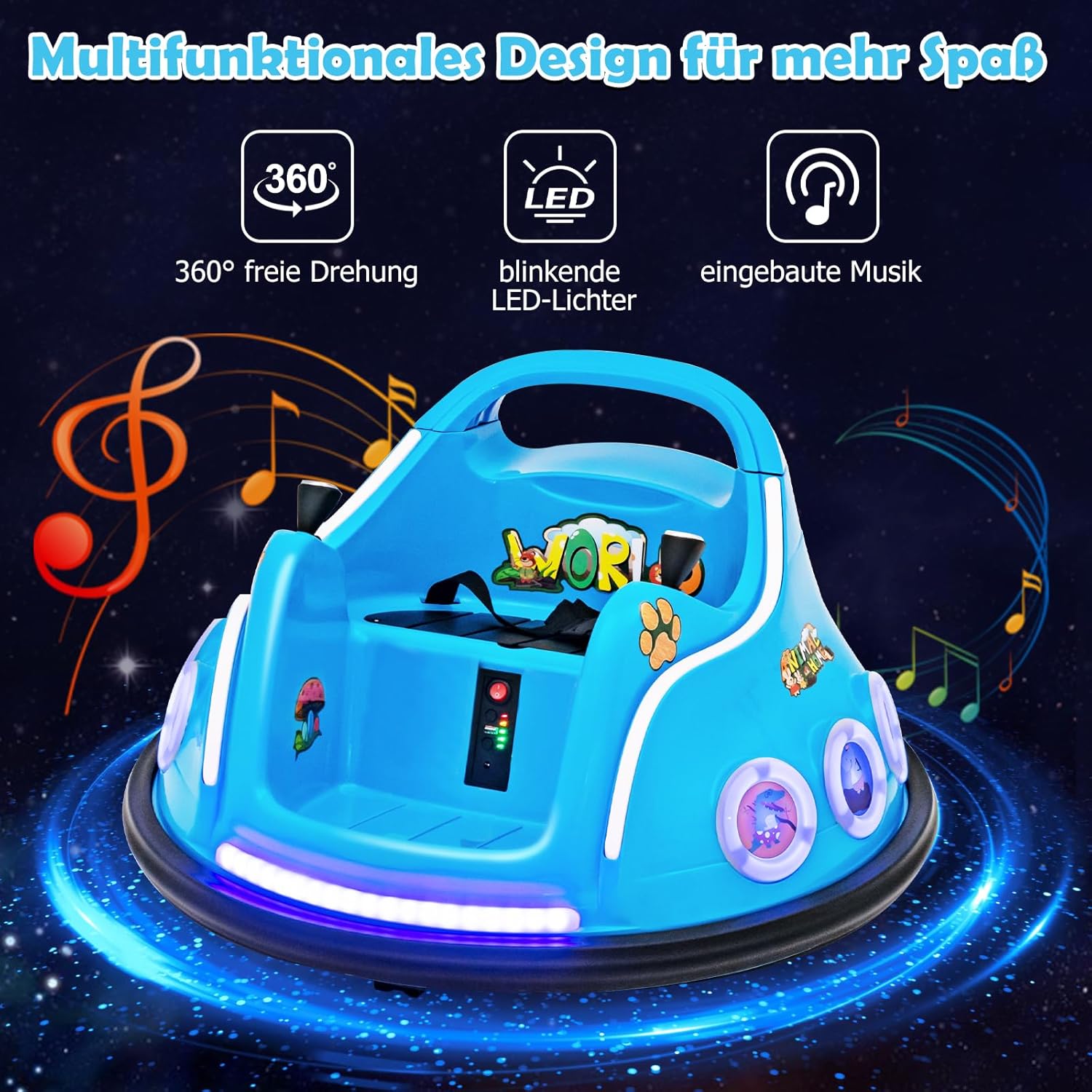 2 modalità di guida - Con l'aiuto dei doppi joystick flessibili, il tuo bambino può guidare autonomamente questo autoscontro elettrico. I genitori possono anche utilizzare la modalità solo telecomando per controllare la direzione e regolare la velocità per i bambini più piccoli. Rotazione di 360° e luci LED lampeggianti - Questa macchinina per bambini può essere ruotata di 360 gradi per facilitare i cambi di direzione. Due ruote motrici e 2 rotelle piroettanti consentono ai bambini di divertirsi alla guida senza problemi. Inoltre, le luci a LED sulle luci anteriori e laterali offrono una fantastica sensazione arcade. La sicurezza prima di tutto: questo autoscontro cavalcabile è dotato di una cintura di sicurezza per garantire una guida sicura. Il morbido paraurti protegge le pareti e i mobili e mantiene il tuo bambino al sicuro e protetto. Inoltre, il nostro autoscontro è dotato di una funzione di avvio graduale che evita il potenziale pericolo di un avvio rapido. Motore potente: questa auto elettrica è dotata di una batteria da 6 V 4,5 Ah che fornisce fino a 1 ora di riproduzione continua. Con una velocità massima di 2 km/h, i bambini possono divertirsi alla guida. Inoltre, il design ad avvio lento evita accelerazioni improvvise. Buona scelta per i bambini: questa autoscontro è progettata con adorabili motivi a fumetti amati dai bambini. I bambini possono guidare questa macchina per correre, girare e sobbalzare per divertirsi ancora di più.