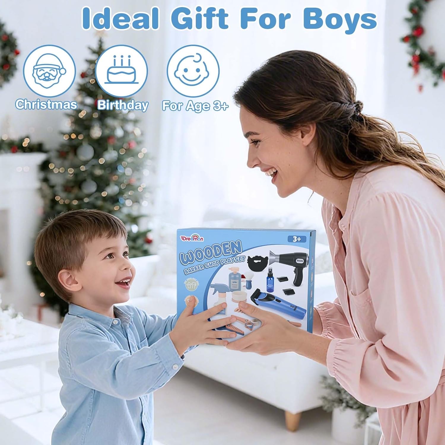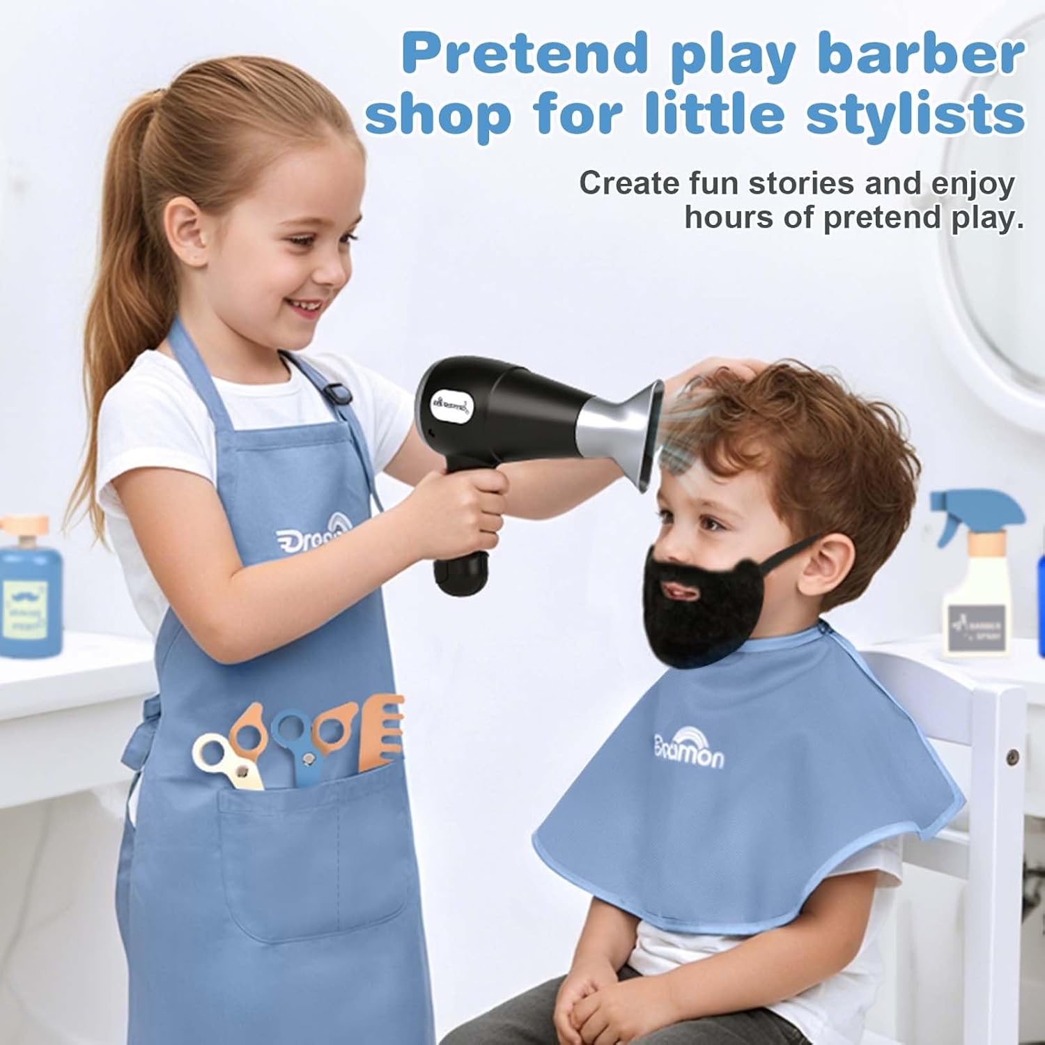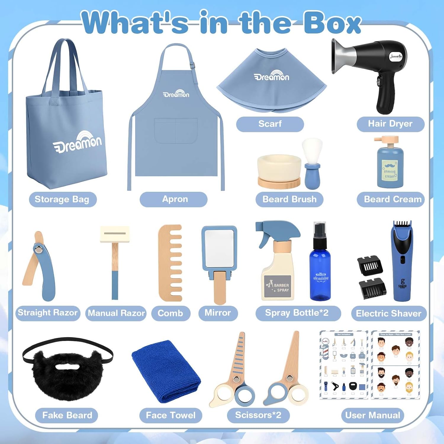 [Set da Barbiere Realistico e Divertente per Bambini] Questo set da barbiere per bambini include 21 accessori: grembiule, sciarpa, borsa, rasoio manuale, rasoio elettrico, due tipi di forbici, crema da barba, spazzola per barba, asciugacapelli, pettine, spruzzatori, specchio, barba finta, asciugamano per il viso e altro ancora. Realizzato in legno e plastica per un effetto realistico e di alta qualità. [Set da Parrucchiere con Effetti Realistici] L’asciugacapelli emette suoni e luci realistici, mentre il rasoio vibra per simulare una vera rasatura. I bambini possono indossare la barba finta e usare gli strumenti per imitare la routine di papà, vivendo un gioco di ruolo divertente e realistico. (Nota: richiede 2 batterie AAA, non incluse.) [Gioco Immaginativo e Sviluppo delle Abilità] Stimola la creatività, la coordinazione e la fiducia in sé. Questo set incoraggia il gioco di ruolo e migliora le abilità motorie fini e sociali, ideale per giocare da soli o con gli amici. [Sicuro, Resistente e Facile da Riporre] Realizzato con materiali lisci e sicuri per i bambini, senza bordi taglienti. Le parti in legno e plastica garantiscono una lunga durata. Include una pratica borsa per riporre e trasportare facilmente tutti gli accessori. [Regalo Perfetto per Bambini e Bambine dai 3 Anni in Su] Confezionato in una scatola regalo di alta qualità, è perfetto per compleanni, Natale o altre occasioni. Ideale per il gioco creativo a casa o a scuola, per bambini dai 3 ai 6 anni.