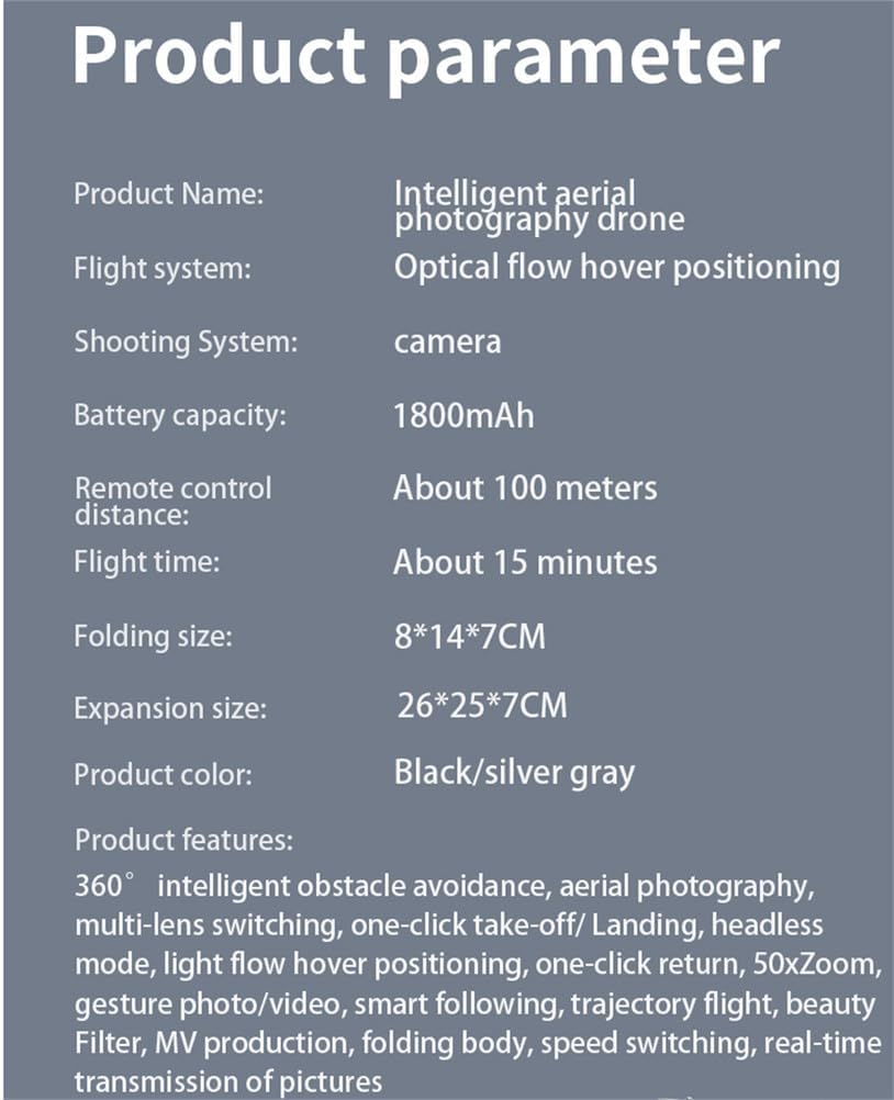 Motore brushless, batteria ad alta tensione a lunga durata, evitamento degli ostacoli su tutti i lati, funzione di evitamento degli ostacoli di sollevamento, funzione di visione notturna, congelamento della luce. Funzione di controllo remoto: decollo con un tasto/atterraggio con un tasto/salita/discesa/sterzo sinistro/destro/rollio a 360°/modalità senza testa/marcia veloce e lenta/ripristino con un solo tasto/regolazione fine della direzione/congelamento della luce/sollevamento della testa per evitare gli ostacoli. Decollo con un tasto/atterraggio con un tasto/salita/discesa/sterzo a sinistra/destra/. Rollio a 360 ° / modalità senza testa / veloce / lento / foto / video / interruttore doppia fotocamera / riconoscimento facciale foto automatica / rilevamento della gravità / volo traiettoria /.