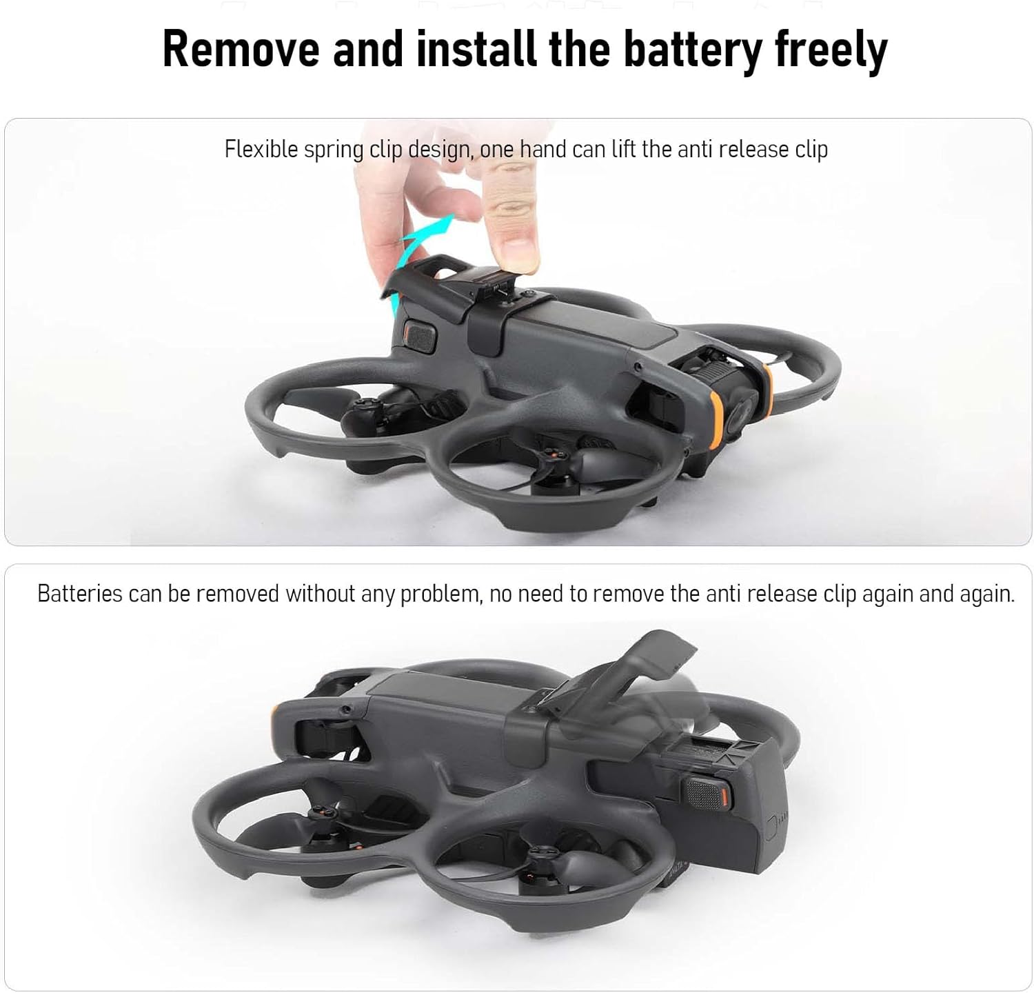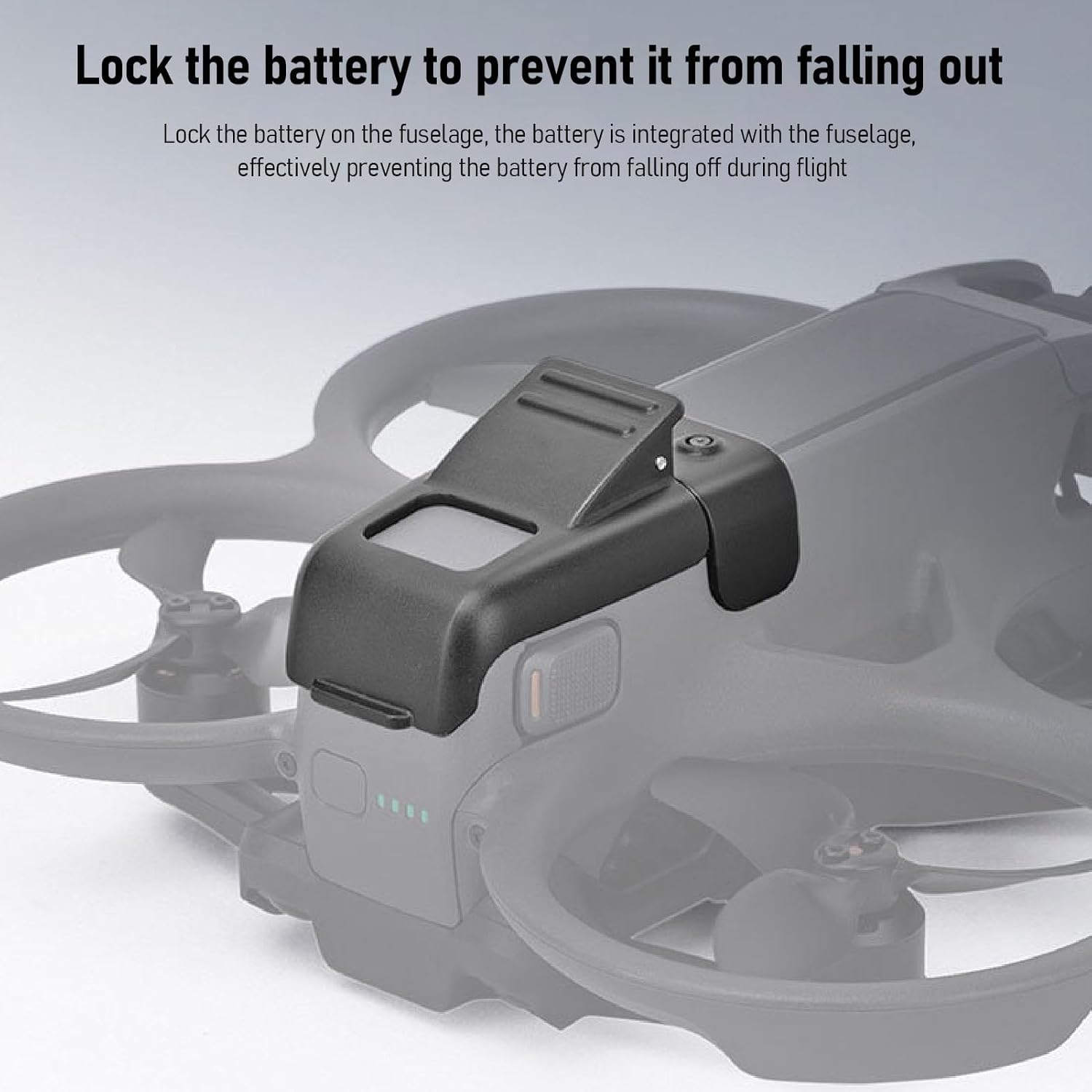 [Precise Fit] Specifically designed for Avata 2 drones, ensuring a secure fit without interfering with drone functionality. [Durable Plastic] Premium plastic construction with a flexible spring clip design for long-lasting durability. [Secure Locking] Locks the battery in place to prevent accidental detachment during flights, providing stability and reliability. [Unobstructed Access] Allows easy access to power switch and battery status display, enabling seamless battery installation and removal. [Convenient Storage] Easy to install and store, neatly fits in the drone's carrying case for simple transportation.