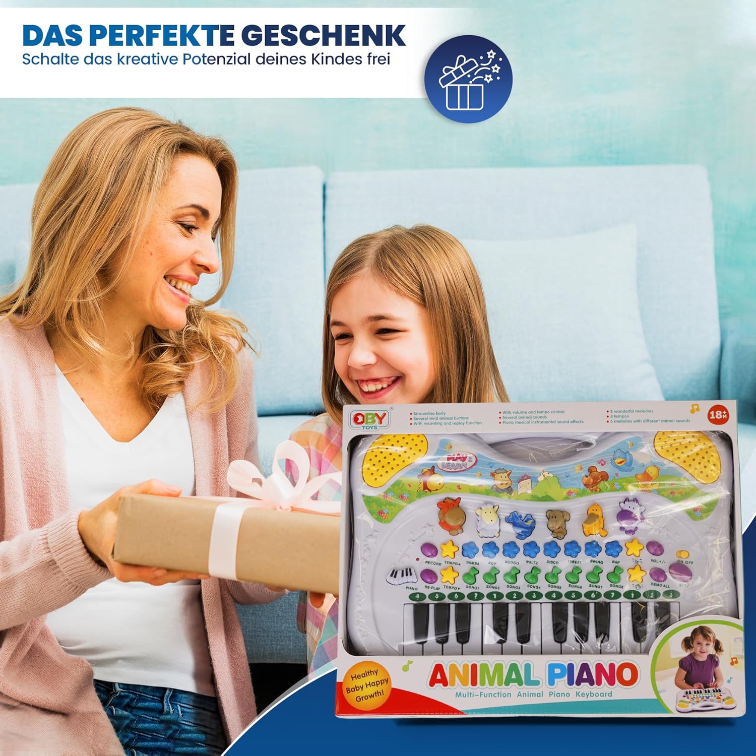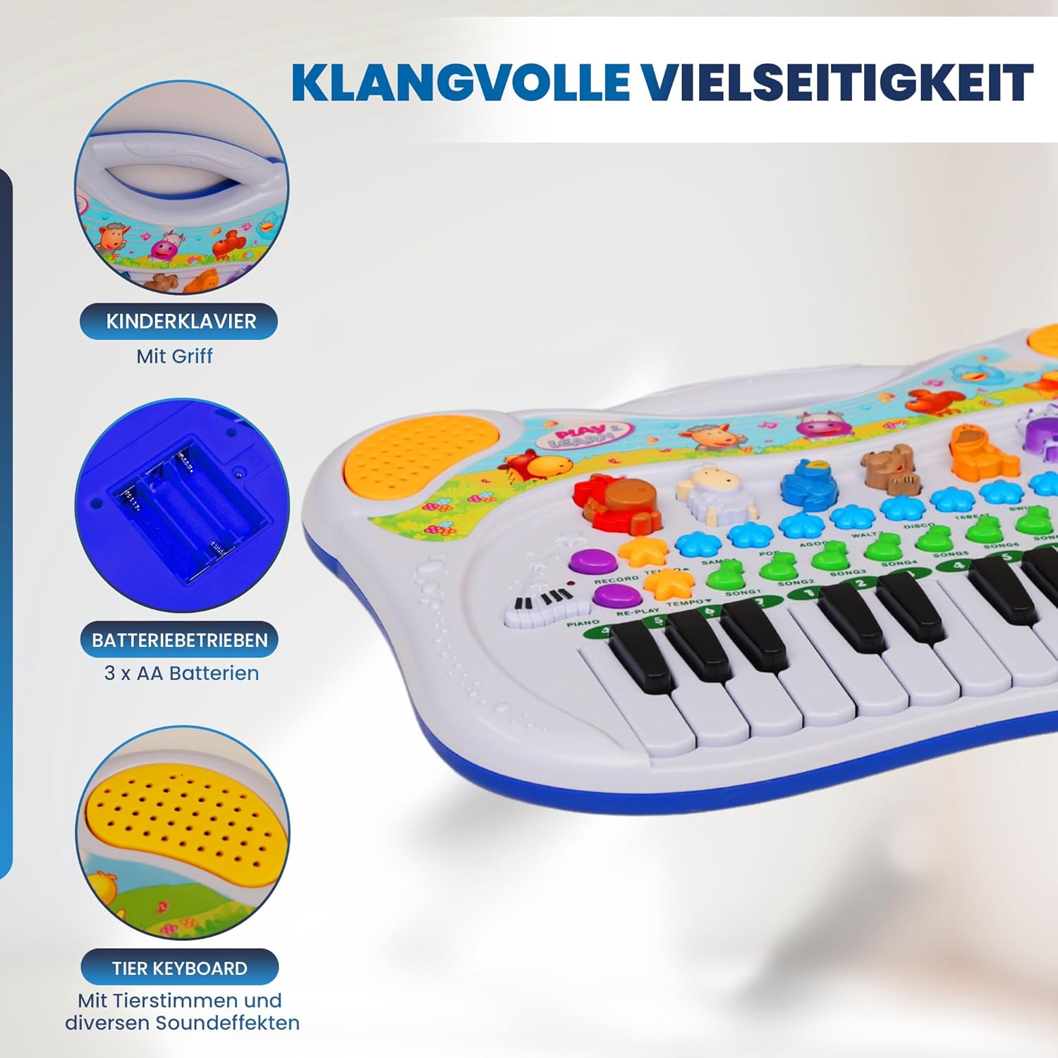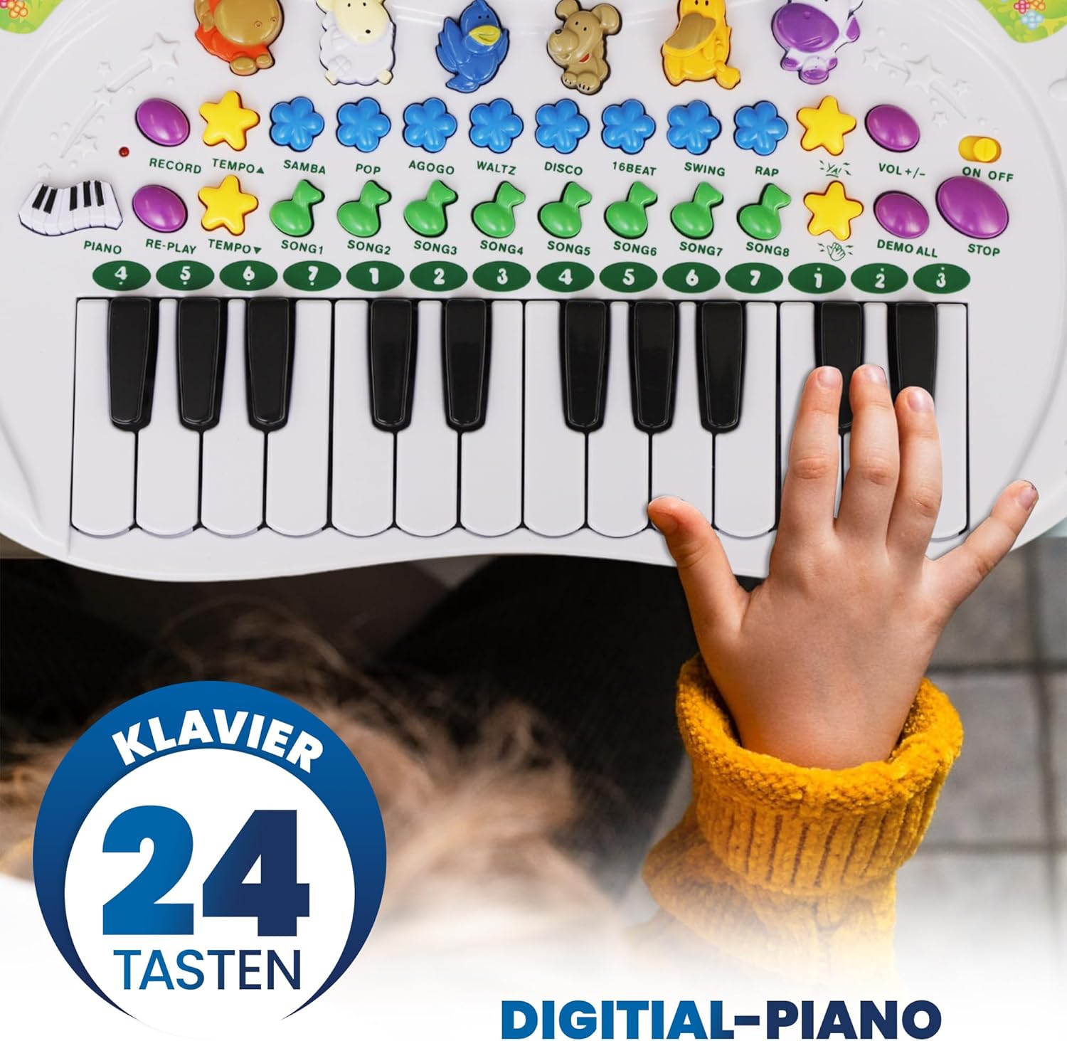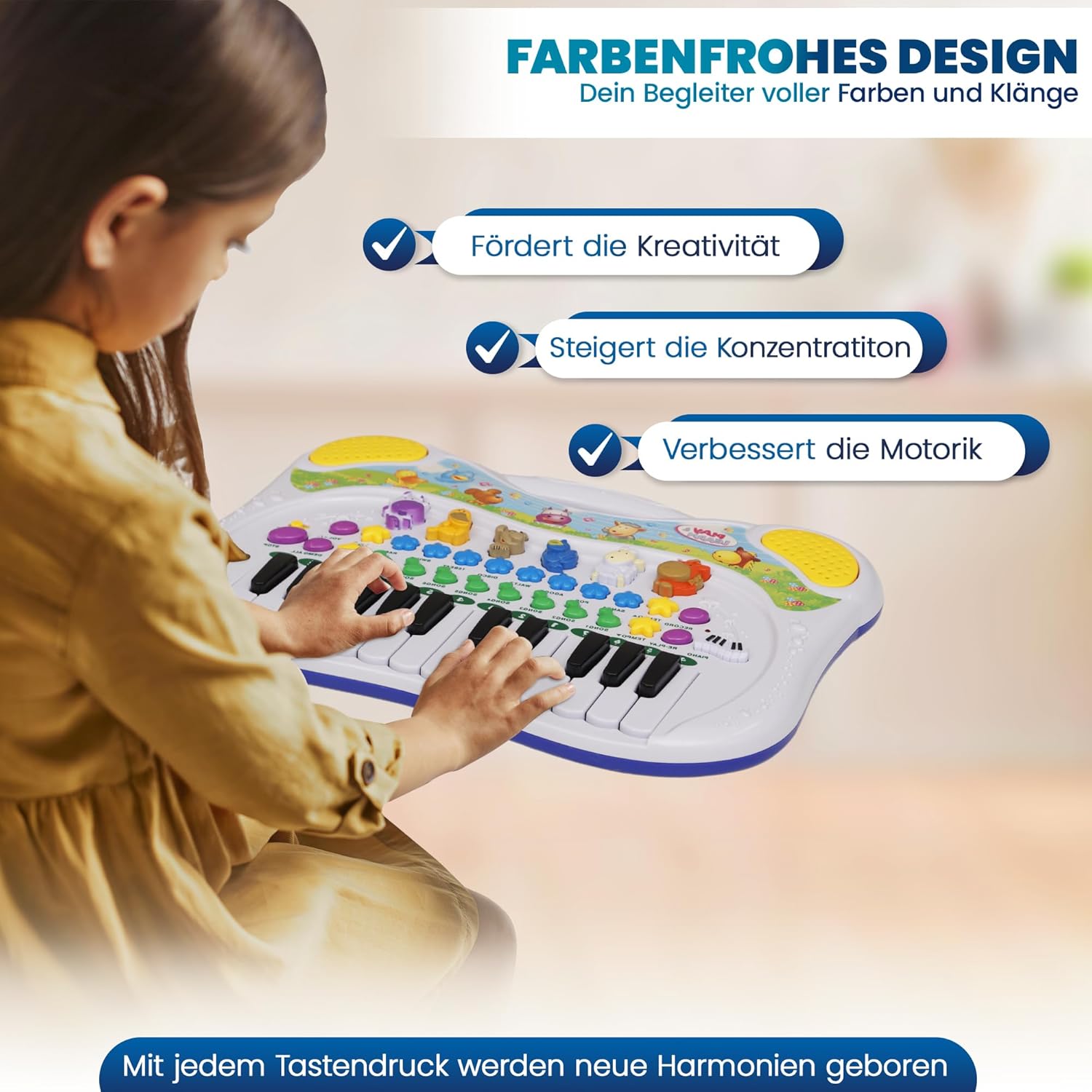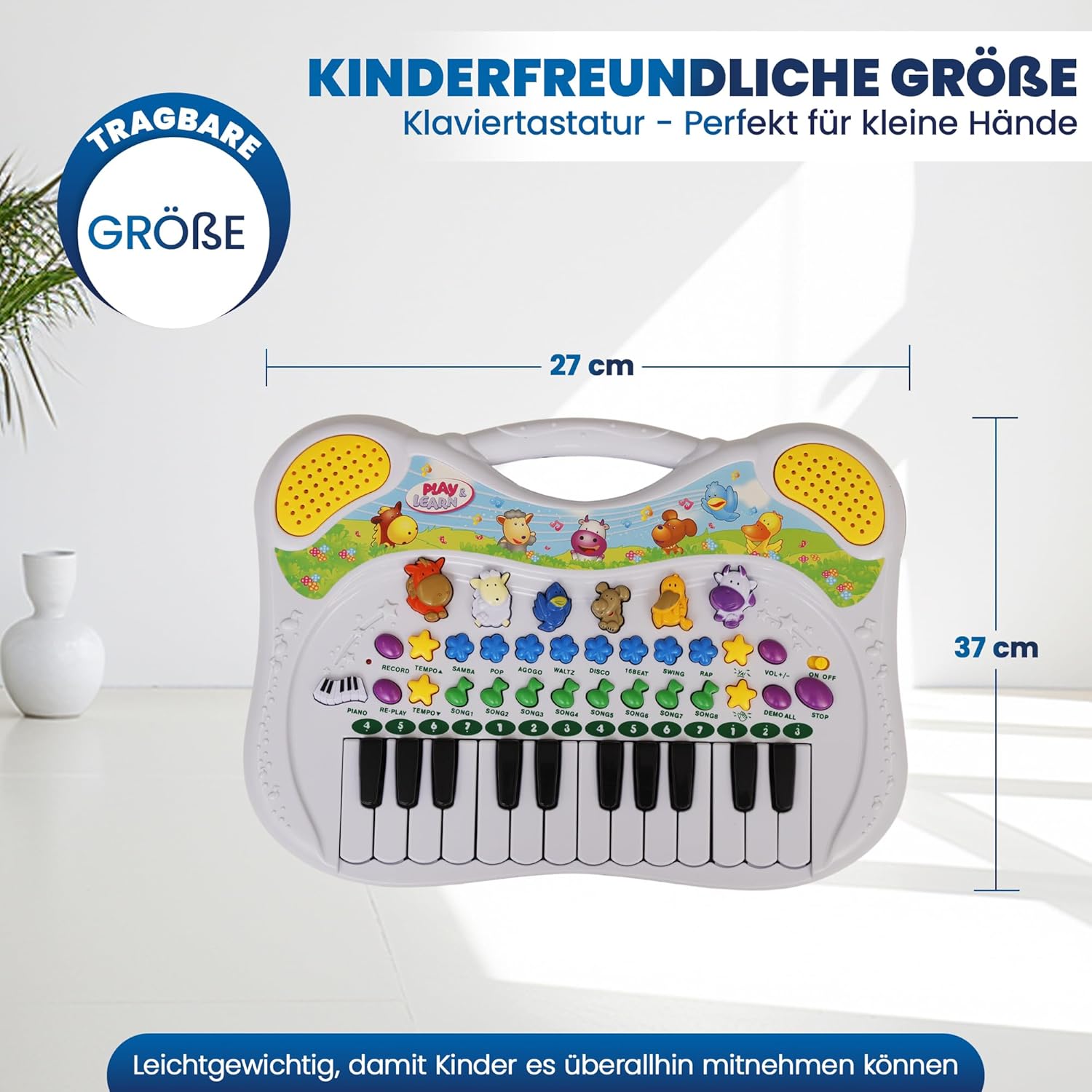 🐾 𝗞𝗥𝗘𝗔𝗧𝗜𝗩𝗘𝗥 𝗠𝗨𝗦𝗜𝗞𝗦𝗣𝗔SS 𝗙Ü𝗥 𝗞𝗜𝗡𝗗𝗘𝗥: L'animale DRULINE La tastiera combina 24 tasti, 6 divertenti versi di animali, 8 ritmi emozionanti (ad esempio samba, valzer, discoteca) e 8 melodie orecchiabili. Perfetto per scoprire il mondo della musica in modo giocoso e promuovere la creatività. 🎶 𝗘𝗜𝗚𝗘𝗡𝗘 𝗠𝗨𝗦𝗜𝗞 𝗞𝗥𝗘𝗜𝗘𝗥𝗘𝗡 & 𝗪𝗜𝗘𝗗𝗘𝗥𝗚𝗘𝗕𝗘𝗡: Con la funzione di registrazione e riproduzione, i bambini possono registrare fino a 30 note e riprodurle in qualsiasi momento. Il funzionamento semplice e l'indicatore luminoso di registrazione rendono la composizione e la riproduzione delle tue melodie un gioco da ragazzi. 🐶 𝗟𝗨𝗦𝗧𝗜𝗚𝗘 𝗧𝗜𝗘𝗥𝗦𝗧𝗜𝗠𝗠𝗘𝗡 & 𝗠𝗘𝗟𝗢𝗗𝗜𝗘𝗡: Alla spinta premendo un pulsante riproduci 6 versi di animali e 14 melodie, tra cui 8 canzoni per bambini e 6 accompagnamenti di animali. I bambini imparano a gestire il ritmo, le altezze e gli stili musicali in modo giocoso. 🎹 Facile da usare: il pianoforte digitale multifunzionale per bambini supporta lo sviluppo del senso del ritmo e del talento musicale. Grazie al volume, ai toni regolabili e al design robusto, è un compagno duraturo per i piccoli musicisti. 🎁 𝗜𝗗𝗘𝗔𝗟𝗘𝗦 𝗚𝗘𝗦𝗖𝗛𝗘𝗡𝗞 𝗙Ü𝗥 𝗞𝗟𝗘𝗜𝗡𝗘 𝗠𝗨𝗦𝗜𝗞𝗘𝗥: Questo giocattolo musicale è il regalo perfetto per compleanni o vacanze. Dimensioni: 37 x 27 cm, materiale: plastica, richiede 3 batterie AA (batterie Try-Me incluse). Nota: non adatto a bambini di età inferiore a 12 mesi.