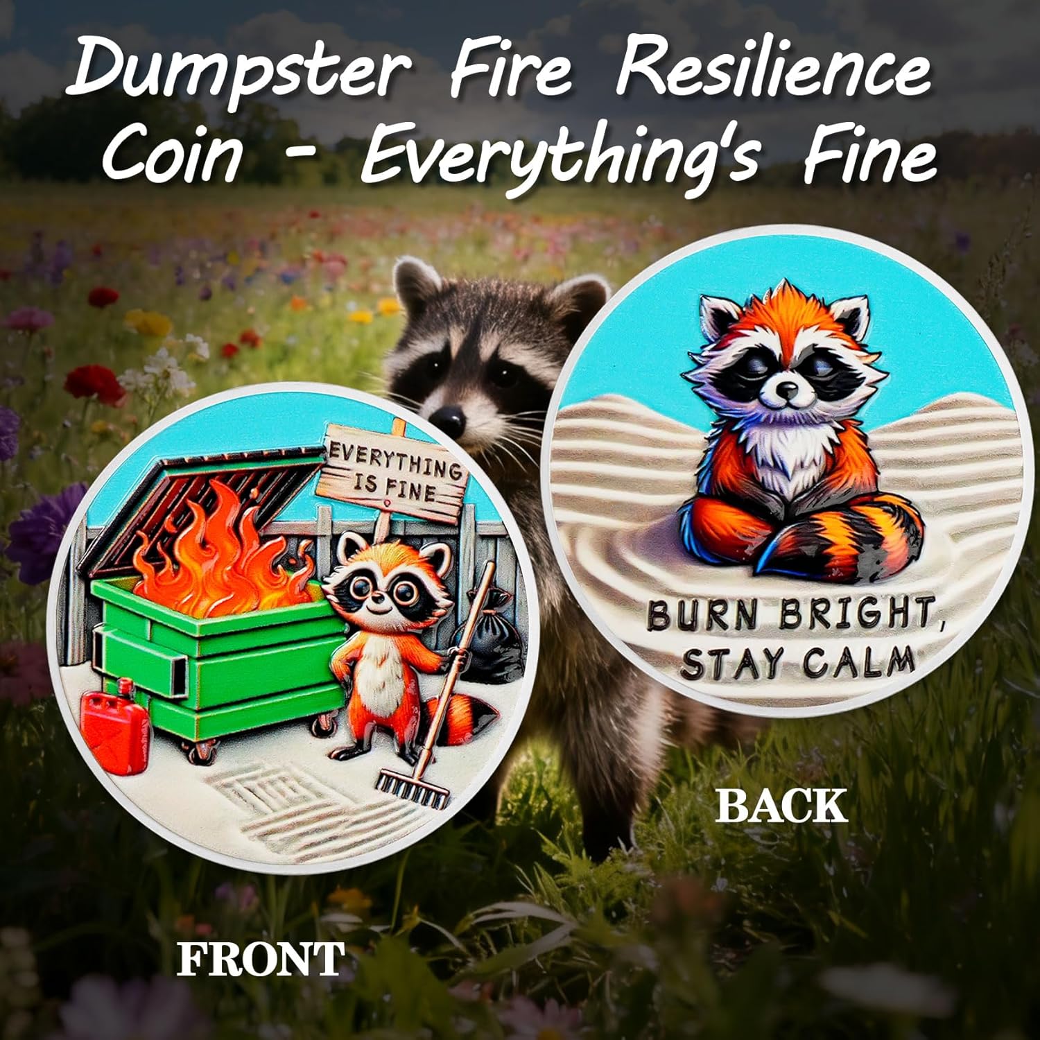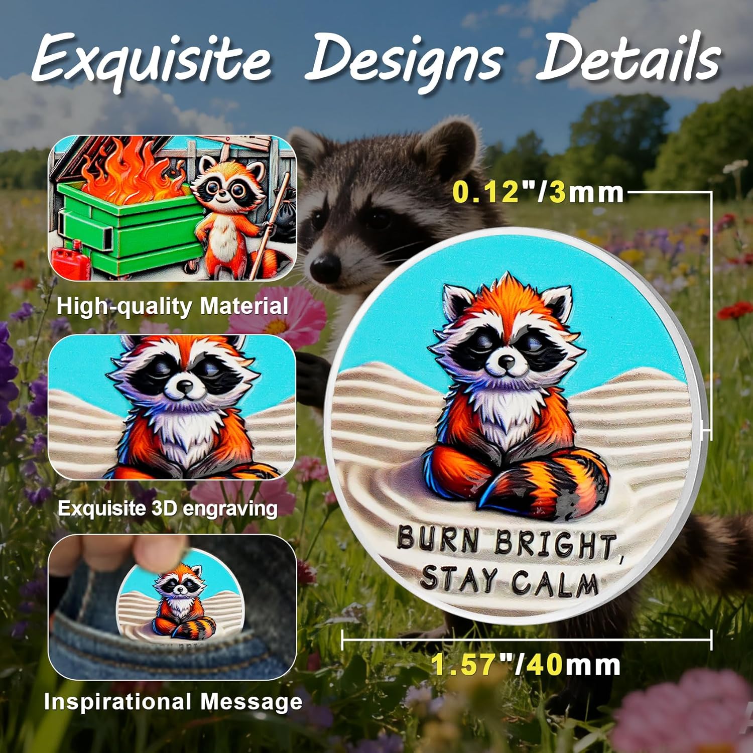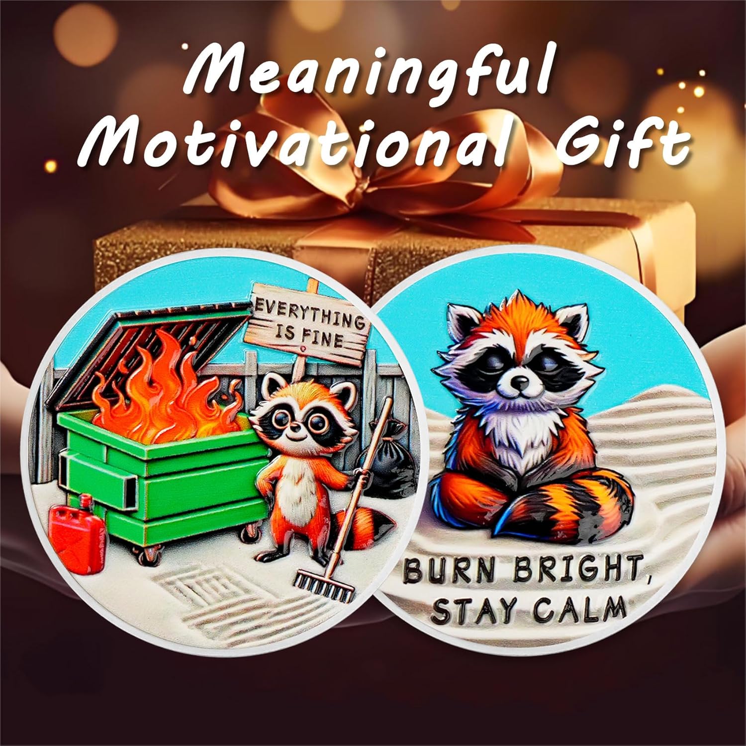 Raccoon Dumpster Fire Coin: La moneta del fuoco del cassonetto "Tutto va bene" riflette umoristicamente il caos e le sfide della vita. Incoraggiare chi lo indossa ad affrontare le incertezze della vita con un atteggiamento ottimista, ricordando loro che anche nei momenti peggiori, la forza può essere tradotta dalle avversità, diventando più forte e coraggiosa e continuando ad andare avanti Squisita lavorazione a doppia faccia: la parte anteriore presenta un procione che tiene un rastrello, accanto a un cassonetto verde acceso, parole "Everything is bene". Il rovescio raffigura un procione calmo con le parole "BURN BRIGHT, STAY CALM", trasmettendo il messaggio Anche di fronte al caos, dobbiamo mantenere un atteggiamento positivo, crescere attraverso le sfide e diventare più forti e più resilienti Artigianato di alta qualità e dimensioni ideali: realizzata in lega di zinco resistente, questa moneta antincendio è accuratamente realizzata con una finitura argento e intricati dettagli in rilievo 3D che danno vita a ogni elemento di design. La moneta motivazionale è di circa 40 mm di diametro e 3 mm di spessore, perfetta da tenere in tasca o in portafoglio, o appesa a un portachiavi per una facile visualizzazione. Ogni moneta viene fornita con una custodia protettiva trasparente di alta qualità Adatto per varie occasioni: perfetto per una varietà di occasioni, soprattutto quando si affrontano pressioni, sfide o avversità. È un regalo ideale per l'ufficio per aiutare i colleghi a rilassarsi ed è anche ottimo come regalo incoraggiante per amici o familiari che vivono lotte di vita o transizioni di carriera. Perfetto per chi ha senso dell'umorismo, appassionati di auto-miglioramento, imprenditori o anche come decorazione per ufficio e un ricordo per i vigili del fuoco Regalo umoristico ispiratore: la moneta forgiata nel fuoco è un regalo divertente e stimolante, perfetta per auto-motivazione, laurea, regali in ufficio o come regalo speciale e divertente. Incoraggiare le persone a rimanere tenaci nei momenti più difficili e tutti hanno il potenziale per coltivare la capacità di affrontare le sfide con facilità, diventare più forti, più resilienti e alla fine diventare un sé più forte