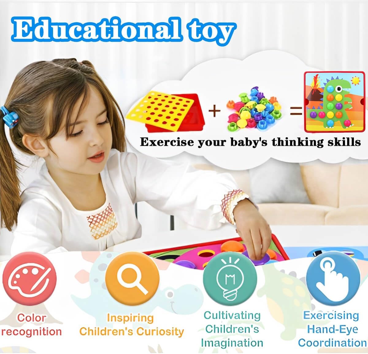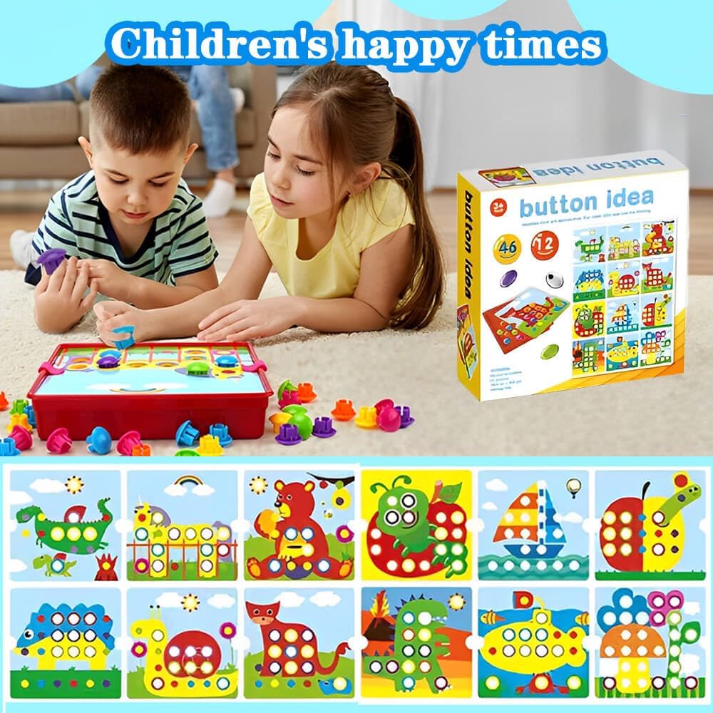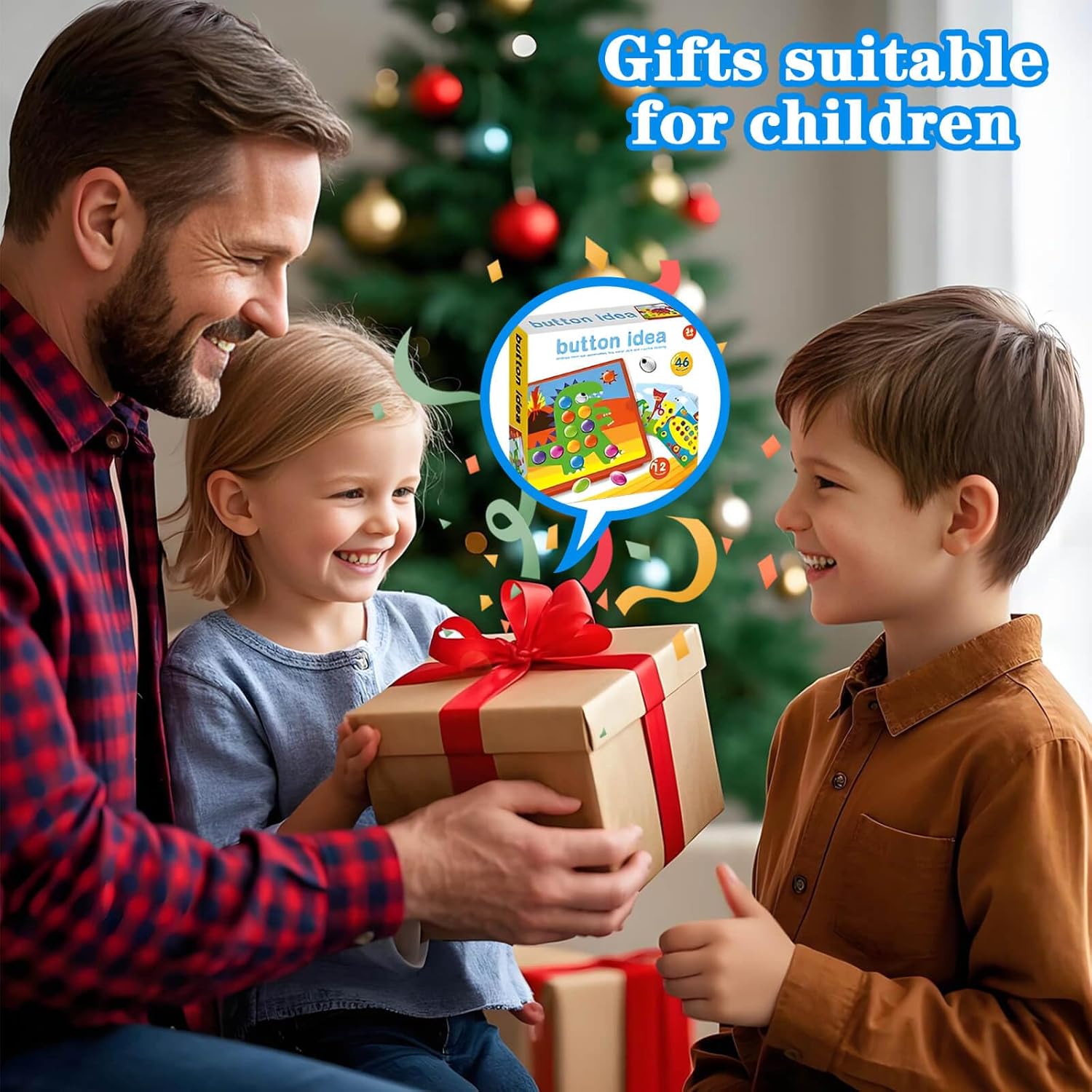 Divertimento creativo: Inizia abbinando e fissando i chiodi a forma di fungo alle carte illustrate con i motivi per completare l'immagine, poi passa a creare i tuoi disegni unici utilizzando solo il Mosaic Pegboard! Lascia che i tuoi bambini diano libero sfogo alla loro immaginazione! Giocattolo educativo per bambini: I bambini possono sviluppare la coordinazione occhio-mano e le capacità motorie fini attraverso il gioco, migliorare la concentrazione attraverso i giochi e divertirsi mentre imparano. Ottimo per i bambini per giocare con la famiglia e gli amici. Giocattoli per bambini di grande valore: I giochi per bambini includono 46 bottoni colorati, 12 carte con motivi diversi, 1 pannello e 1 vassoio di stoccaggio, dove riporre tutti i bottoni e le immagini al termine del gioco. Alta qualità: Realizzati in plastica ABS resistente, i bordi lisci e il design con angoli arrotondati proteggono la pelle delicata dei bambini per evitare graffi. I bottoni grandi sono facili da afferrare per le manine dei più piccoli. Regali per bambini di 2, 3 e 4 anni: Bambini e bambine possono divertirsi a creare motivi diversi con bottoni colorati e immagini. I giocattoli Button Art sono un regalo attraente per il compleanno, il Ringraziamento o il Natale dei più piccoli.