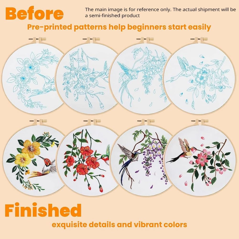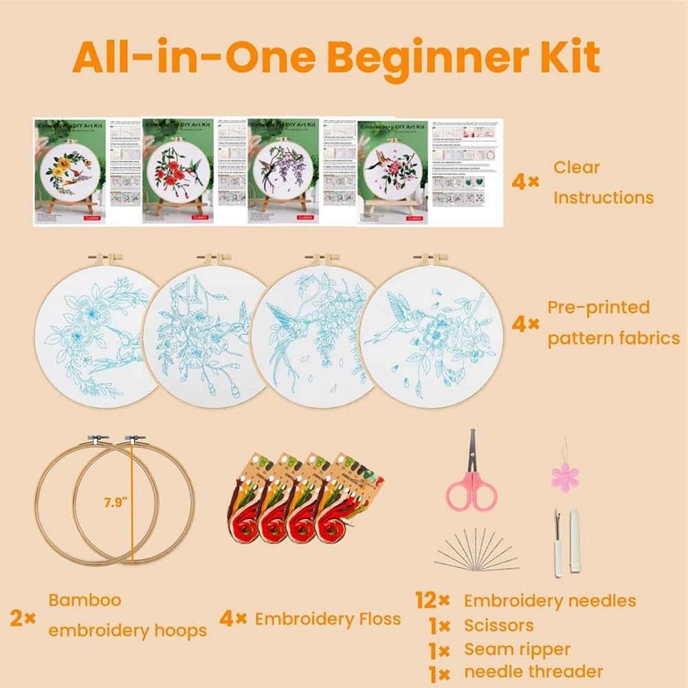 Design splendido e vivace: questo kit da ricamo presenta un bellissimo motivo floreale con dai colori vivaci. Una volta completato, il ricamo diventa un meraviglioso elemento che aggiunge fascino a qualsiasi . Un regalo premuroso per i propri cari: questo kit da ricamo è un regalo meraviglioso per figlie, mamme, nonne e amiche. È un ottimo modo per condividere momenti di qualità insieme, creando qualcosa di bello, perfetto per compleanni, festività o qualsiasi occasione speciale. Ideale per i principianti: inizia facilmente con questo kit da ricamo per principianti. Il disegno idrosolubile rende il ricamo semplice e divertente, anche per i principianti. Hobby rilassante e : prenditi una pausa dallo stress quotidiano e goditi gli effetti rilassanti del ricamo. Questo kit da ricamo è perfetto per rilassarsi a casa, offrendo un modo divertente e per rilassarsi mentre si lavora a un bel progetto. Kit completo per principianti: questo kit da ricamo include tutto il necessario: 4 tessuti prestampati, 4 manuali facili da seguire, 4 set di fili dai colori vivaci, 2 telai di bambù, 12 , forbici, scucitore e un infila ago. È il set completo perfetto per iniziare il tuo viaggio nel ricamo!