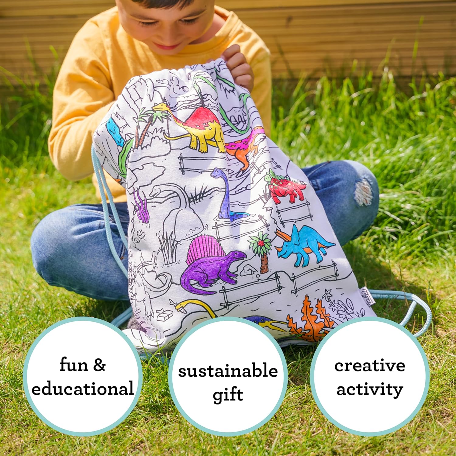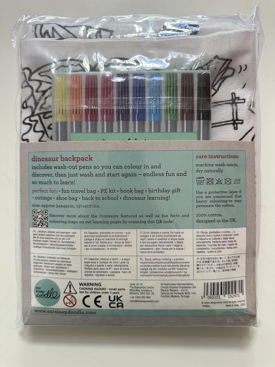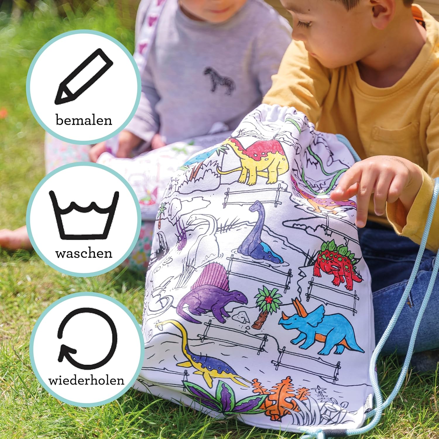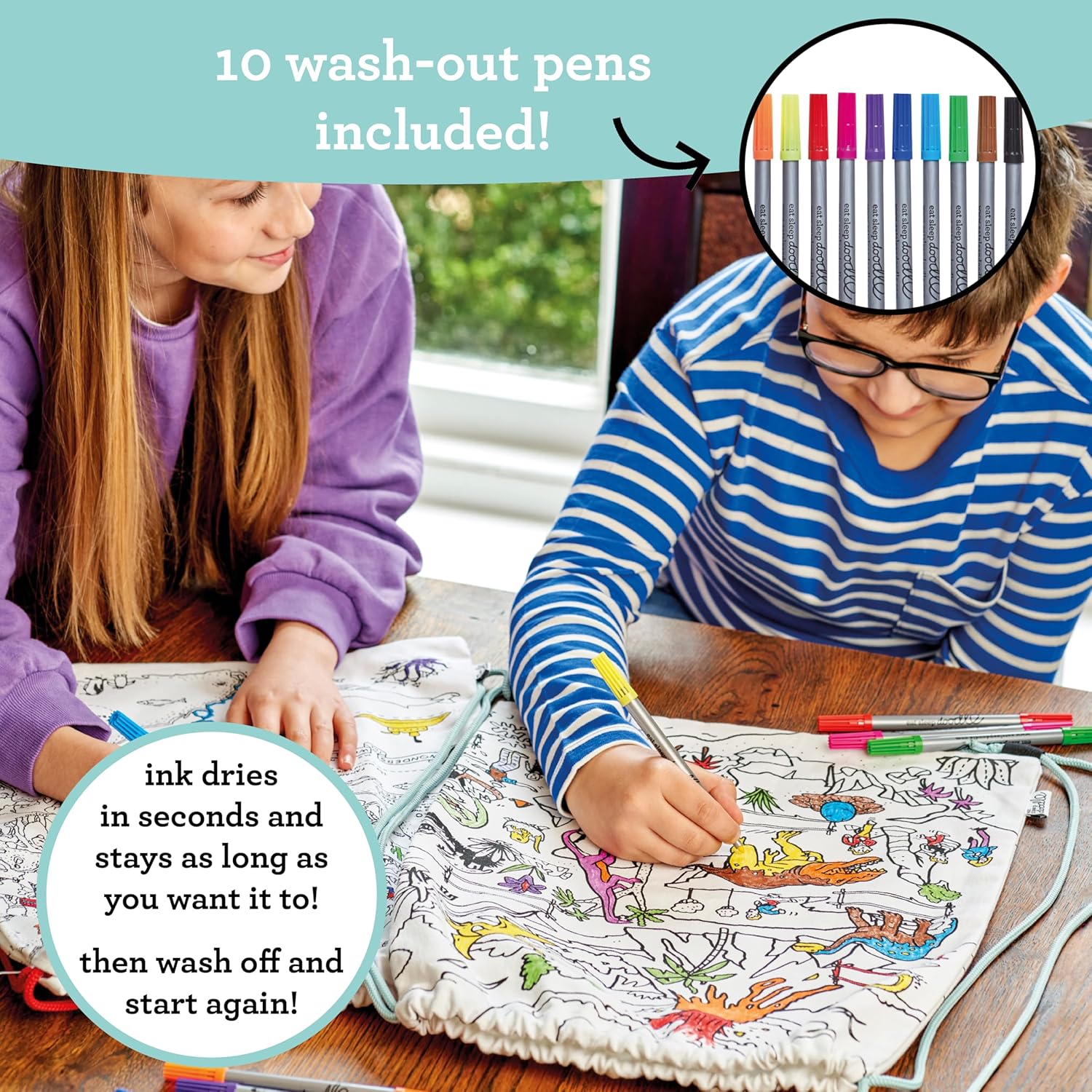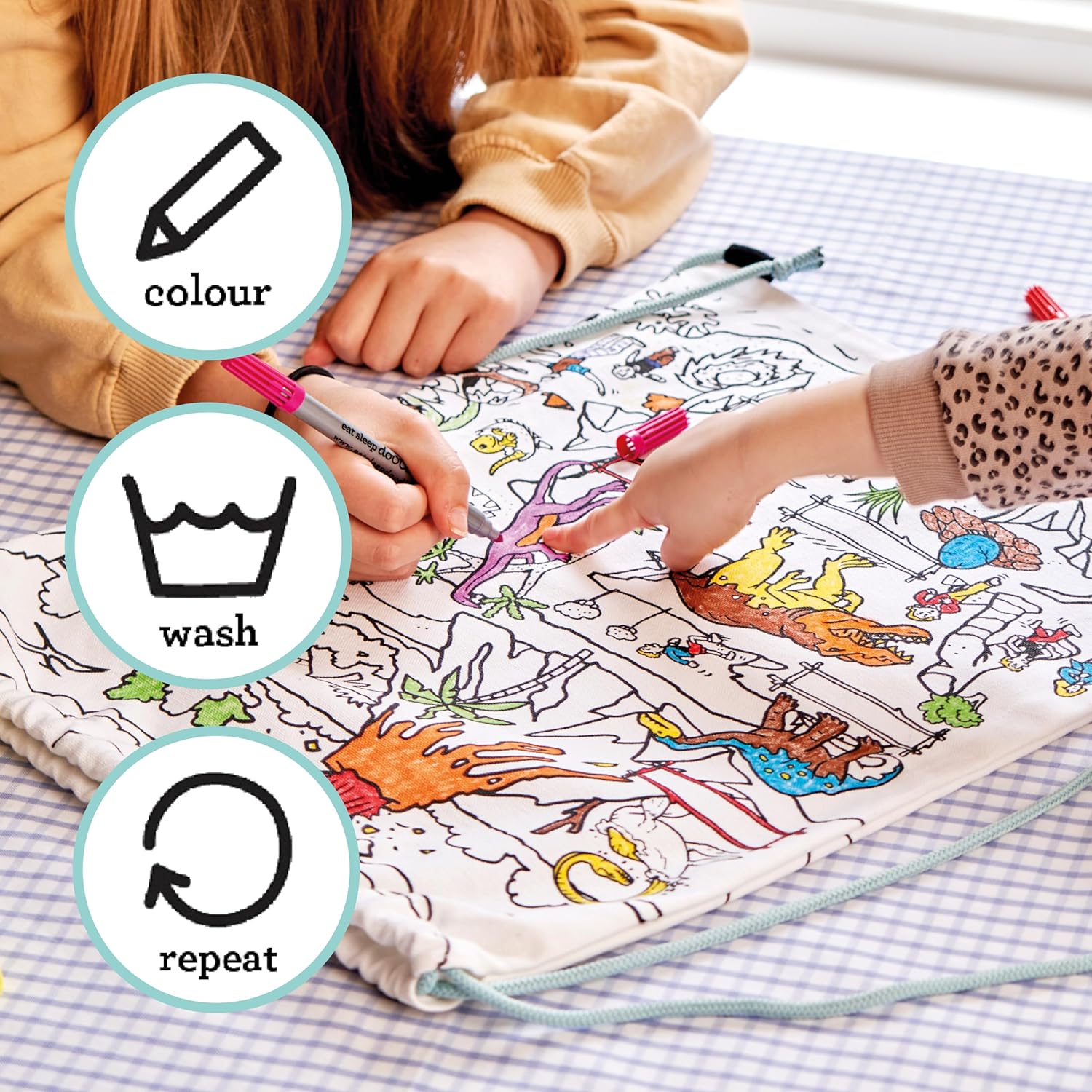 Il nuovo zaino con coulisse è realizzato al 100% in cotone con carta con motivo grafico/a griglia stampato su entrambi i lati e viene fornito con un set di 10 penne per tessuto a doppia estremità, quindi può essere scarabocchiato con disegni personalizzati o messaggi personalizzati, quindi semplicemente lavato in lavatrice a caldo, pronto per scarabocchiare e ridisegnare. Lavalo in lavatrice in acqua tiepida, appendi ad asciugare in modo naturale e sei pronto per ricominciare.