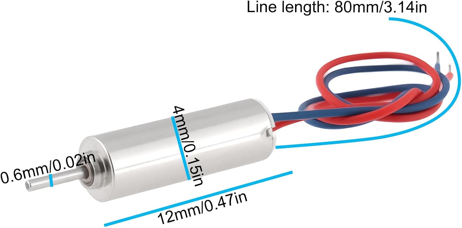 Motore Dimensioni: 4 x 12mm; Lunghezza Del Cavo: 80mm Tensione nominale: DC 3V, la velocità è alta come 40000RPM, fornendo una forte potenza per il modello di aeromobile e raggiungendo facilmente il volo ad alta velocità. Basso consumo energetico, alta efficienza, funzionamento stabile, lunga durata, frequenza di sostituzione ridotta, durevole e affidabile. Ampia applicazione: adatto per telefoni cellulari, giocattoli, modelli di aeromobili, aerei telecomandati e altre apparecchiature elettroniche di vibrazione, ecc. Il guscio robusto e la buona dissipazione del calore impediscono collisioni e surriscaldamento, garantendo sicurezza di volo e un uso più sicuro.