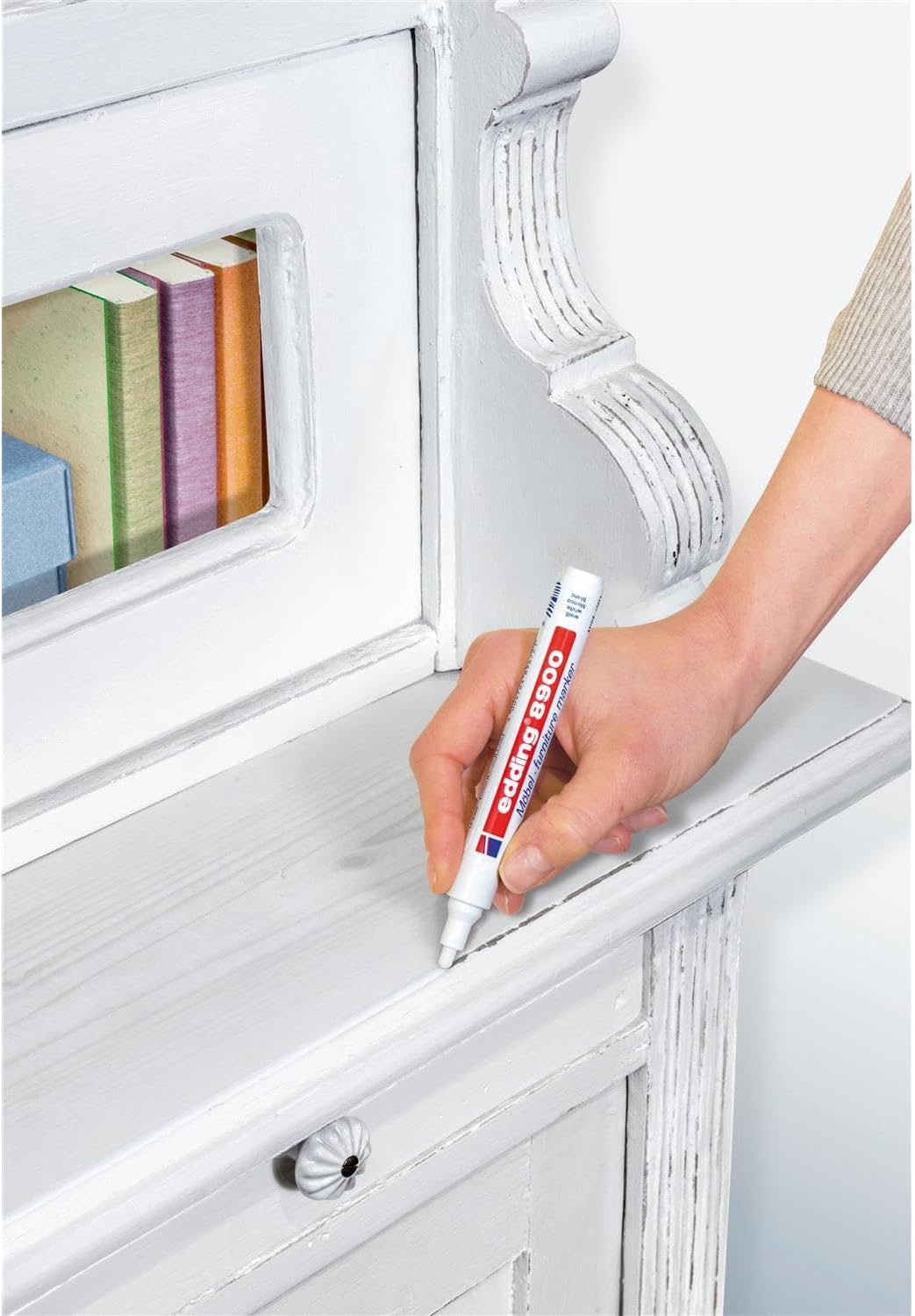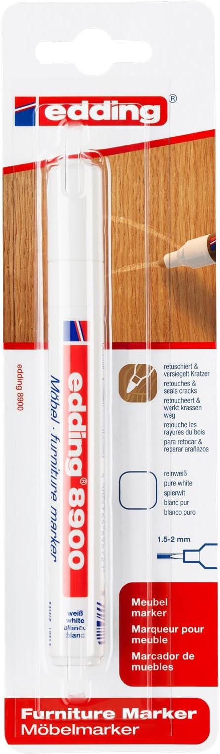 Pennarello per ritocco per legno per riempire in modo permanente i graffi di impiallacciature e legno massello di diverse specie La confezione contiene 1 pennarello per mobili in bianco puro Punta rotonda robusta con una larghezza del tratto di 1,5-2 mm per un uso pulito e preciso Inchiostro molto coprente, simile alla vernice, inodore, ad asciugatura rapida e resistente all'acqua e alla cancellazione; resiste alla maggior parte dei detergenti delicati Disponibile in 13 tonalità di legno