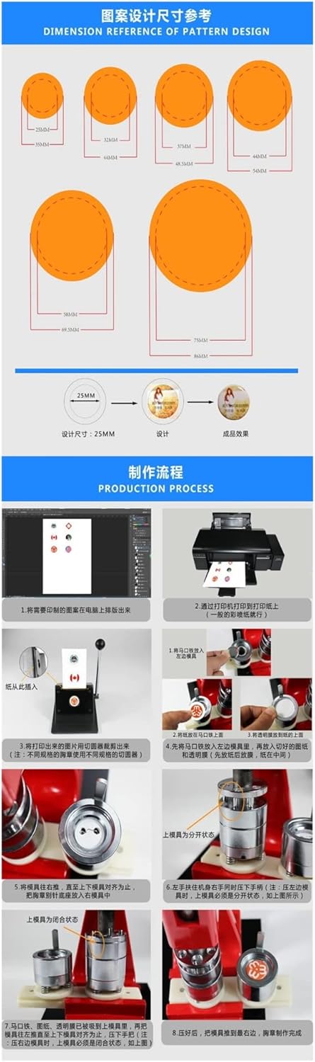 Fai da te una sorta di macchina per la produzione di badge in grado di realizzare piccole cose come spille, apriscatole, grucce, fiori a rosetta, portachiavi, ecc. Questa macchina utilizza tecnopolimeri ad alta resistenza, il corpo della macchina e gli stampi sono integrati, è leggero e facile da usare ed esercita pienamente l'abilità pratica del bambino. La slitta in alluminio può essere posizionata con precisione e facilita la realizzazione dei badge. Inoltre, è molto comodo cambiare le trafile quando è necessario utilizzare altre dimensioni. Il solido corpo in lega di alluminio, gli stampi precisi in acciaio inossidabile e la lunga impugnatura in acciaio dal design ergonomico offrono una presa comoda e fanno risparmiare energia e tempo. Puoi realizzare badge con motivi diversi. Adatto al normale utilizzo familiare. Con una fotocamera digitale e una varietà di parti di pulsanti