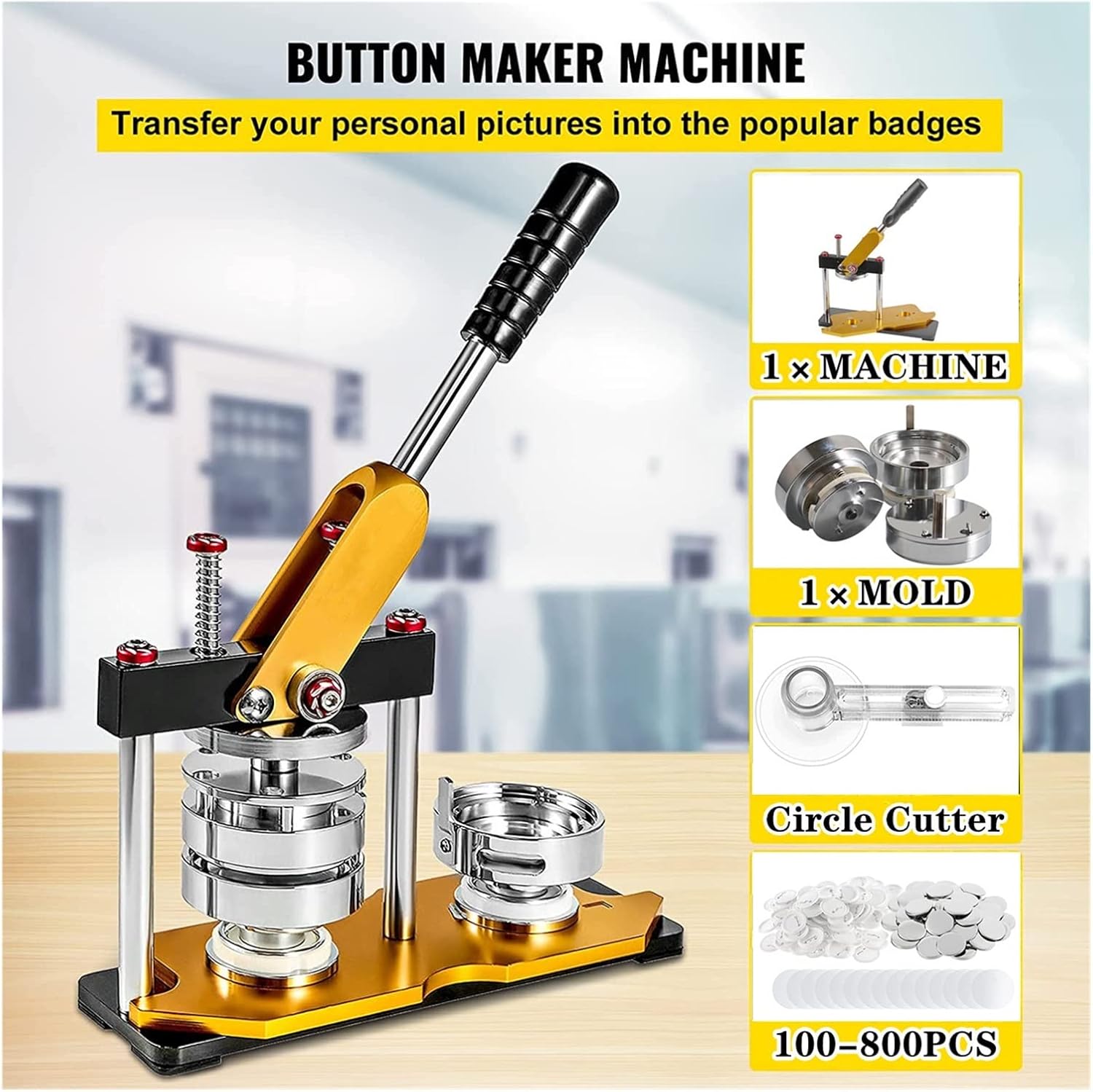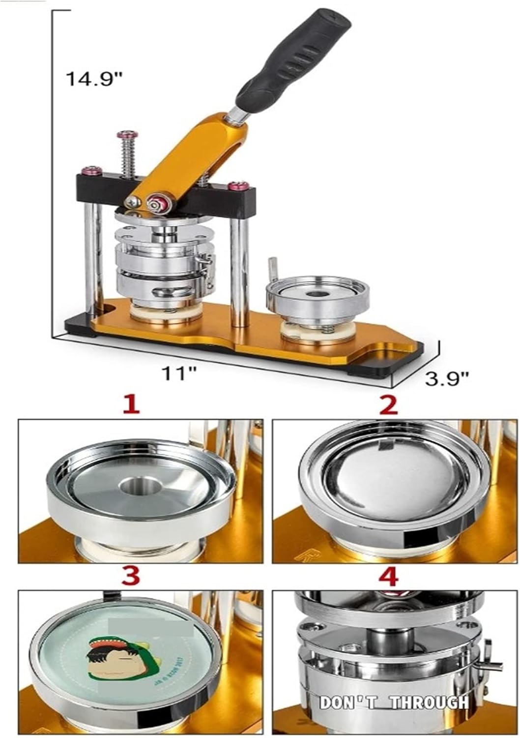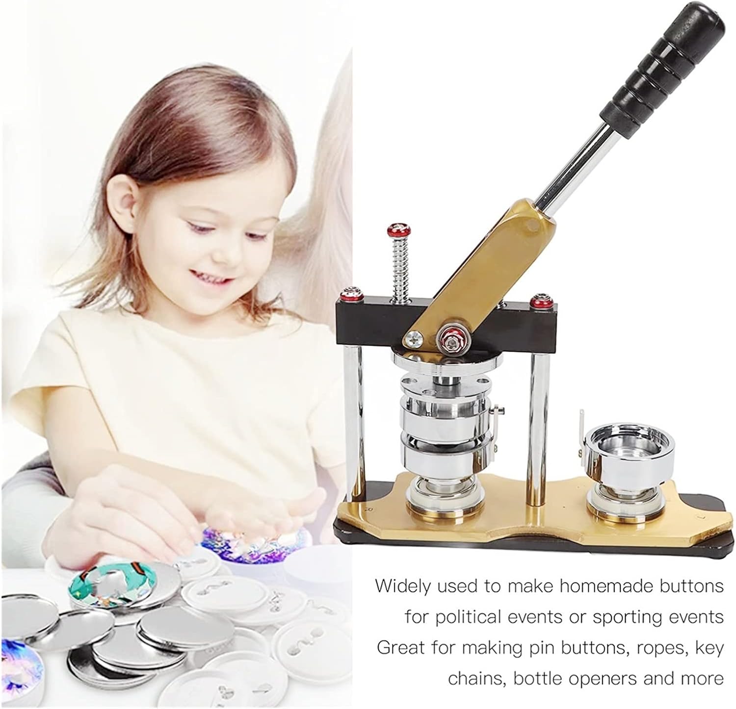 Il design robusto, il materiale con trattamento superficiale avanzato, la colonna solida e la base inferiore da 10 mm offrono prestazioni durature e stabili. Maniglia dal design ergonomico: la maniglia gommata è comoda da tenere. Le doppie molle e i cuscinetti duplex facilitano la pressatura. Con il taglierino circolare puoi realizzare fogli rotondi con qualsiasi dipinto. Facile da installare: lascia la parte superiore verso la testina magnetica, posiziona le altre due forme sulle piastre A e B, quindi avvita la maniglia al corpo della pressa per penna. Realizza badge senza sforzo: devi prima inserire il bottone, la carta e i lucidi, girare la base rotante in senso antiorario e premere la maniglia finché tutti i pezzi non si inseriscono nella testa magnetica. Quindi inserisci un ago di plastica nell'altro, ruota la base in senso orario e premi la maniglia finché tutti i pezzi non vengono premuti insieme in un distintivo. Ampiamente usato: può essere utilizzato all'interno e all'esterno per spille, portachiavi, badge di giochi, apribottiglie, attività scolastiche, ecc.