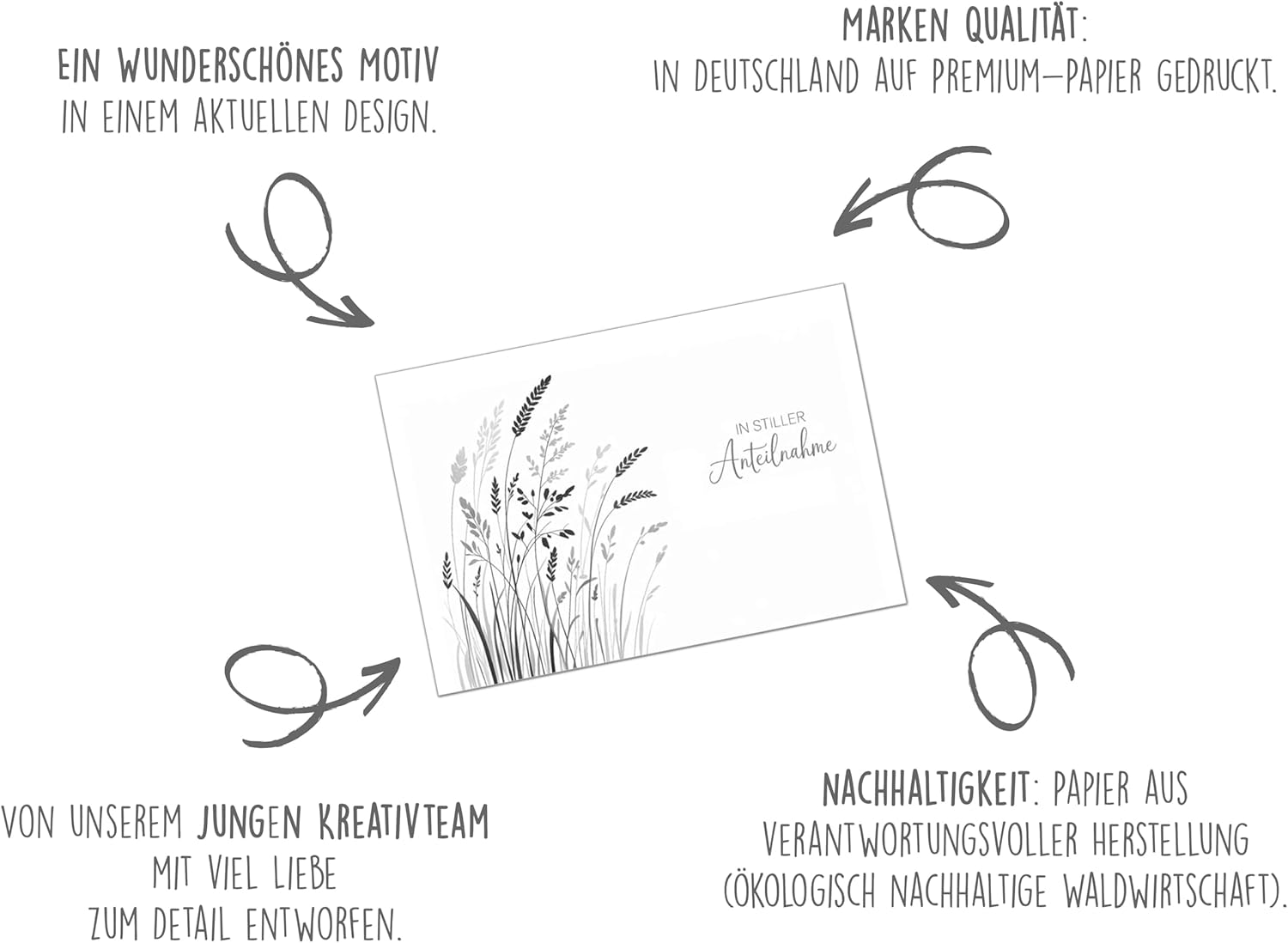 Incomparabile: un biglietto di condoglianze di alta qualità per i più esigenti. Bellissimo biglietto che esprime un apprezzamento speciale. Alta qualità: la dimensione del biglietto è 17,0 x 11,5 cm. Ogni biglietto viene fornito con una busta colorata abbinata. Carta di alta qualità stampata in Germania. Stampa offset di alta qualità. Qualità superiore. Questa è una carta doppia/carta pieghevole senza testo all'interno. Design innovativo: il nostro giovane team creativo progetta i biglietti con tanto amore per un bel design. Seidel, creiamo tendenze. Si prega di visualizzare le nostre altre carte e assortimenti. Grazie per la comprensione.