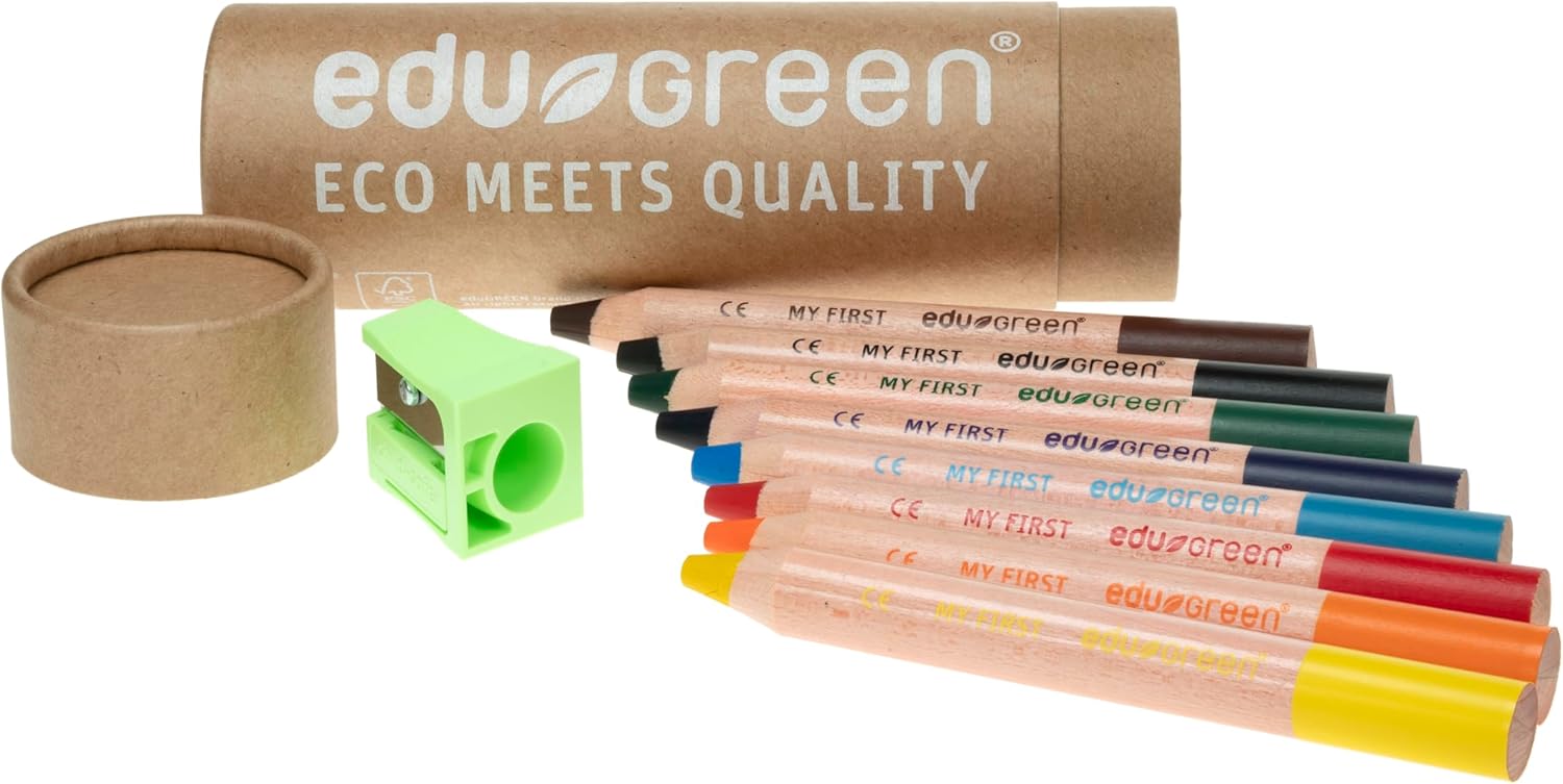 8 matite colorate corte con temperamatite, pratica scatola rotonda con mina extra morbida da 8 mm Legno certificato FSC, stabile e durevole, ideale per la scuola e l'asilo Temperamatite in plastica PCR, realizzato in materiale riciclato Vernice a base d'acqua, lavorazione sicura per i bambini Colori vivaci e design adatto ai bambini, lunghezza ergonomica della penna per mani piccole