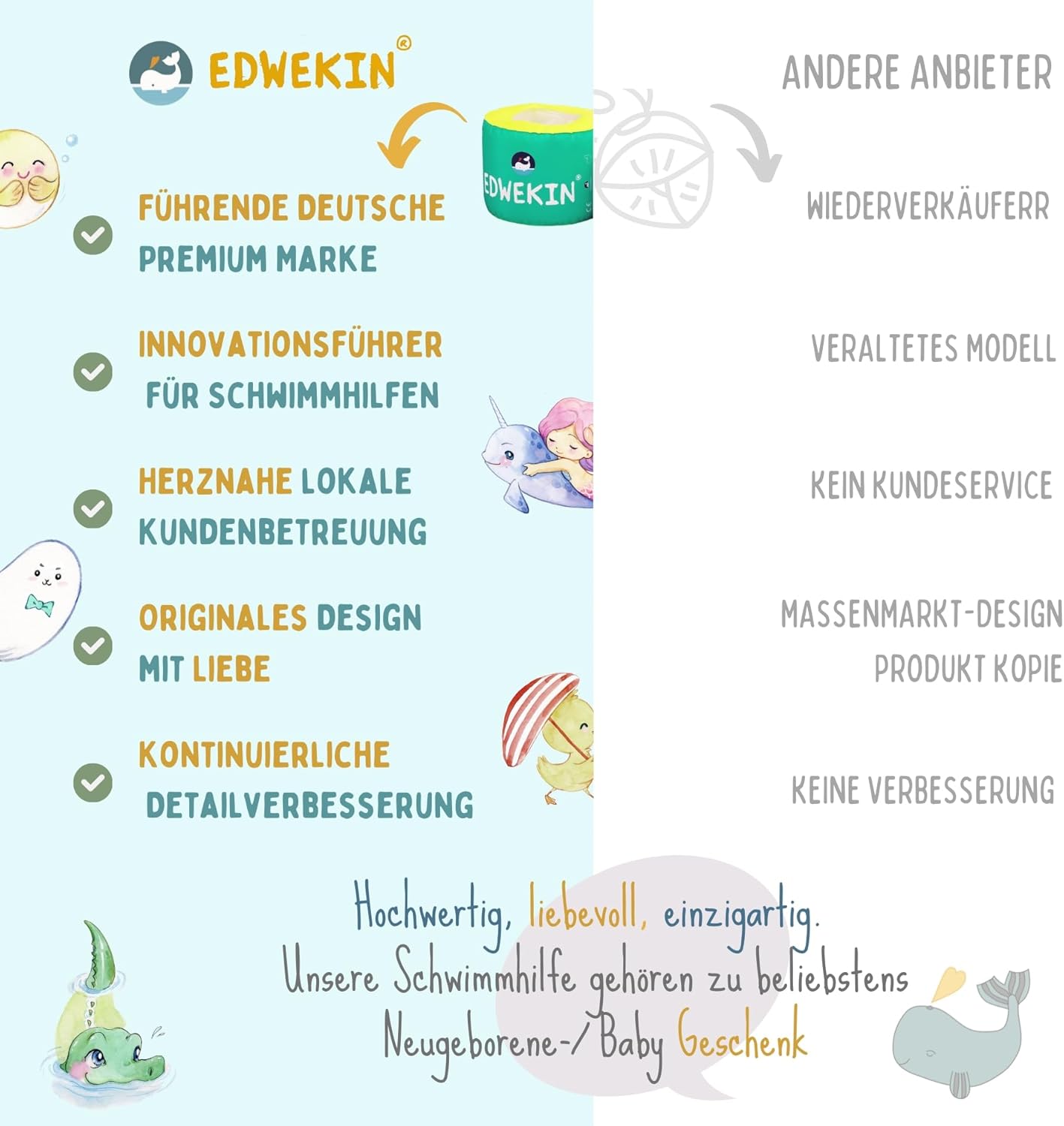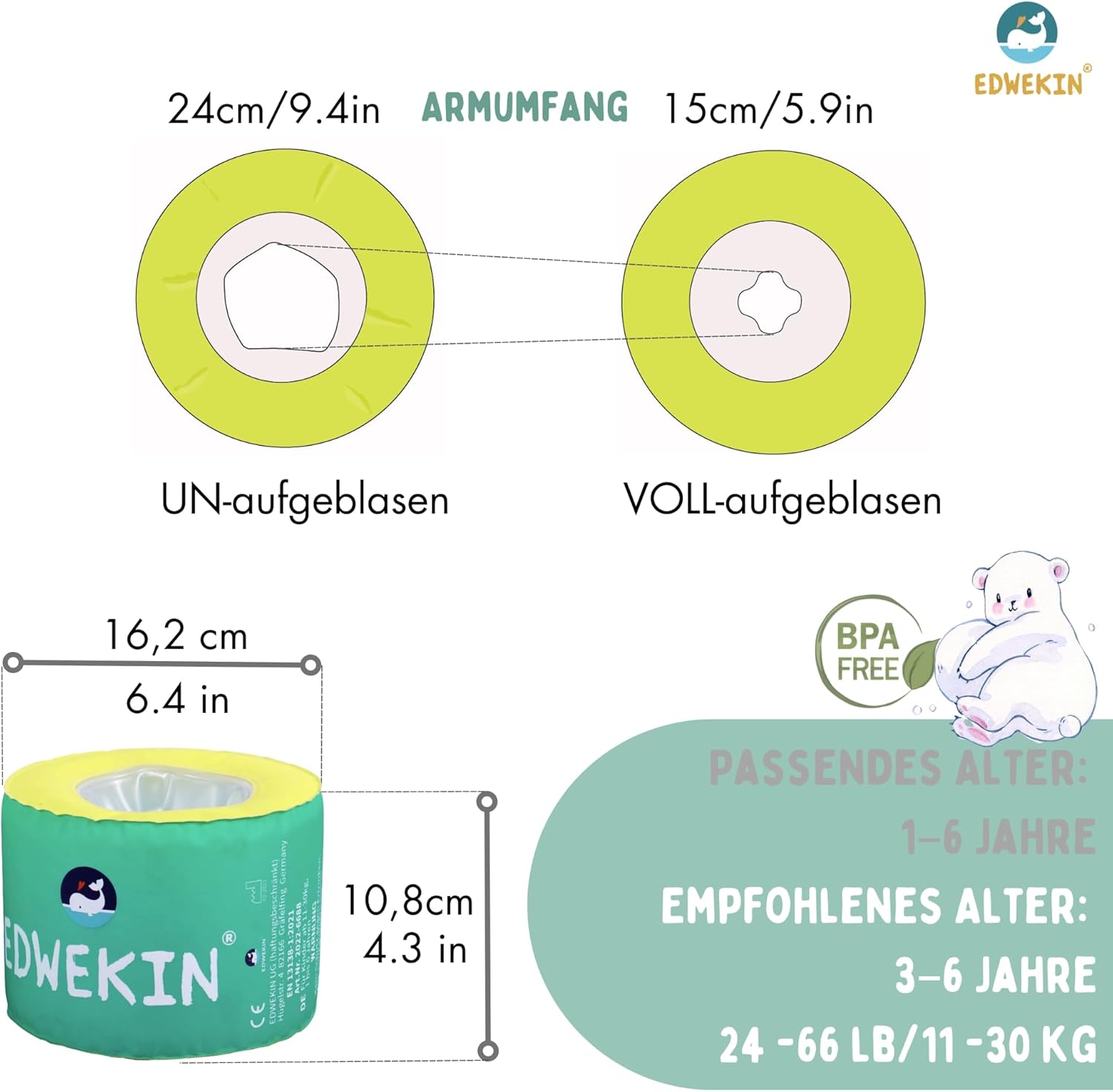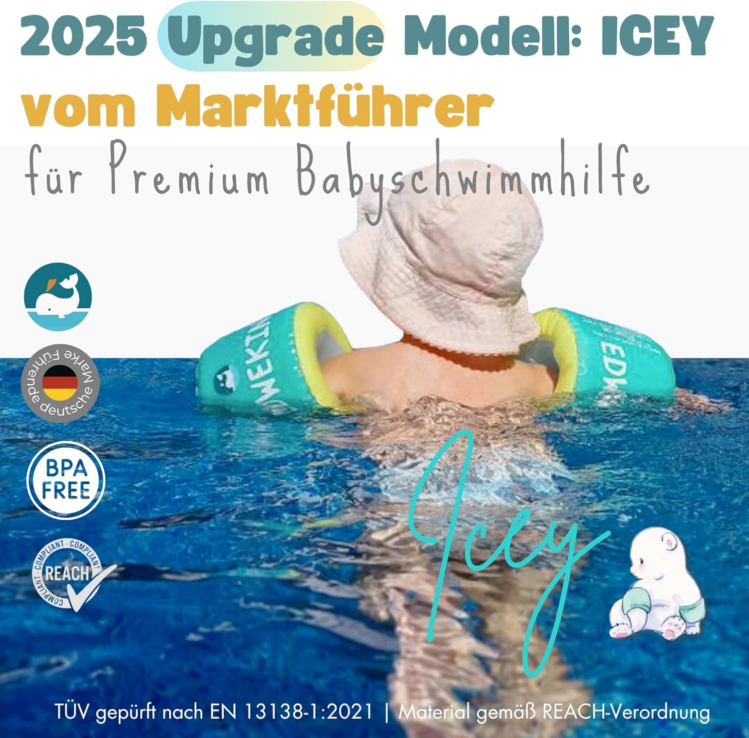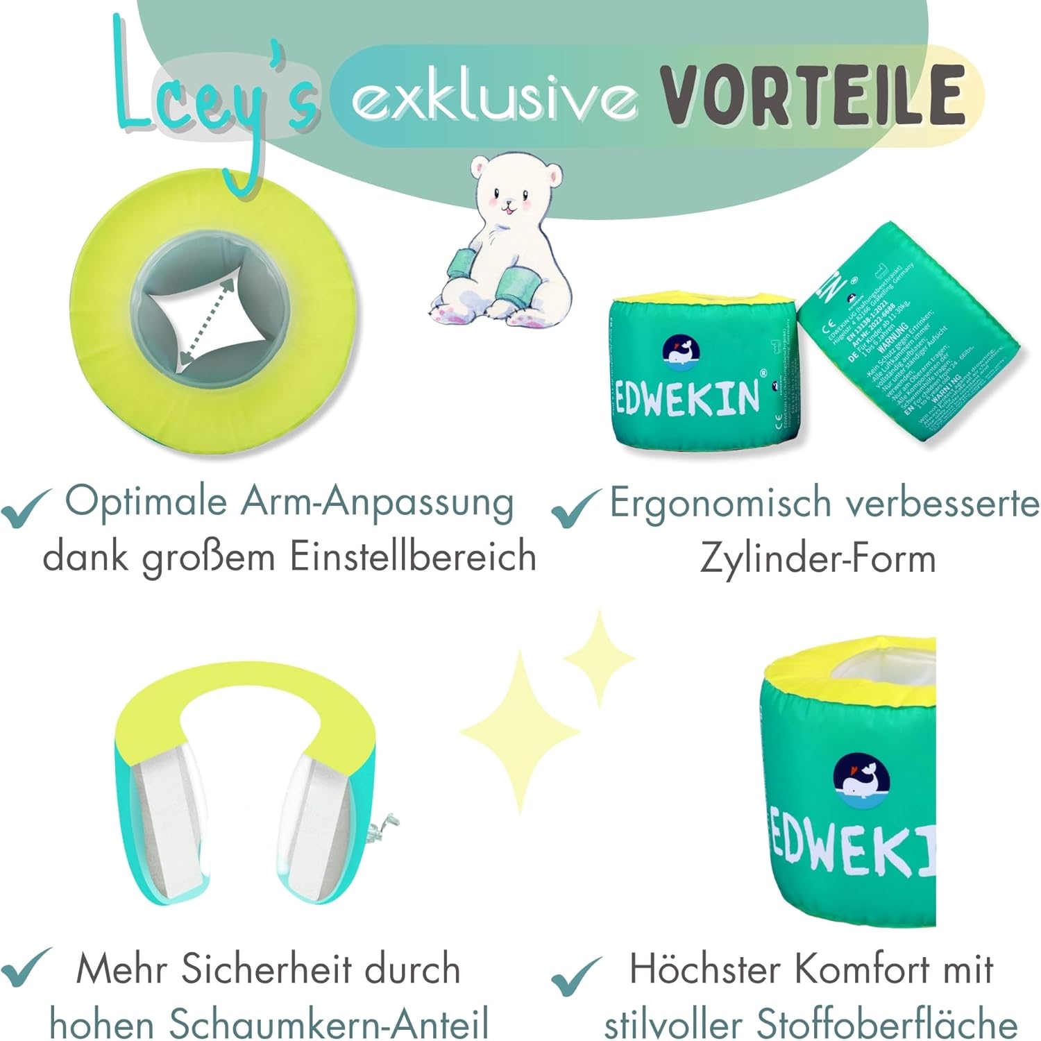 ✔ Marchio di qualità tedesca: EDWEKIN è un pioniere del mercato per aiuti al nuoto di alta qualità. I nostri prodotti sono progettati da ingegneri e designer con grande attenzione ai dettagli, ispirati all'esperienza e ai desideri di migliaia di genitori. ✔ Sicurezza testata TÜV: i braccioli ICEY sono conformi alla più recente norma DIN EN 13138-1:2021 e sono certificati come equipaggiamento di protezione individuale (regolamento UE 2016/425). Per un divertimento spensierato con la massima sicurezza. ✔ Materiali sostenibili di alta qualità: i braccioli ICEY sono realizzati in materiale robusto, privo di BPA e conforme a REACH. Durevole, delicato sulla pelle e sicuro – per una sensazione confortevole anche per un lungo divertimento in acqua. ✔ Design elegante e unico: Icey convince per il suo design moderno e fresco con superficie in tessuto morbido, nucleo in schiuma rinforzata e un sistema di valvole sicuro. I colori e i motivi alla moda attirano l'attenzione in piscina, spiaggia o lago. ✔ Ergonomico e confortevole: grazie all'innovativa struttura a cilindro rotondo, ICEY si adatta perfettamente alle piccole braccia. Libertà di movimento, comfort e galleggiabilità, ideale per bambini dai 3 ai 6 anni. Perfetto per i principianti del nuoto e come regalo amorevole.