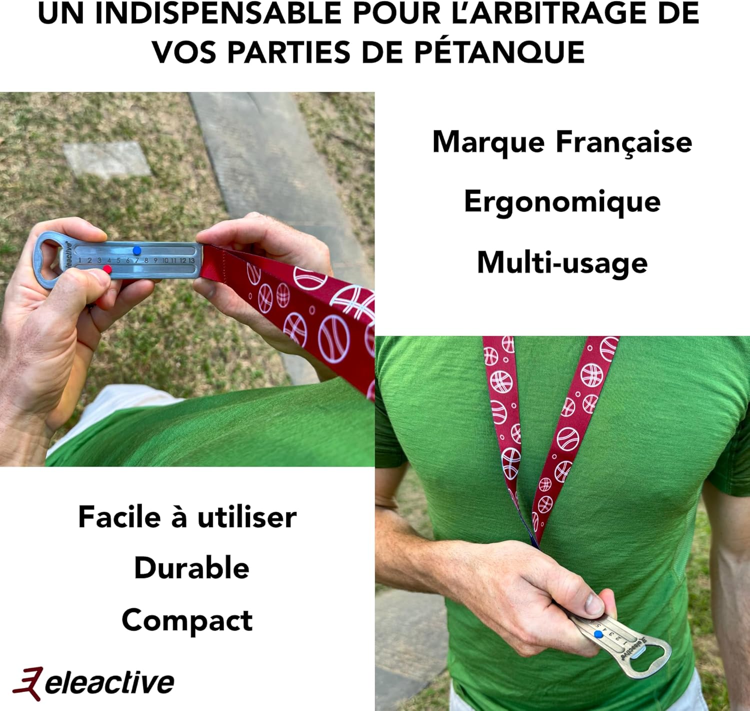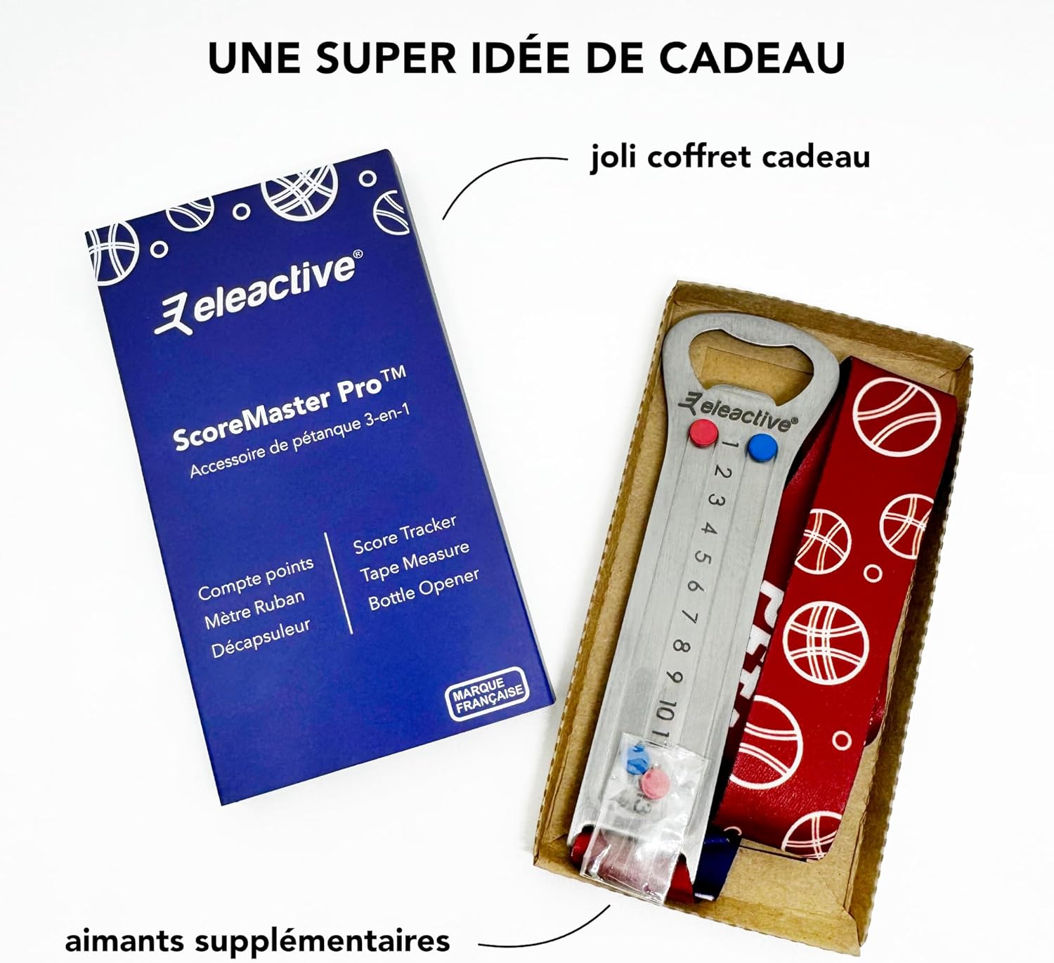 💡 UN INDISPENSABILE PER L'ARBITRATO DELLE VOSTRE PARTI DI PETANCA: ScoreMaster Pro trasforma l'arbitrato delle vostre bocce. Grazie al suo sistema di conteggio dei punti preciso e intuitivo, elimina le controversie e garantisce un gioco fluido. Compatto e semplice da usare, è lo strumento ideale per un monitoraggio accurato e solo punteggio che non ti lascerà mai più. Uno strumento multiuso ergonomico: lo ScoreMaster Pro combina ergonomia e multifunzionalità. Con il suo cordino graduato da 60 cm, facilita le misurazioni precise tra le palle. Il suo design compatto consente un facile trasporto, sia in tasca che intorno al collo, rendendo questo strumento perfetto per ogni giocatore di bocce, garantendo parti giuste e piacevoli. DECAPSULER INTEGRATO: Una volta completata la partita, l'apribottiglie integrato ti consente di celebrare i tuoi successi senza ingombro. Compatto, ergonomico e versatile, ScoreMaster Pro è lo strumento essenziale per aumentare la tua esperienza di bocce. Design di alta gamma: progettato da appassionati di bocce nel Var, lo ScoreMaster Pro è composto da un corpo in acciaio inossidabile 410, su cui scorrono due magneti al neodimio N52 da 2 mm di spessore rendendo l'esperienza di conteggio del punto estremamente soddisfacente. La confezione include 2 magneti di ricambio da utilizzare in caso di perdita. 🎁 UNA SUPER IDEA REGALO: Eleactive Scoremaster è venduto in una scatola di cartone kraft ed è una perfetta idea regalo di compleanno, regalo di Natale o regalo di festa del papà per qualsiasi giocatore di bocce appassionato di bella attrezzatura.
