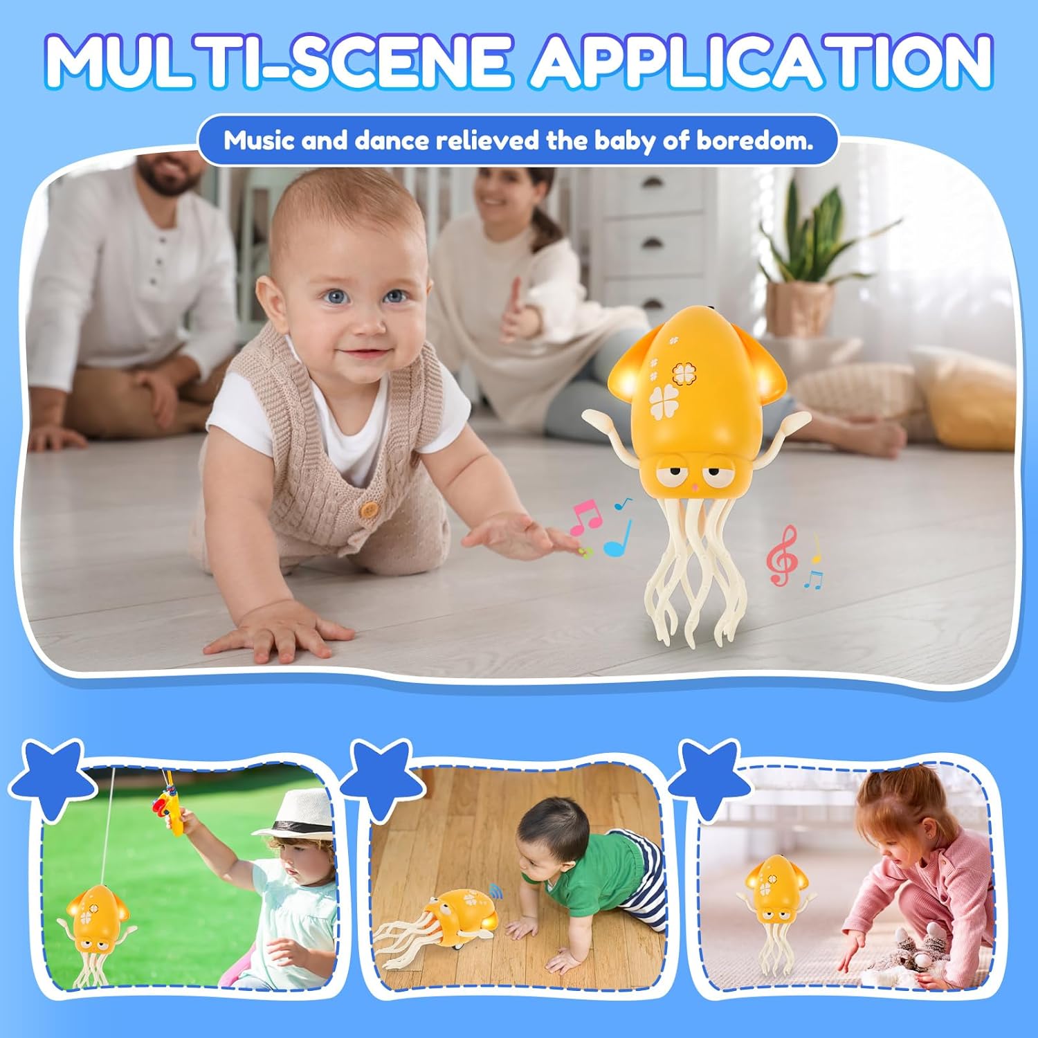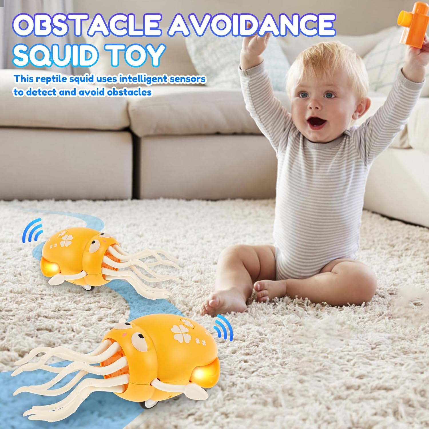 Divertente giocattolo dancing polpo : questo giocattolo danzante polpo può stare in piedi, oscillare, girare, strisciare, lampeggiare contemporaneamente luci colorate e suonare musica incantevole. Ha simpatici personaggi dei cartoni animati e mani sensibili, con tre colori vivaci abbinati a espressioni dolci, porta un'esperienza visiva e uditiva nuova e unica, attira l'attenzione dei bambini, incoraggia a gattonare e correre, ed è molto adatto per lo sviluppo sensoriale precoce dei bambini di età superiore ai 36 mesi Rilevamento intelligente degli ostacoli: questo giocattolo polpo danzante è dotato di sensori intelligenti. Quando rileva un ostacolo, attiva immediatamente il meccanismo di prevenzione degli ostacoli per spostarsi all'indietro o ruotare in altre direzioni. Può guidare liberamente attraverso diverse stanze a casa senza essere facilmente interrotto e il divertimento è infinito. Quando gira e cambia direzione, attira anche l'attenzione dei bambini, pratica la loro concentrazione ed è un giocattolo sensoriale molto interessante Due modalità di gioco: questo giocattolo da ballo non solo può stare in piedi e ruotare, ma viene fornito anche con ruote che possono ruotare orizzontalmente sul retro e simulare diverse modalità di nuoto dei polpi, in modo che i bambini possano giocare in scene diverse. Dopo l'accensione, le mani ondulate e i tentacoli ondeggianti del polpo aggiungono divertimento al giocattolo e incoraggiano i bambini a esplorare e soddisfare la loro curiosità. È molto adatto per il periodo addominale dei bambini Materiale sicuro e ricarica USB: realizzato in materiale plastico di alta qualità e sicuro, privo di sostanze nocive, lucido liscio, può essere giocato in sicurezza dai bambini, robusto e durevole e può essere utilizzato per un lungo periodo di tempo. Non c'è bisogno di batterie, viene fornito con un cavo di ricarica USB, può giocare a lungo con una sola carica e offre un divertimento sostenibile in qualsiasi momento Il regalo perfetto per i bambini: se stai cercando un regalo di compleanno, un regalo per le vacanze o un riempimento di scatole regalo, questo giocattolo di calamari danzante può essere adattato perfettamente. Con i suoi movimenti dinamici, luci colorate e musica incantevole, è divertente per bambini e adulti in ogni occasione, può anche esercitare la vista, l'udito, il movimento e la voce dei bambini. È il regalo perfetto per la crescita indimenticabile. Regalalo ai tuoi figli e amici e crea momenti indimenticabili per loro
