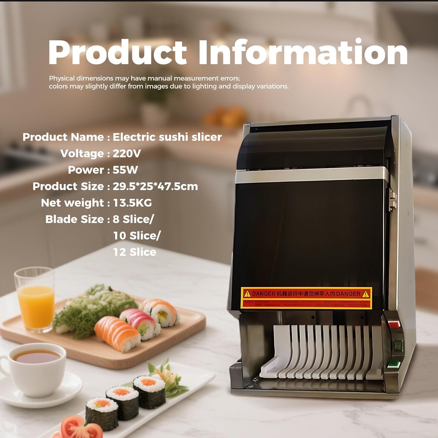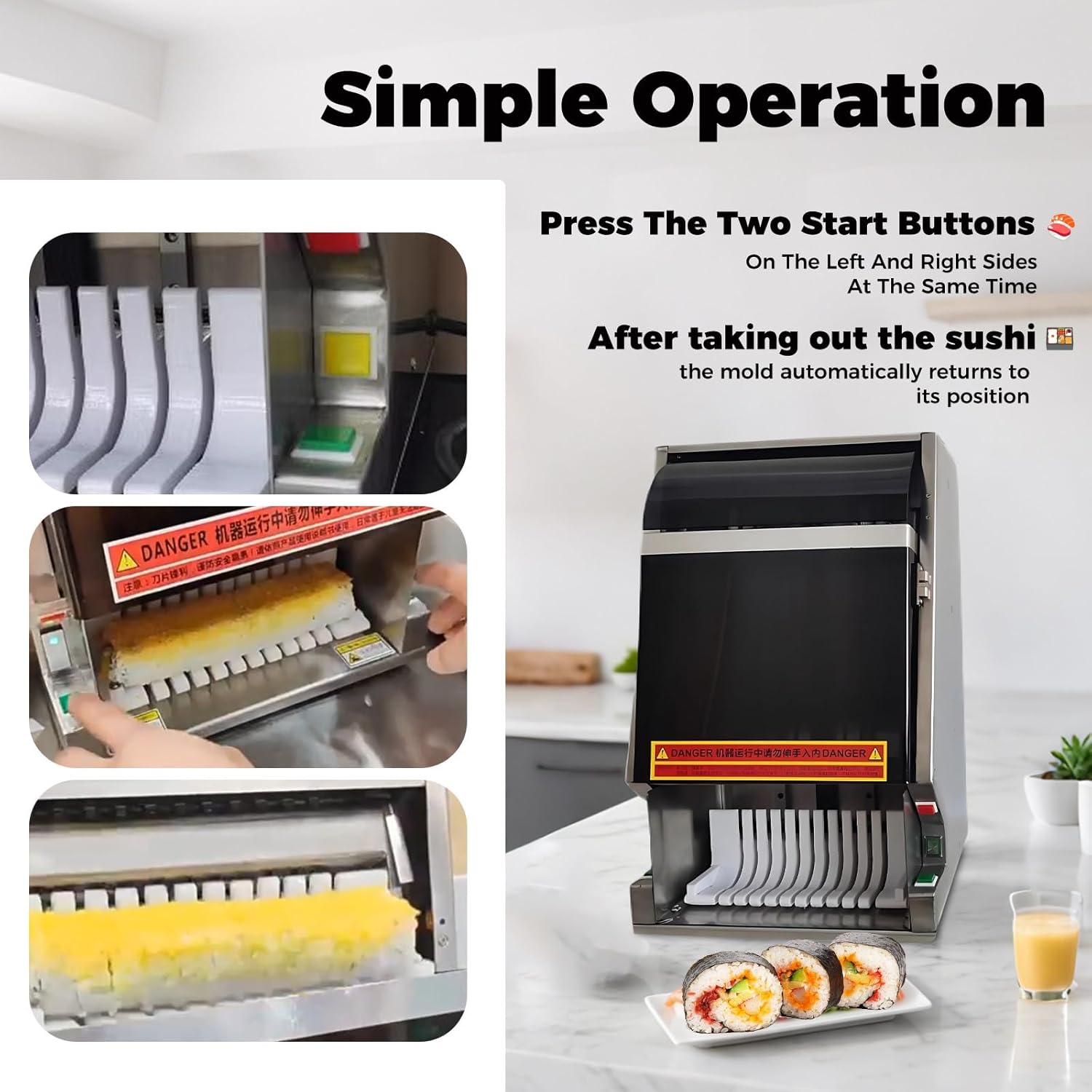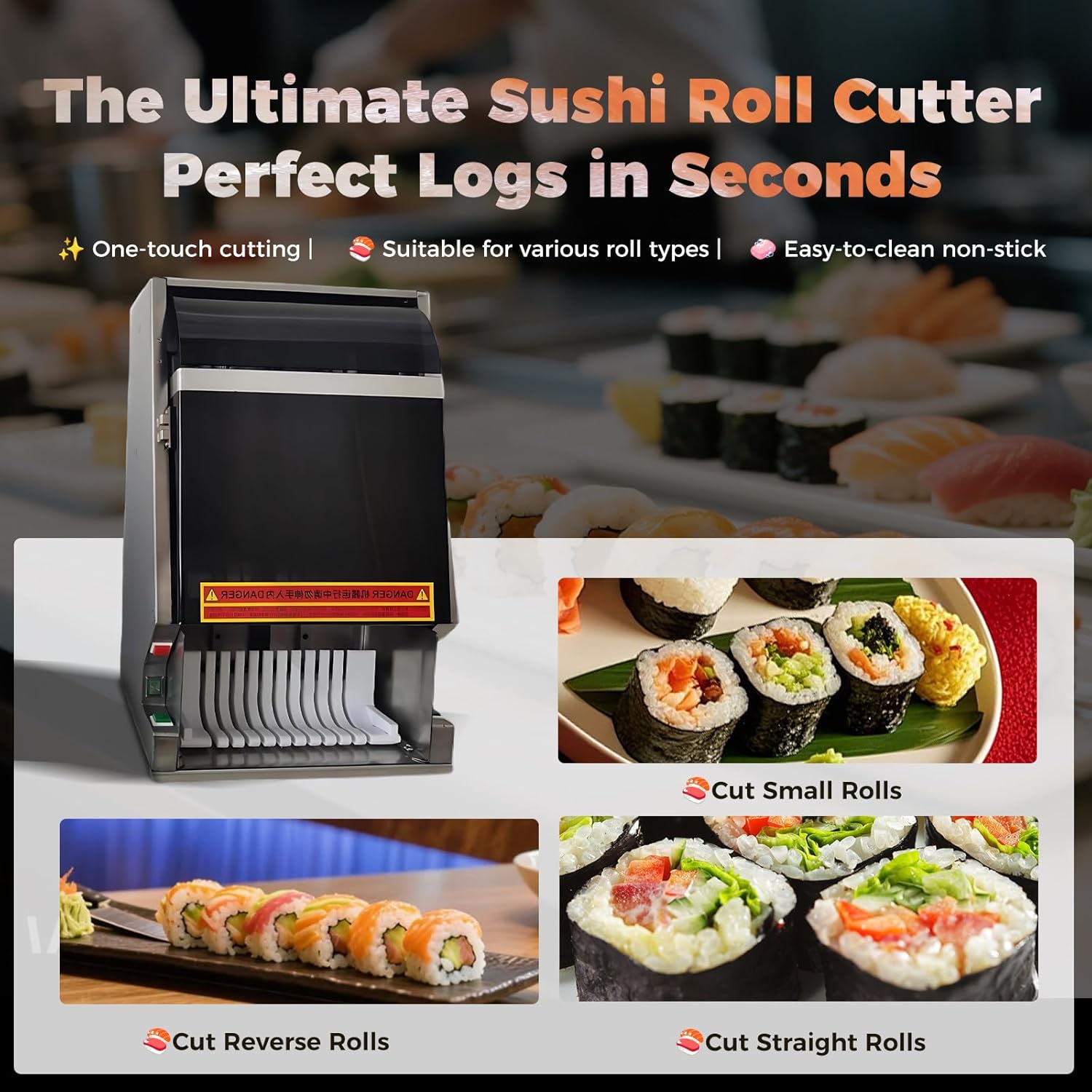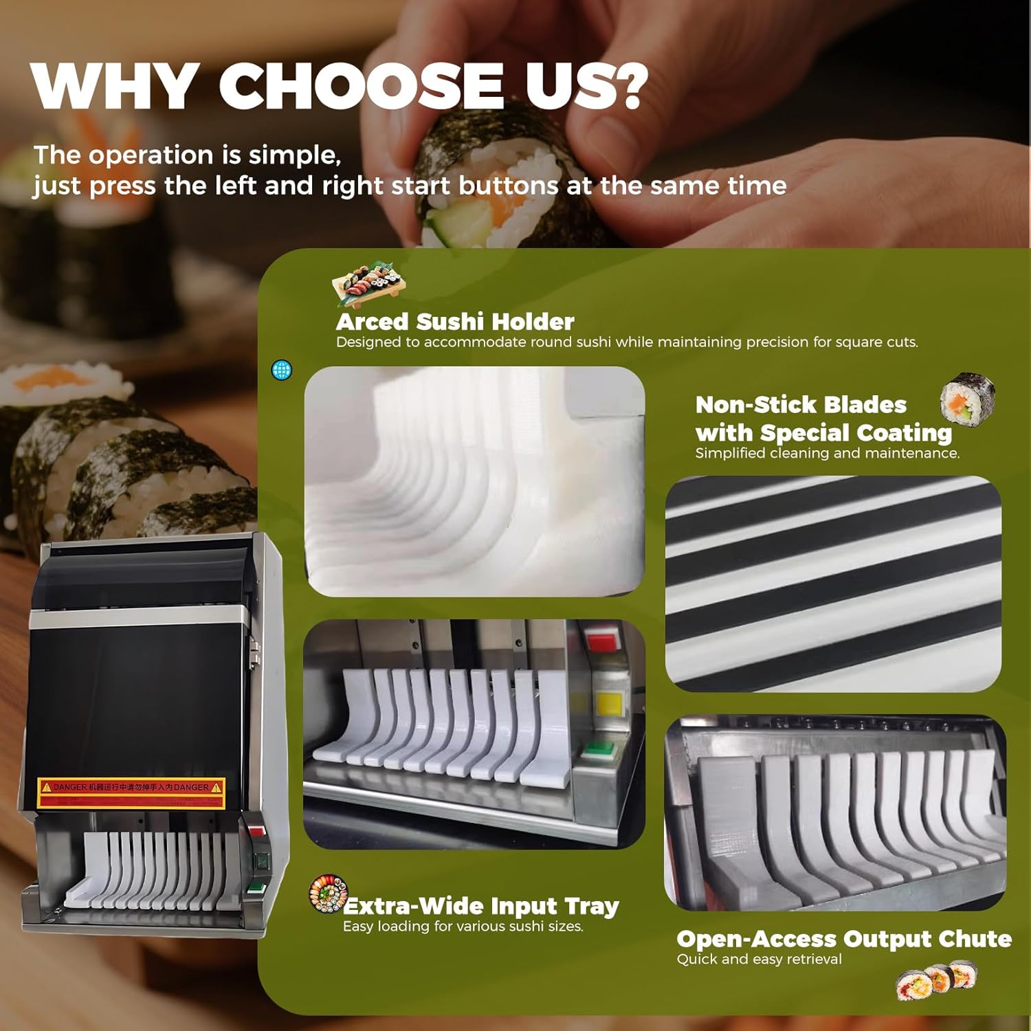 【Taglio Netto】Lama affilata resistente e meccanismo di taglio push-pull per tagli rapidi senza schiacciare gli ingredienti. Bordi lisci e dimensioni uniformi per una presentazione perfetta. 【Materiali Durevoli】Acciaio inox di alta qualità, antiaderente e igienico. Motore in rame da 50W e guide di precisione industriali per dissipazione termica efficiente e lunga durata. 【Protezione Multipla】Pulsante di arresto d'emergenza e protezione per la lama per operare in sicurezza. 【Utilizzo Semplice】Premere contemporaneamente i due pulsanti di avvio. Supporto si riposiziona automaticamente. Taglio regolabile in 8/10/12 fette. Blocchi regolabili per rotoli di diverse forme e dimensioni. Taglio scorrevole e senza sforzo. 【Ampia Utilizzabilità】Progettato per rotoli di sushi (California roll, hand roll…), taglia anche affettati, formaggi, banane, uova, prosciutto e altri alimenti morbidi. Scelta pratica per ristoranti e casa.