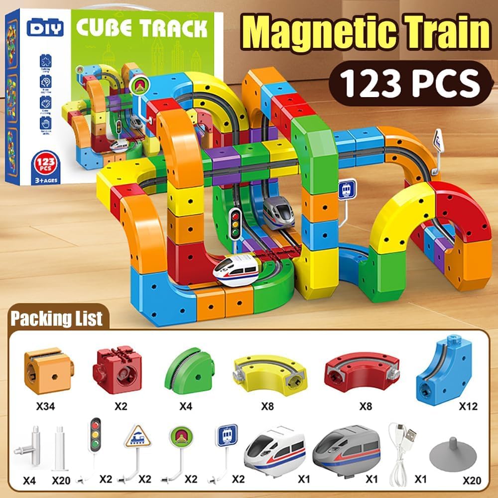 【Dynamic Track Configurations】Colorful interlocking cubes build flexible layouts with vertical climbs, curves, and multi-directional twists. This electric train set enables suspended inverted runs through secure magnetic connections. 【Gravity-Defying Maneuvers】Watch trains ascend slopes, complete 360° rotations, and traverse laterally while inverted. The magnetic monorail train set performs jaw-dropping maneuvers that defy conventional train movements. 【Cognitive Skill Development】Enhances spatial reasoning and creative problem-solving through experimental track designs. Our click rail track toy challenges builders to think while designing complex railway systems. 【Easy & Secure DIY Assembly】Featuring interlocking clips and colourful building blocks, the train set is simple yet secure to build. Pieces fit together firmly for stable, collapse-free racing, supporting both simple and complex layouts. 【Exceptional Gift Presentation】Perfect for birthdays and holidays with its impressive engineering display. The upside down train set arrives gift-ready to delight thrill-seekers and innovative builders alike.