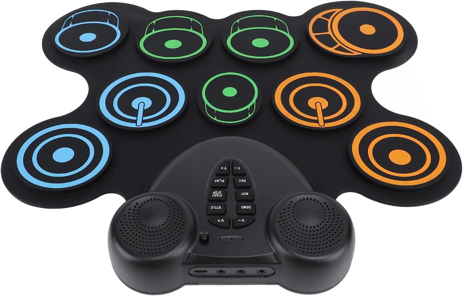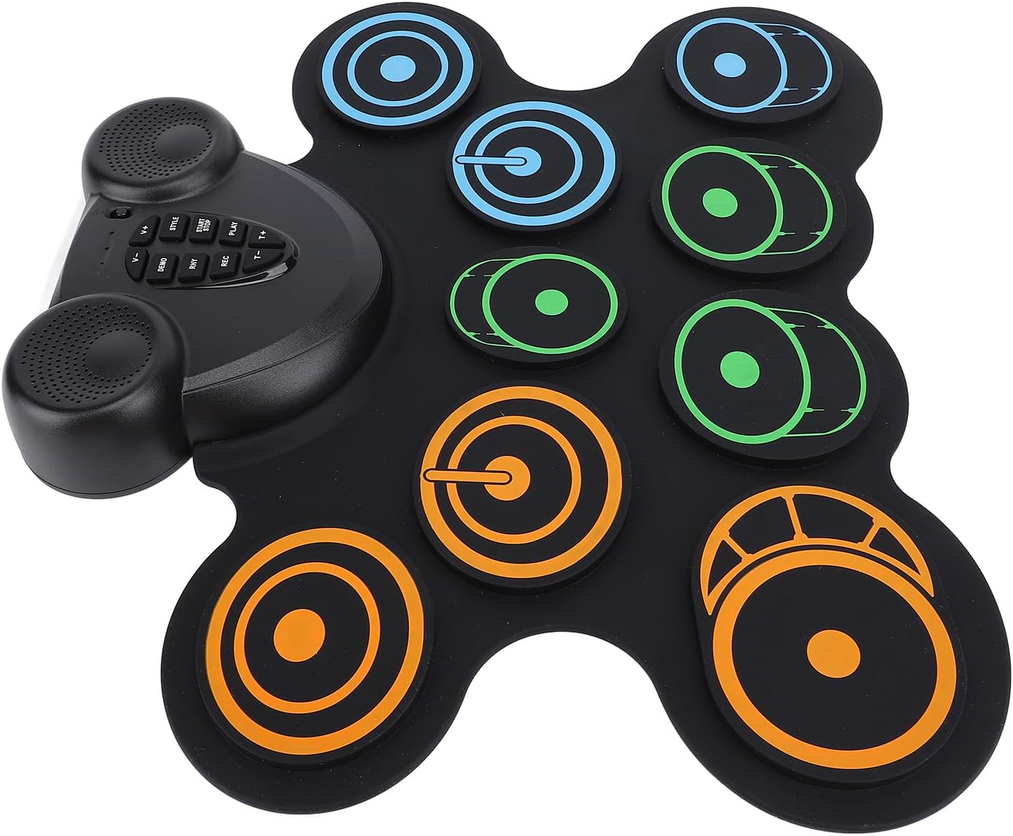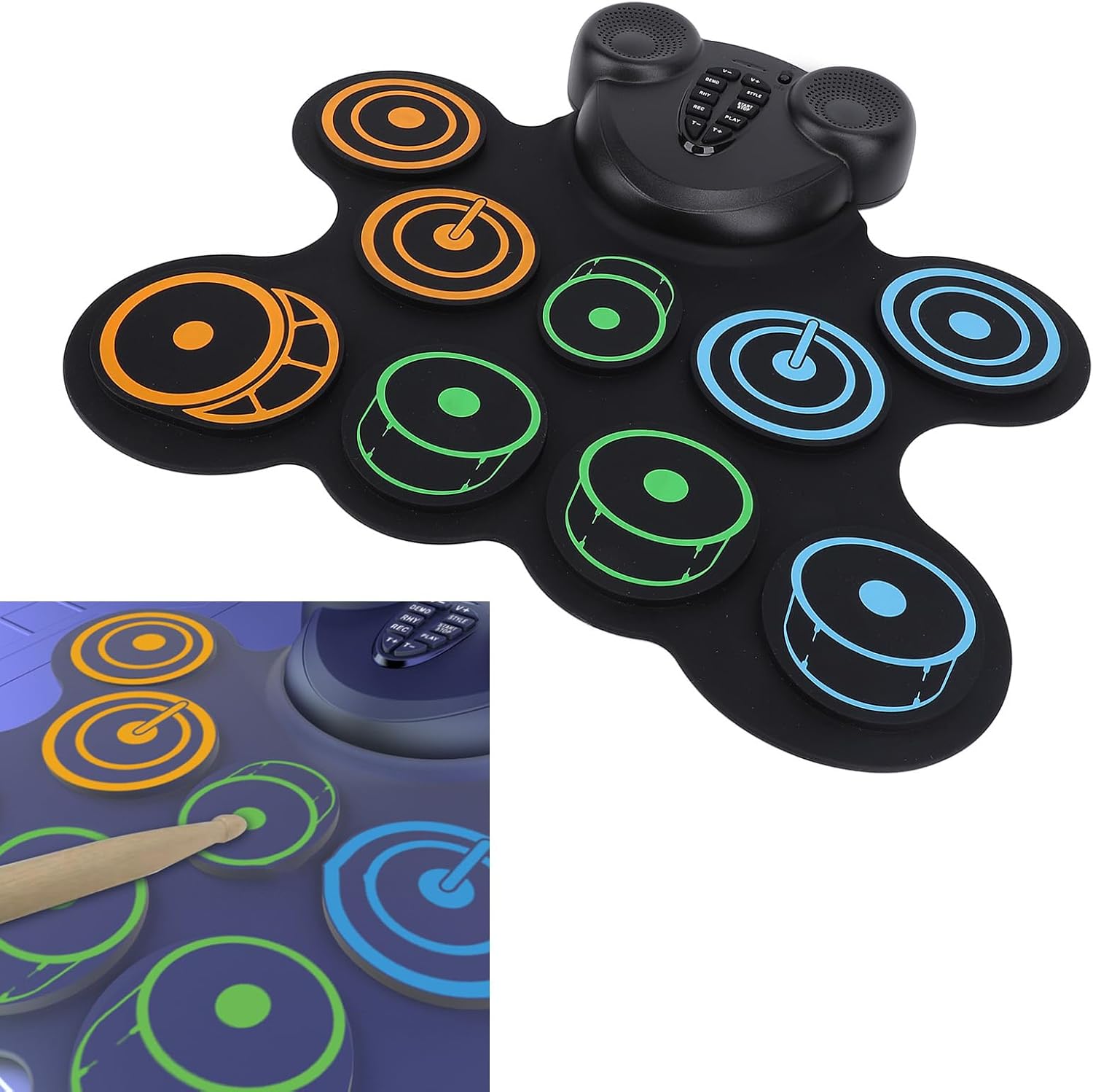 Portabilità: il design leggero e portatile consente agli utenti di riprodurre musica in qualsiasi momento e ovunque senza un alimentatore esterno. Funzionalità: caricare comodamente il tampone tramite interfaccia USB. Non c'è bisogno di preoccuparsi delle batterie, consentendo un uso facile ed efficiente in viaggio. Funzionalità: doppi altoparlanti integrati. Il design del doppio altoparlante di questo set di batteria offre un suono chiaro e potente, portando un'esperienza musicale coinvolgente con un forte senso del ritmo. Funzione: supporta più giochi di tamburi elettrici, consente agli utenti di esplorare diversi stili musicali e godere di divertimento e creatività sconfinati. Comfort: questi drum pad sono morbidi, offrendo un'esperienza di gioco confortevole e proteggendo le mani da lesioni durante l'uso a lungo termine.