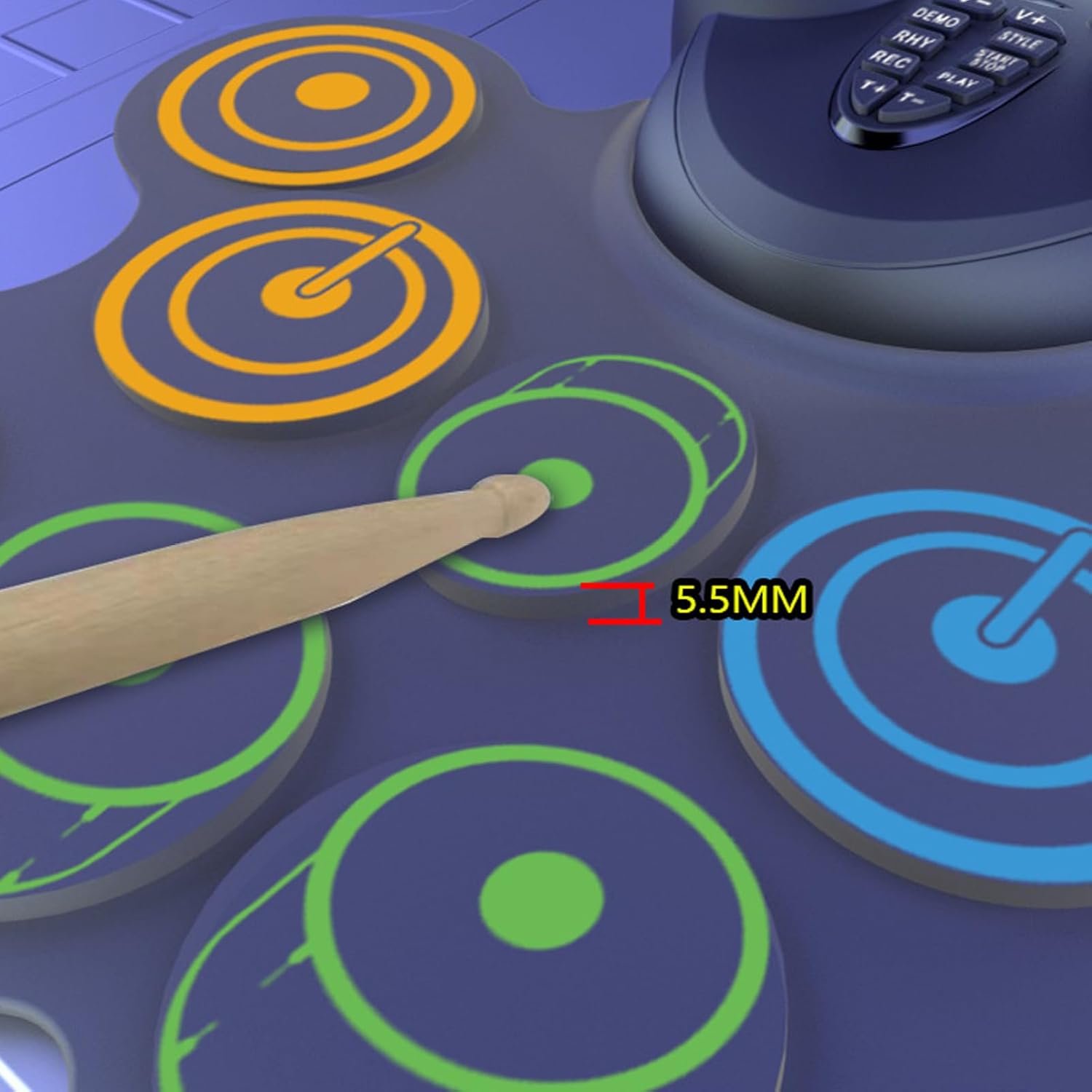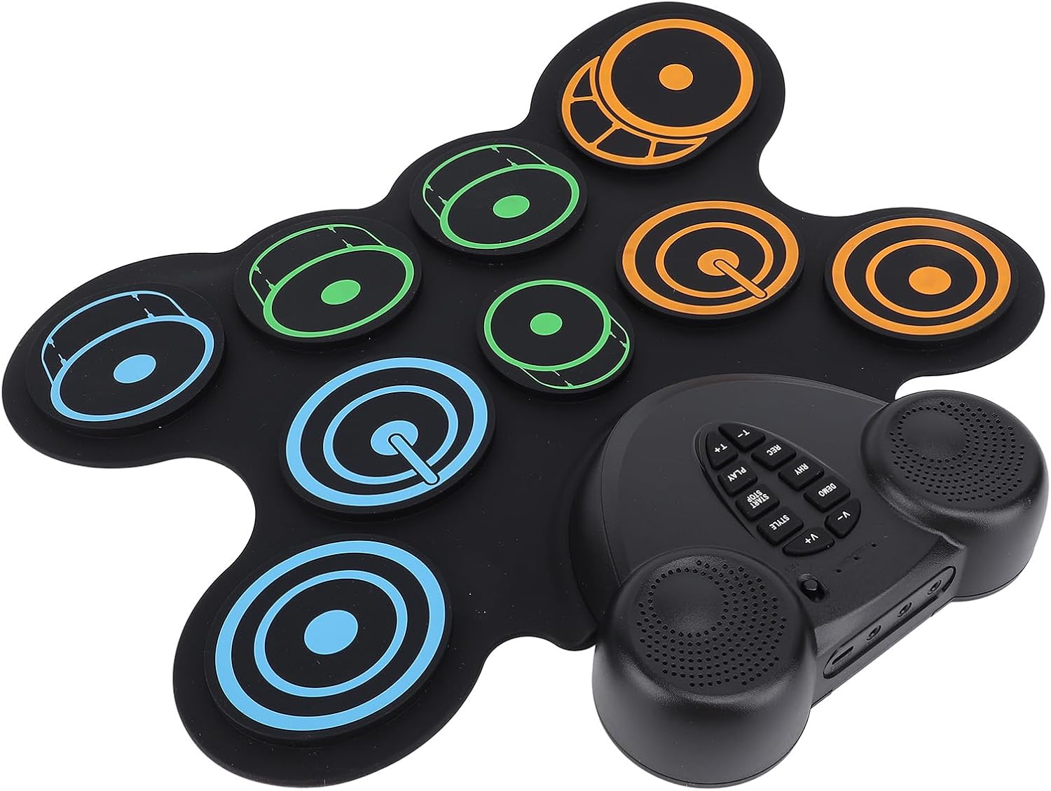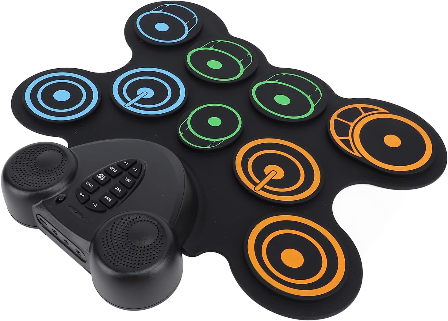 Portabilità: il design leggero e portatile consente agli utenti di riprodurre musica in qualsiasi momento e ovunque senza un alimentatore esterno. Funzionalità: caricare comodamente il tampone tramite interfaccia USB. Non c'è bisogno di preoccuparsi delle batterie, consentendo un uso facile ed efficiente in viaggio. Funzionalità: doppi altoparlanti integrati. Il design del doppio altoparlante di questo set di batteria offre un suono chiaro e potente, portando un'esperienza musicale coinvolgente con un forte senso del ritmo. Funzione: supporta più giochi di tamburi elettrici, consente agli utenti di esplorare diversi stili musicali e godere di divertimento e creatività sconfinati. Comfort: questi drum pad sono morbidi, offrendo un'esperienza di gioco confortevole e proteggendo le mani da lesioni durante l'uso a lungo termine.