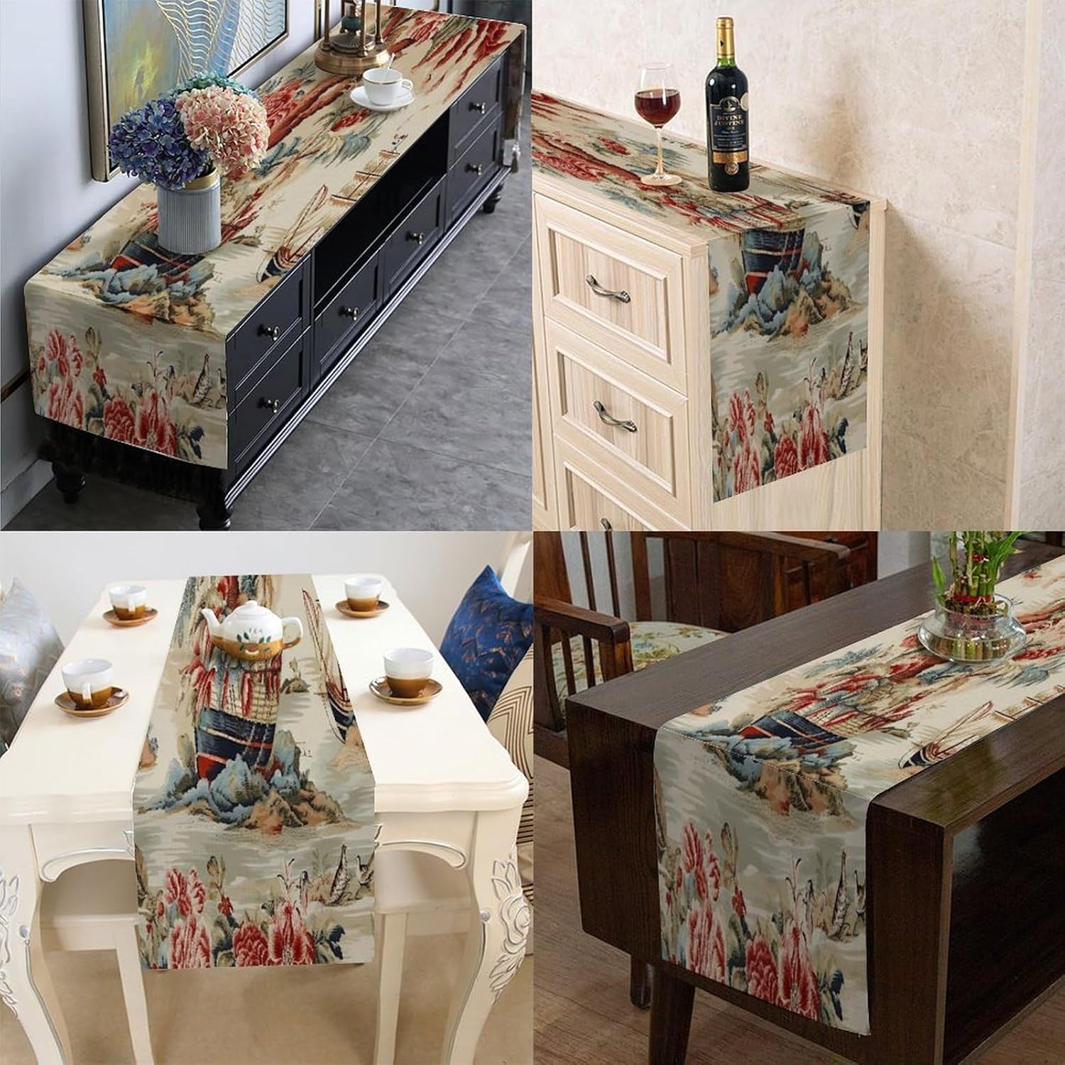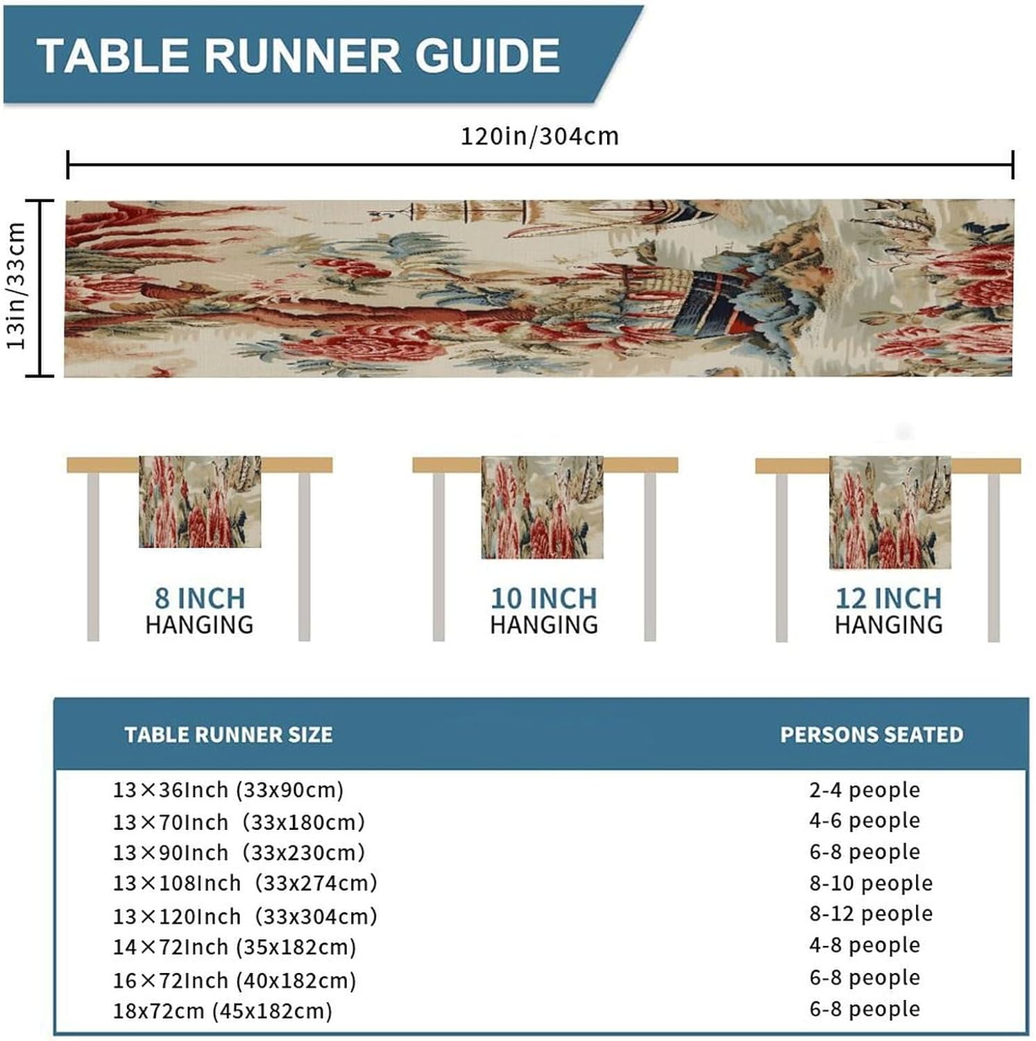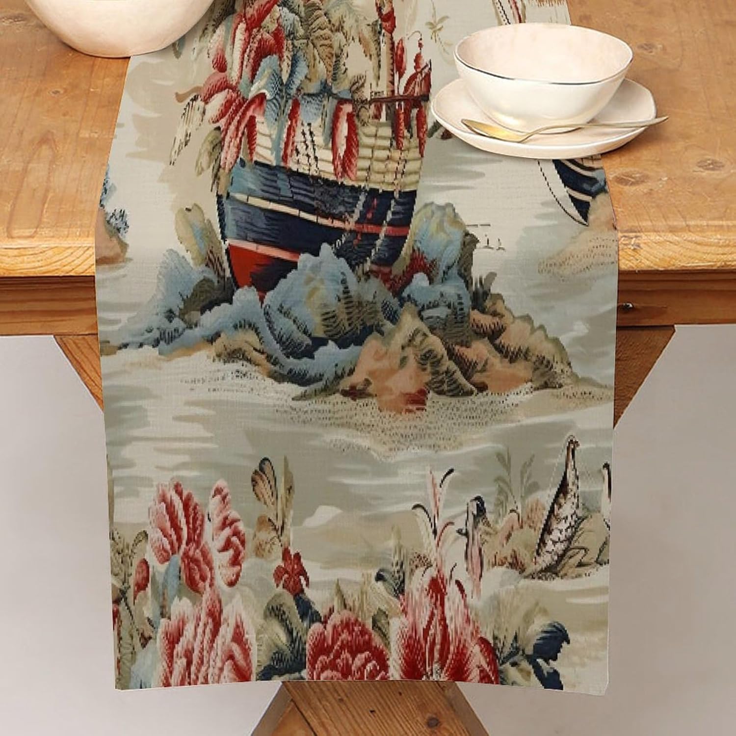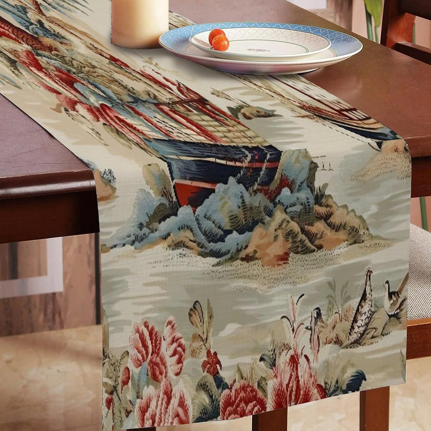Elegante runner da tavola in cotone e lino Moore Manor antico Chinoiserie, runner da tavola 13 x 120 cm, decorazione per sala da pranzo, casa, giardino, ricevimento di nozze