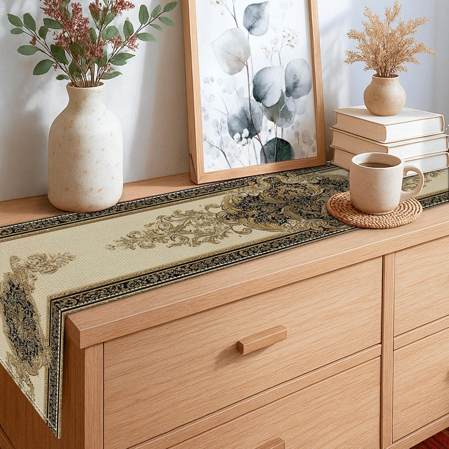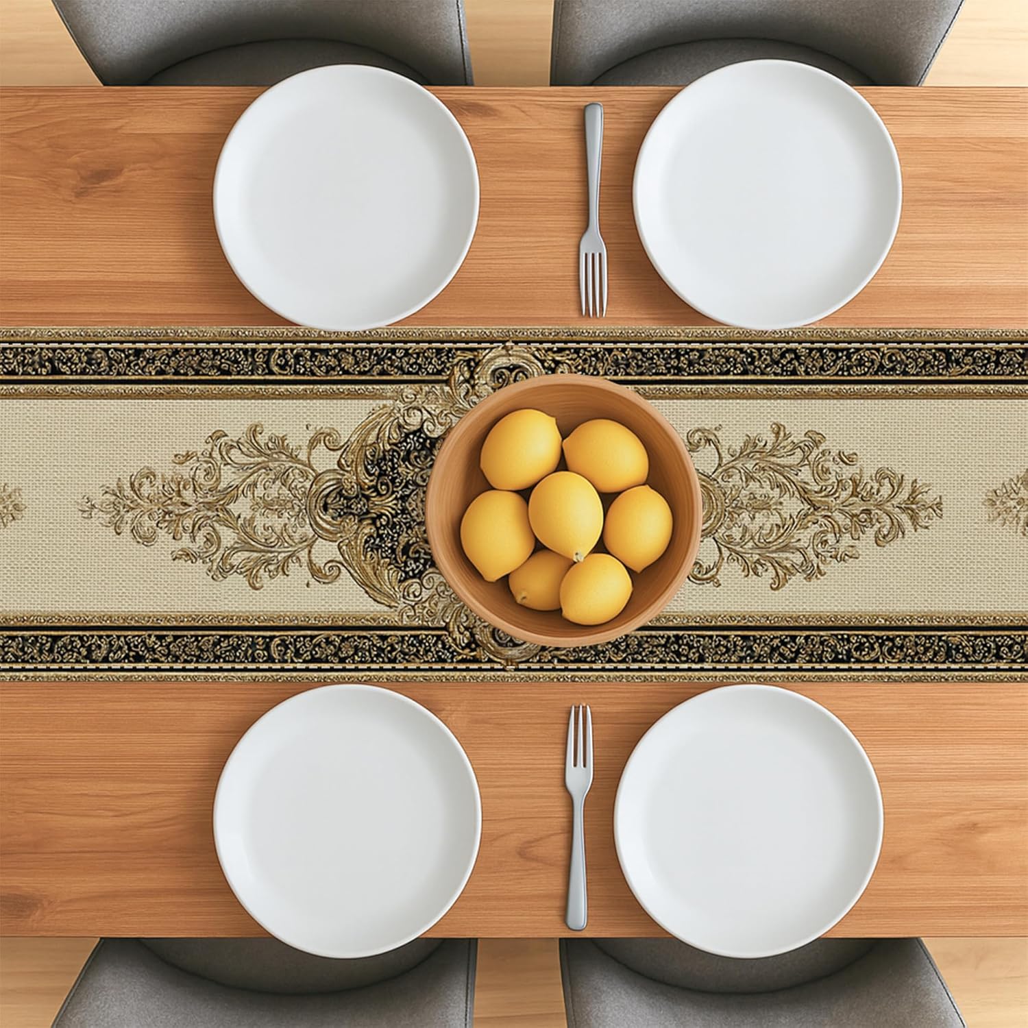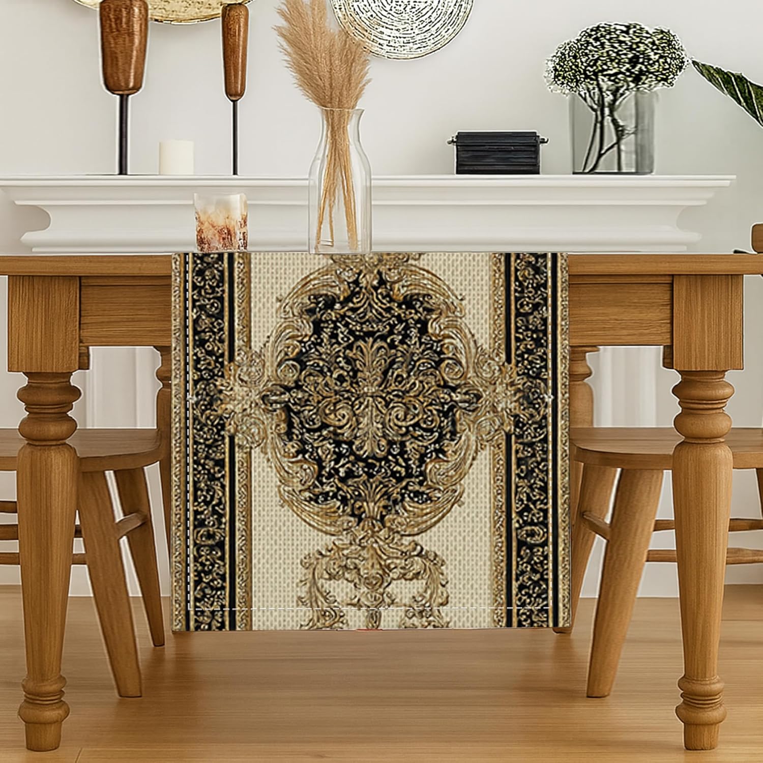 Tessuto in poliestere stile lino: combina la durata del poliestere con il fascino rustico del lino Ottimizzato per l'uso familiare: assicura una presentazione ordinata su superfici comuni da 4 a 6 persone Materiale adatto al bucato: il tessuto facile da pulire supporta lavaggi ripetuti e cicli di asciugatura delicati Tecnologia di inchiostro resistente allo sbiadimento: il processo di stampa avanzato blocca il colore per un impatto visivo di lunga durata Design artistico originale: motivi unici rendono questo pezzo un centrotavola per riunioni di famiglia e celebrazioni