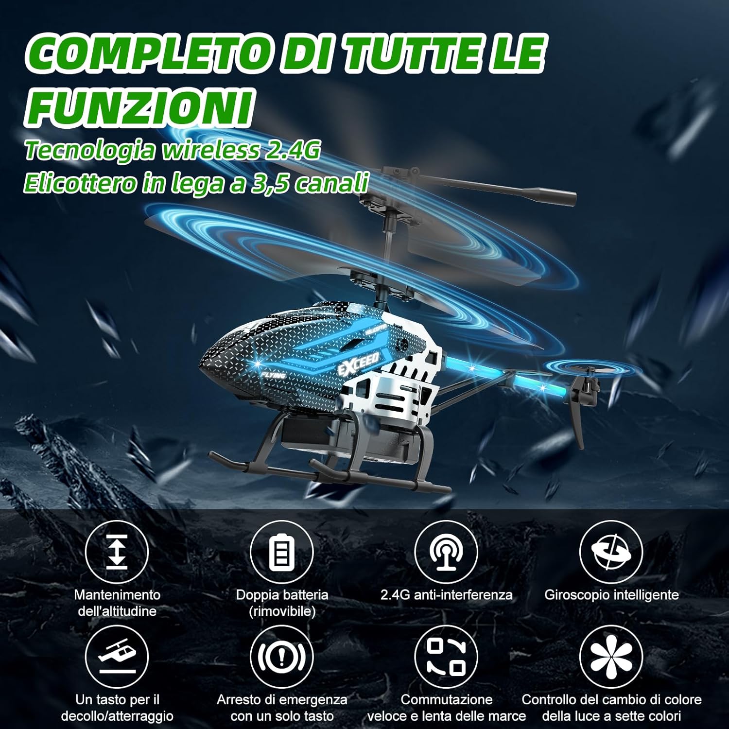✈️【Facile da controllare】Questo elicottero telecomandato a 2,4 GHz è dotato di controllo a 1 pulsante per il sollevamento, arresto di emergenza a un pulsante, cambio di marcia veloce e lento, controllo del cambio di colore delle luci, stabilizzazione automatica dell'altitudine di volo dopo il decollo/atterraggio e regolazione fine per correggere la deriva e l'inclinazione, ed è la scelta migliore per principianti, hobbisti e professionisti! ✈️【elicottero rc con luci LED】Il nostro elicottero telecomandato per bambini è l'intera testa e coda con luci, e si può scegliere liberamente il colore delle luci, un totale di sette colori, rispettivamente, rosso, arancione, giallo, verde, blu, azzurro, viola, con luci LED luminose può essere volato in condizioni di scarsa illuminazione, non più sotto le restrizioni del campo o del tempo. ✈️【Lungo tempo di volo】Questo elicottero radiocomandato per bambini decolla rapidamente con una sola batteria installata, e forniamo due batterie rimovibili che possono essere sostituite in qualsiasi momento, e possono essere caricate tramite cavo USB, ogni batteria richiede solo circa 50 minuti per essere completamente carica, e fornisce circa 12 minuti di tempo di volo continuo, che è molto divertente per i bambini, sia nel soggiorno della vostra casa o fuori nello spazio aperto. ✈️【Elevato potere di tenuta】L'aereo telecomandato può raggiungere un hovering stabile con la funzione di mantenimento dell'altitudine. Con la tecnologia avanzata della pressione dell'aria, può librarsi automaticamente a una certa altitudine dopo il decollo. Adotta la tecnologia RC a 2,4 GHz con segnale stabile e funzione di non interferenza, che consente di far volare più elicotteri contemporaneamente senza interferenze e di rispondere con precisione ai comandi operativi. ✈️【Perfette prestazioni di volo】Questo elicottero telecomandato con luci è realizzato in materiale leggero e super duro, che è resistente alle cadute e agli incidenti e lo rende facile e semplice da controllare. Adatto a tutte le età, sia gli adulti che i bambini possono trovare il divertimento di volare con esso, anche un regalo perfetto per il compleanno, Natale, Halloween, altri festival.