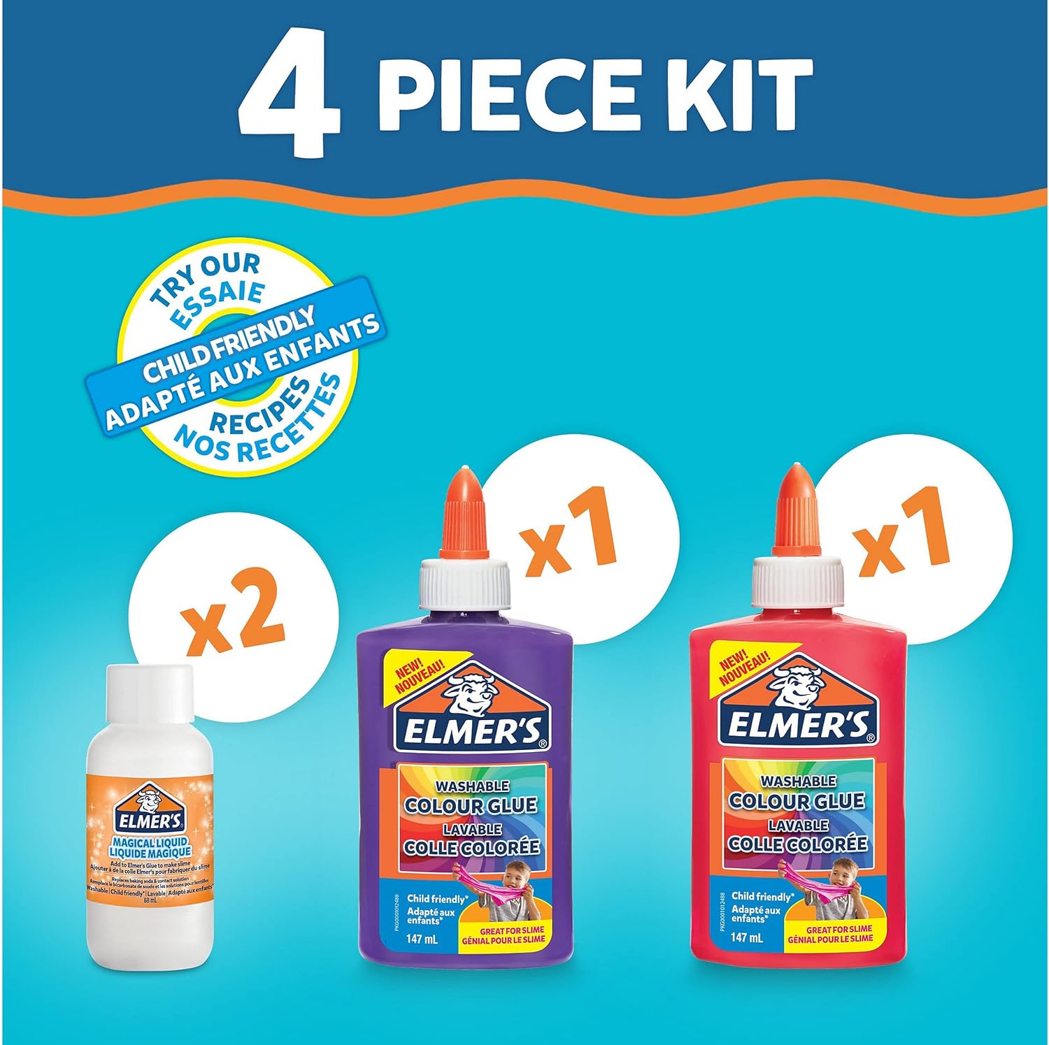 Realizza slime brillanti e vivaci con questo kit completo per slime colorato Perfetta per realizzare colorati slime con la colla senza coloranti alimentari Il liquido magico Elmer's è una soluzione tutto in uno che trasforma la colla Elmer's in uno slime irresistibilmente divertente. Aggiungi il liquido magico gradualmente per ottenere la consistenza desiderata Lavabile con acqua e sapone per una pulizia immediata e realizzata con formula adatta ai bambini (non adatta ai bambini sotto i tre anni) Il kit contiene: 1 flacone di colla colorata rosa (147 ml), 1 flacone di colla colorata viola (147 ml), 2 flaconi di liquido magico (68 ml ciascuno)