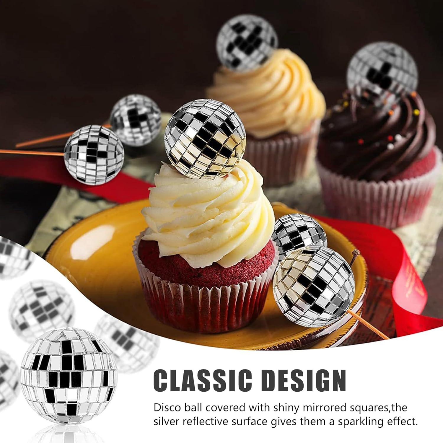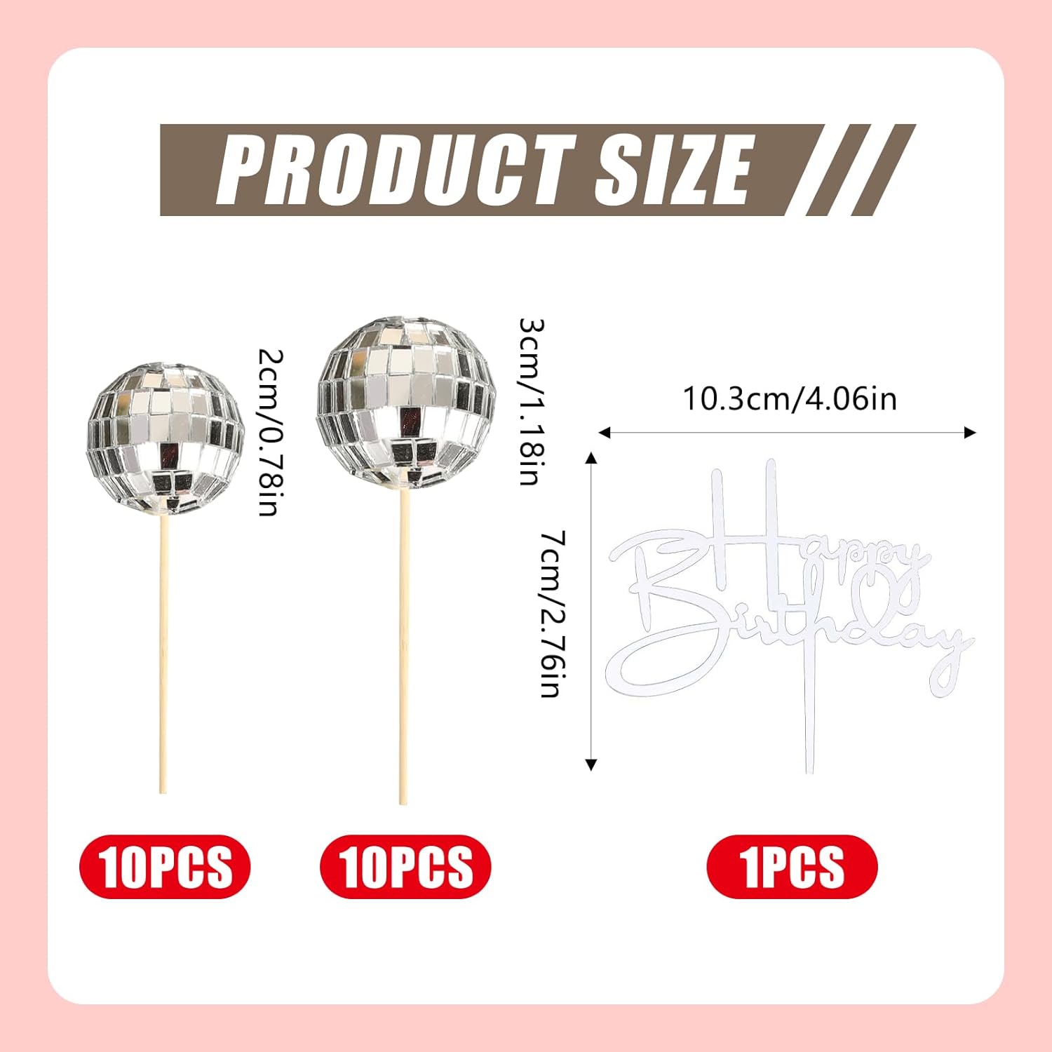 Set di decorazioni per torte a sfera da discoteca: riceverai un totale di 21 decorazioni per torte da discoteca, tra cui 10 palline da 3 cm e 10 palline da 2 cm, ogni palla è dotata di uno spiedino di legno, la profondità di inserimento può essere regolata in base alle diverse dimensioni della torta. Materiale di alta qualità: l'interno della torta da discoteca è realizzato in schiuma resistente e l'esterno è realizzato in specchio di vetro, che non cadrà, sicuro, bello e robusto, durevole. Design lucido: ogni sfera d'argento per decorazioni per torte è decorata con un quadrato scintillante a specchio che cattura e rifrange da ogni angolazione, aggiungendo brillantezza alla tua torta e a tutte le decorazioni per le tue feste! Diverse dimensioni: la decorazione per torta a sfera da discoteca ha 2 diverse dimensioni con diametro di 2 cm e 3 cm, la combinazione di diverse dimensioni rende la torta più squisita. Ampia gamma di utilizzi: le decorazioni per torte da discoteca sono perfette per aumentare la diffusione di qualsiasi festa, come feste a tema anni '70, palle da discoteca, feste di compleanno, matrimoni, feste per baby shower, feste a tema retrò, ecc. Aggiungi un tocco di brillantezza a torte, cupcake, torte e altro ancora per un look accattivante da dessert a qualsiasi celebrazione.