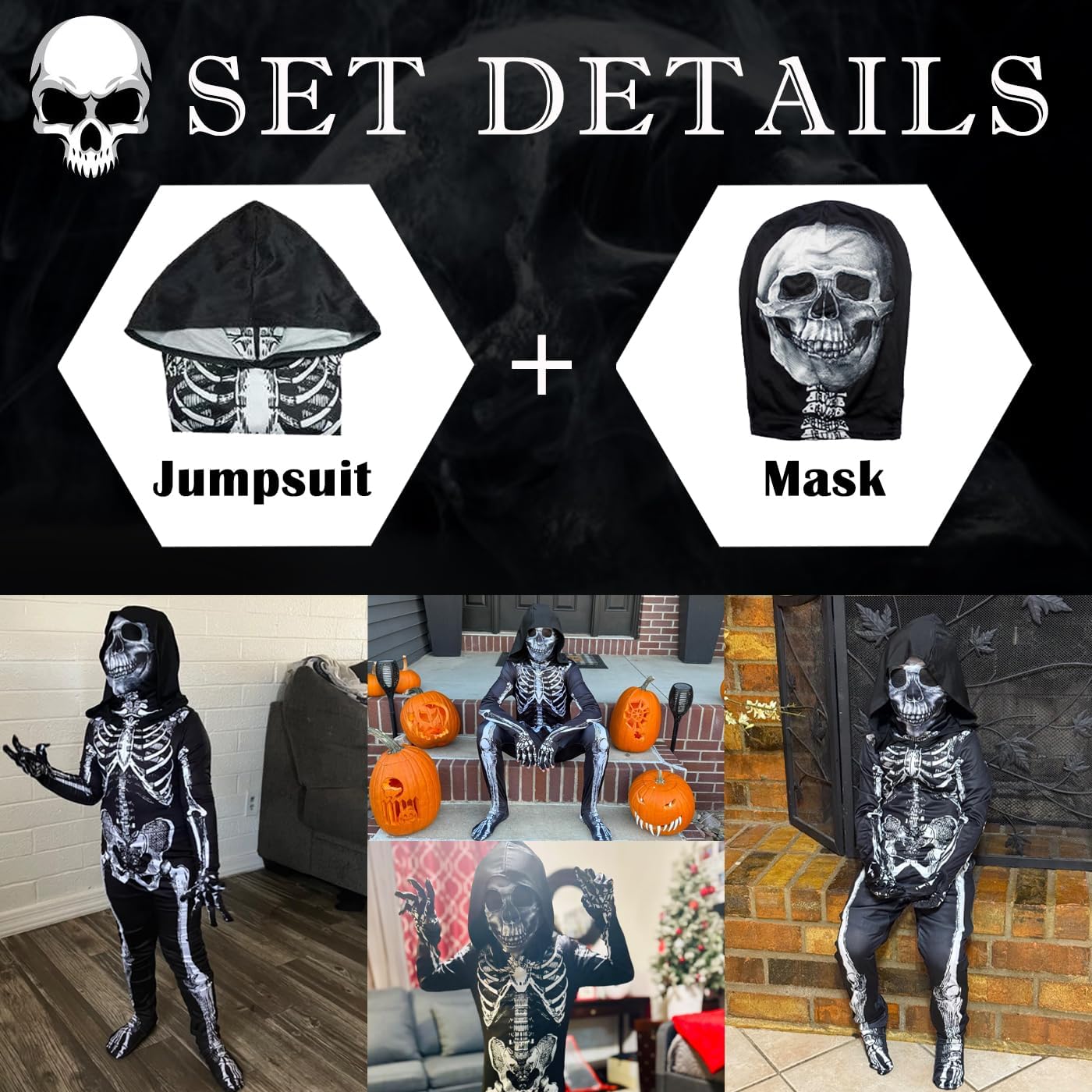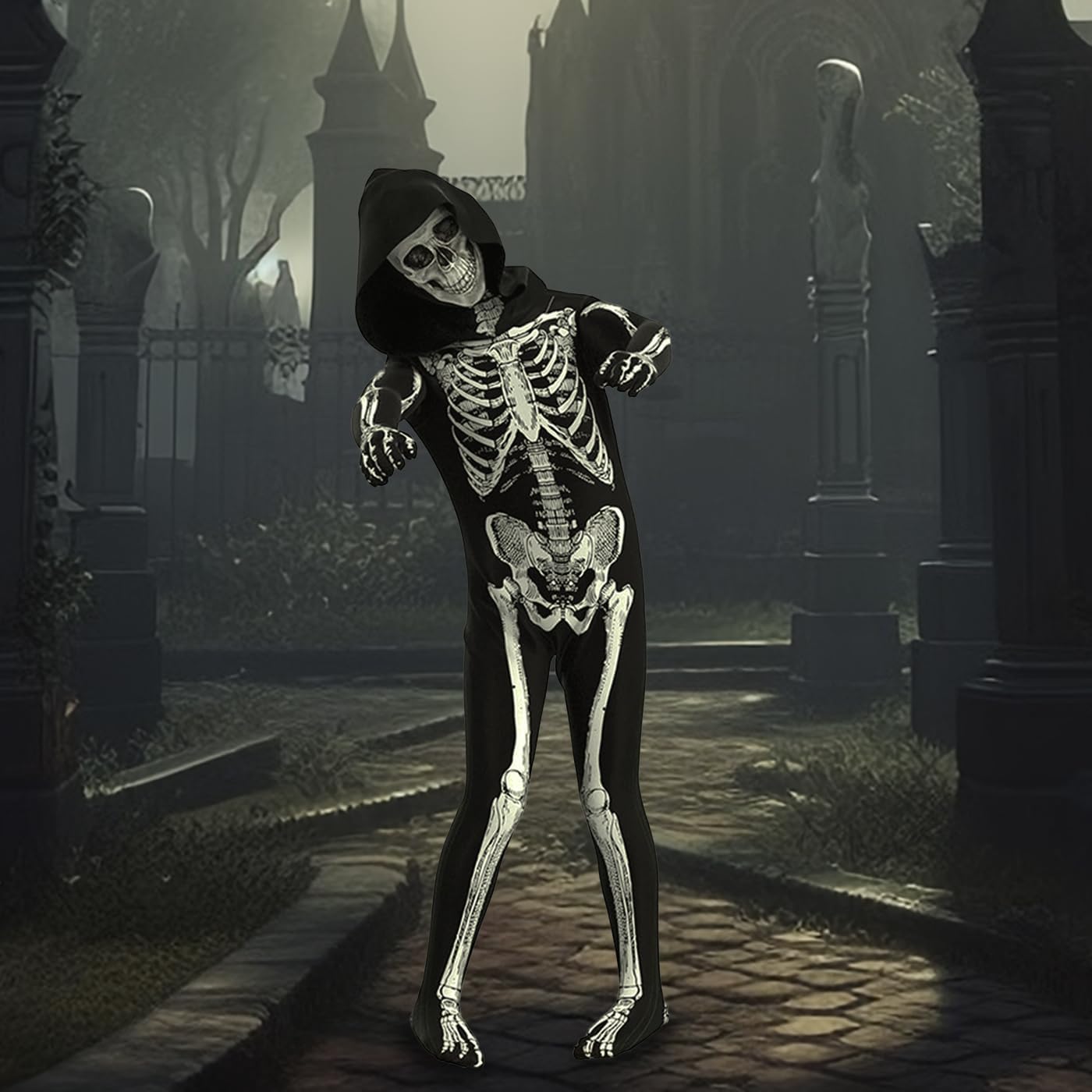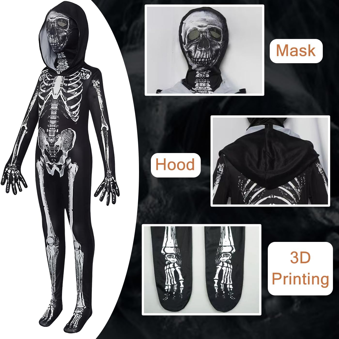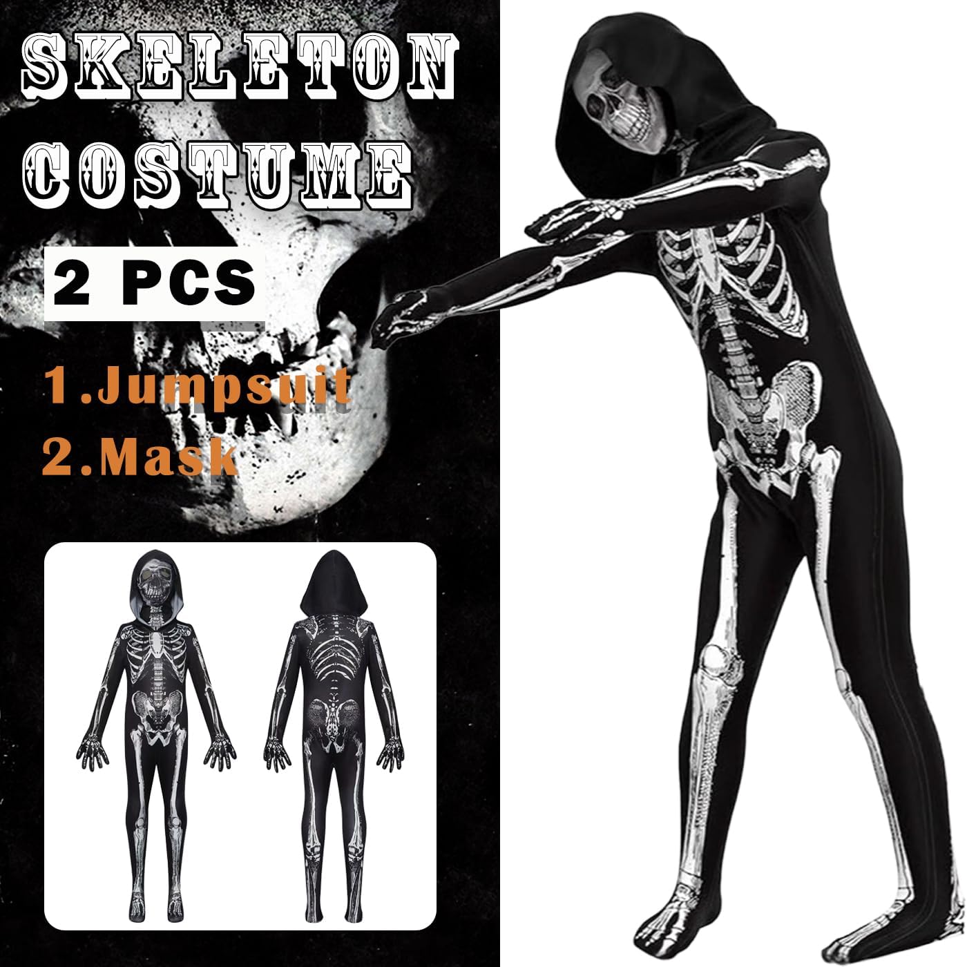 La confezione contiene: Tuta + Maschera. Materiale principale: poliestere. Tessuto morbido e confortevole che protegge meglio la pelle delicata dei bambini. Regalo perfetto per bambini e bambine. Costume da scheletro unisex per bambino per Halloween. Scheletro stampato sul davanti e sul retro, con cappuccio, tuta a maniche lunghe con cappuccio, vestibilità ampia. Il tessuto è elastico e si adatta alla maggior parte dei tipi di corpo. Adatto per feste in maschera, giochi di ruolo, feste di compleanno, balli, Halloween, Pasqua, Natale. Cura dell'indumento: lavabile a mano, lavare accuratamente in acqua fredda o a temperatura normale.Non usare candeggina o acqua calda in quanto potrebbe danneggiare i vestiti.