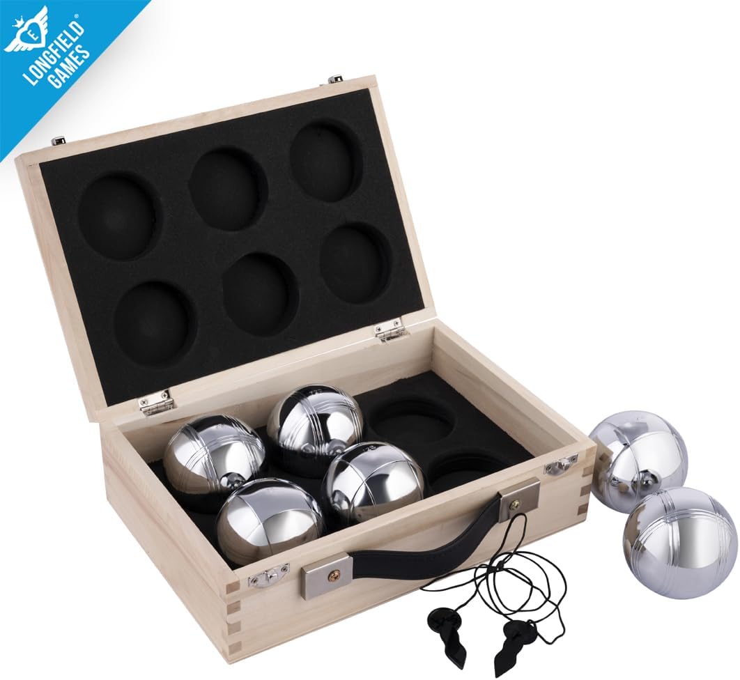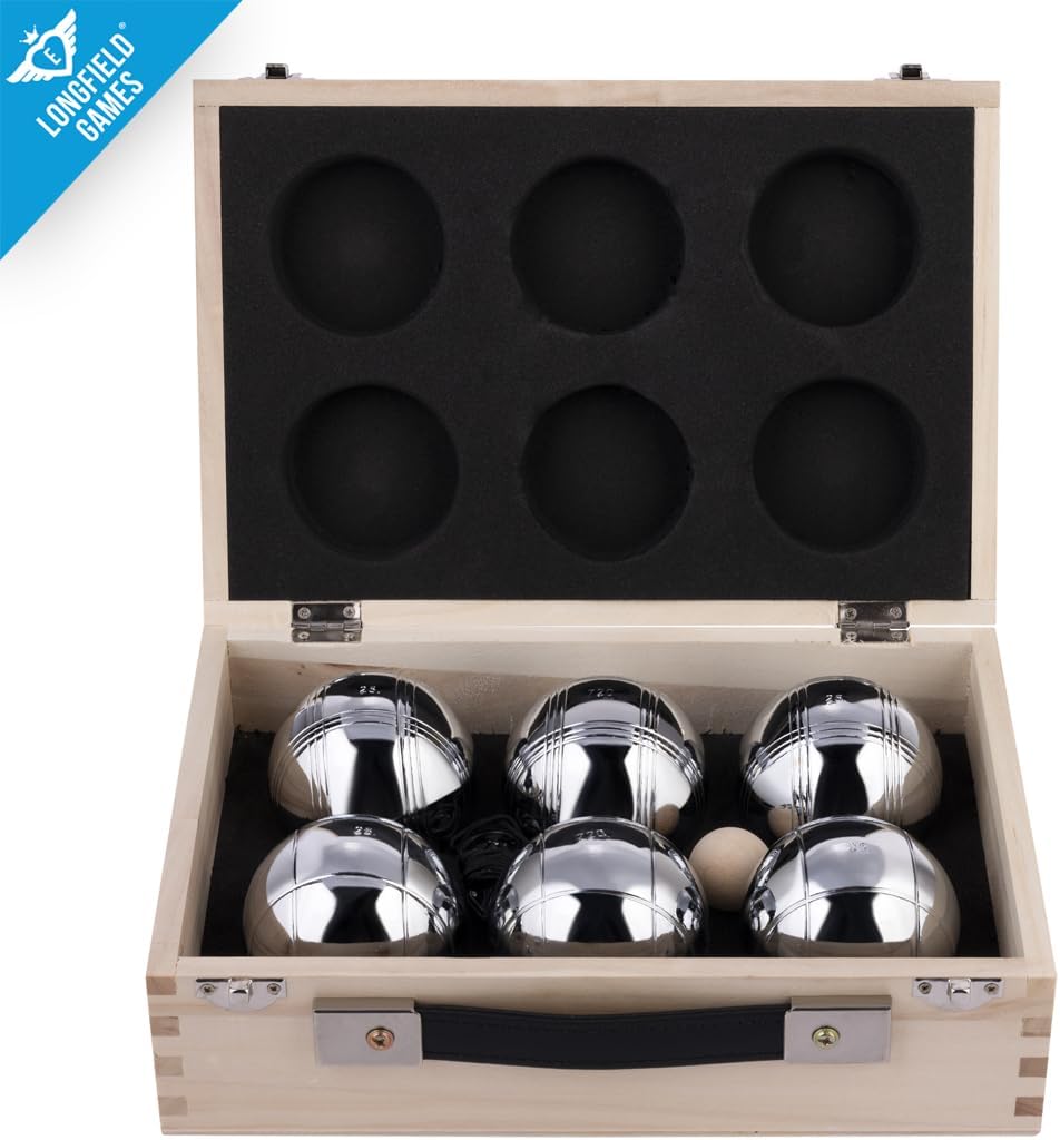 Bel set di bocce per il tempo libero, per 2 giocatori TRIPLETTE : 2 x 3 bocce con segni diversi per poter distiguerle meglio Set con sfere in metallo per giocare alla variante petanca " triplette" composto da 6 elementi di peso di 720 grammi e di diametro 74 mm.la scatola viene completata da 1 pallini in legno e 1 misuratore distanze. Le sfere sono ospitate in una una cassetta in legno rettangolare gradevole alla vista . Il materiale in legno garantisce grande stabilità alle bocce durante il trasporto. Non essere propriamente adatte per il gioco dei più piccoli