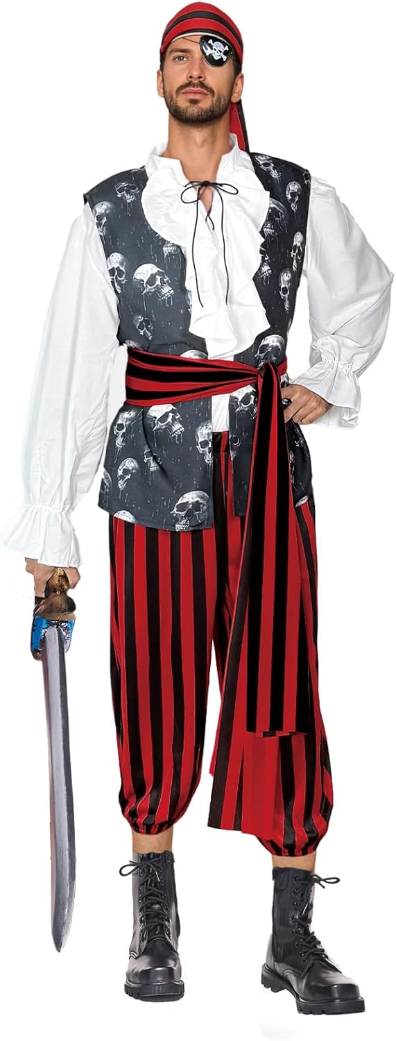 Vesti i panni di un formidabile capitano di mare con questo costume da pirata per uomo dallo stile audace! Il set comprende una camicia bianca con colletto arricciato, un gilet nero con stampa di teschi, pantaloni a 3/4 con strisce rosse e nere, una cintura rossa, una bandana abbinata e una benda sull'occhio. Questo costume comodo e caratteristico è ideale per Halloween, feste in maschera, cosplay o spettacoli. Tutto ciò di cui hai bisogno è una sciabola o una finta pistola per diventare un vero corsaro!