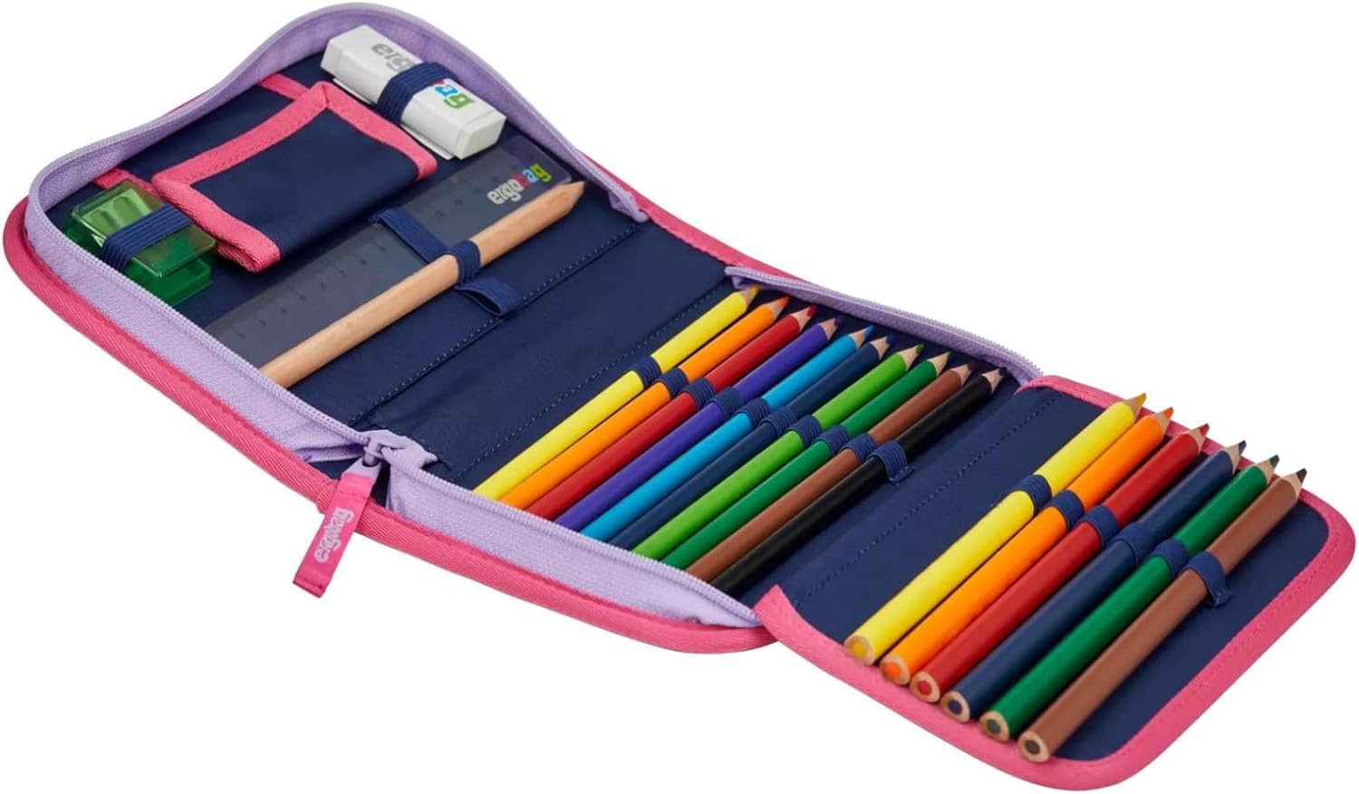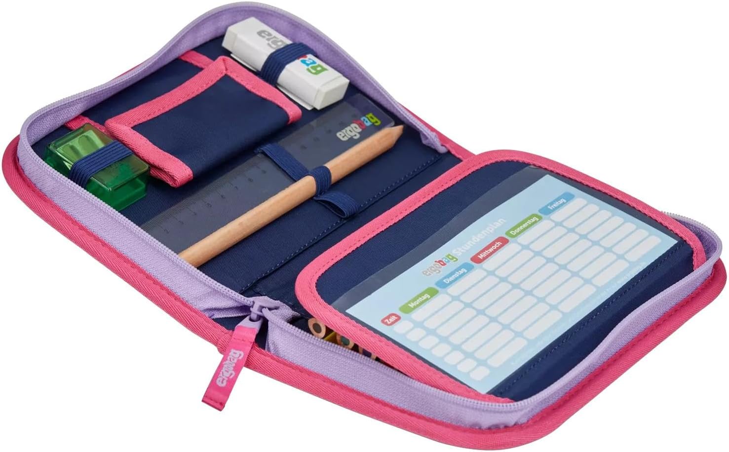 Perfekte Grundausstattung – Die Mäppchen sind 22-tlg. befüllt mit 6 dicken und 10 dünnen Lyra-Buntstiften, sowie einem Bleistift. Außerdem sind Lineal, Radiergummi & Spitzer enthalten. Alle Dinge, die man als Schulkind braucht, übersichtlich organisiert i Scomparto per monete e scomparto trasparente – Non ricordi l'orario? Niente paura! Sul risvolto dell'astuccio è presente una finestra con un orario vuoto. È incluso inoltre uno scomparto per monete, cartucce per pennarello o altri piccoli oggetti. Design ergobag – I nostri astucci rigidi sono disponibili nei design della collezione attuale e si abbinano perfettamente a tutti gli zaini e agli accessori ergobag omonimi. Materiali ecosostenibili – Per i nostri prodotti ergobag utilizziamo tessuti sostenibili, in parte realizzati con bottiglie in PET riciclate. Questo astuccio è realizzato con bottiglie da 3,3 0,5 L. Prodotti in modo responsabile – In collaborazione con bluesign, ci impegniamo per una produzione ecosostenibile e, in qualità di membro della Fear Wear Foundation, miglioriamo le condizioni di lavoro nei nostri stabilimenti di produzione.