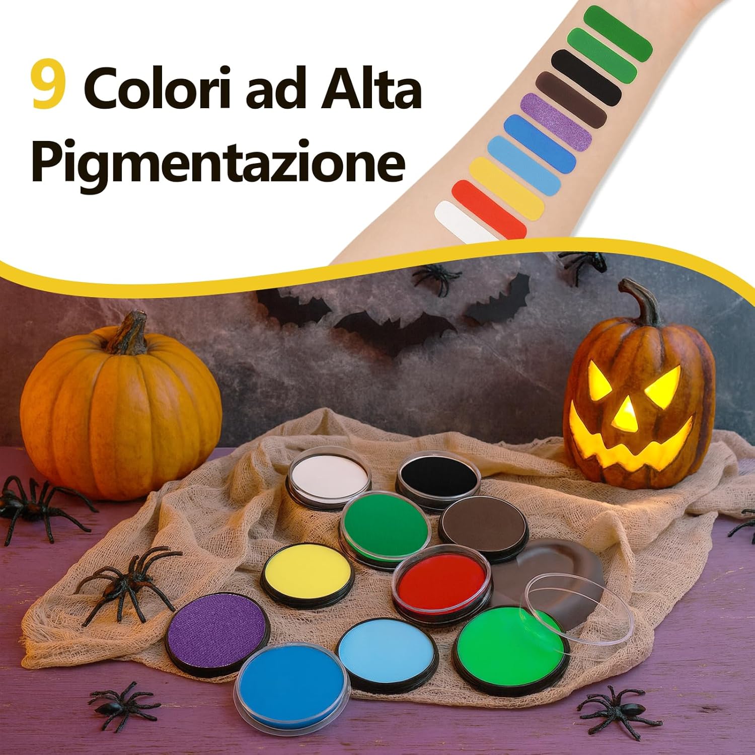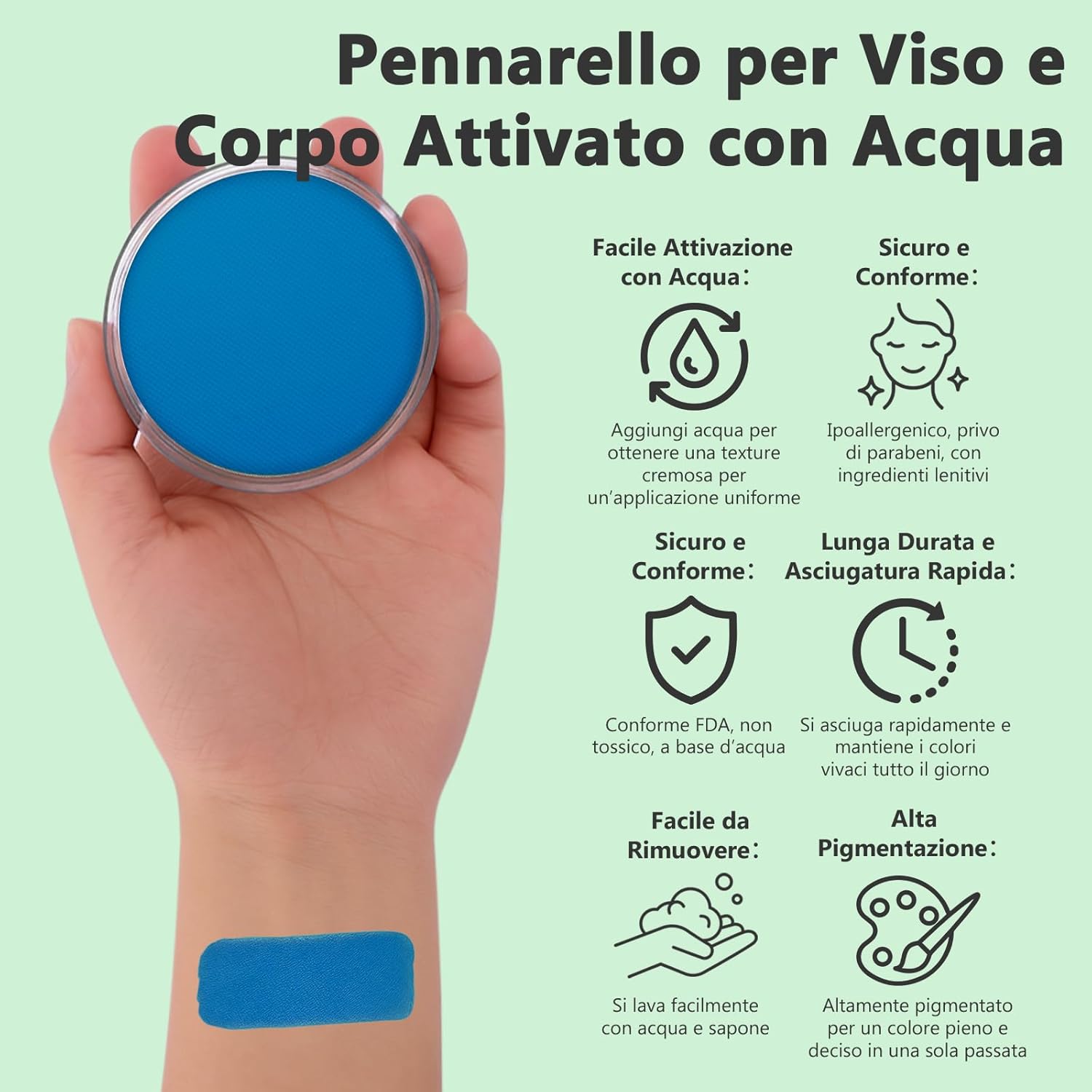 【Pigmenti vivaci e facilmente miscelabili】: 9 tonalità altamente pigmentate (Bianco, Nero, Rosso, Giallo, Azzurro, Blu, Viola, Marrone, Verde) per creazioni artistiche audaci o delicate. I colori si possono mescolare per look unici. La resa intensa rimane luminosa sulla pelle – ideale per SFX di Halloween, cosplay o esperimenti creativi quotidiani. 【Formula sicura e delicata】: Colore per il corpo a base d’acqua, atossico. Senza parabeni, ipoallergenico e arricchito con ingredienti lenitivi per la pelle. Sicuro per bambini (3+) e pelli sensibili. Si consiglia un test preliminare di 24 ore sull’avambraccio prima dell’uso. 【Facile da applicare e rimuovere】: Colore attivato con acqua che si applica uniformemente con pennelli, spugne o dita – senza lasciare striature. Asciuga rapidamente con una finitura leggera e senza crepe. Si rimuove facilmente con acqua e sapone o salviette struccanti – senza bisogno di sfregare. 【Professionale e adatto ai principianti】: Che si tratti di clown, scheletro, vampiro, zombie, gothic, Día de los Muertos o altri temi – è facile realizzare look classici e vari. Basta una piccola quantità per ottenere effetti make-up intensi con colori vivaci e di lunga durata. 【Versatile per eventi e vita quotidiana】: Non solo per Halloween! Perfetto per feste a tema, carnevale, fiere cosplay, recite scolastiche, teatro, balli, parate del Pride, eventi sportivi, festival – o per look creativi nella vita di tutti i giorni.