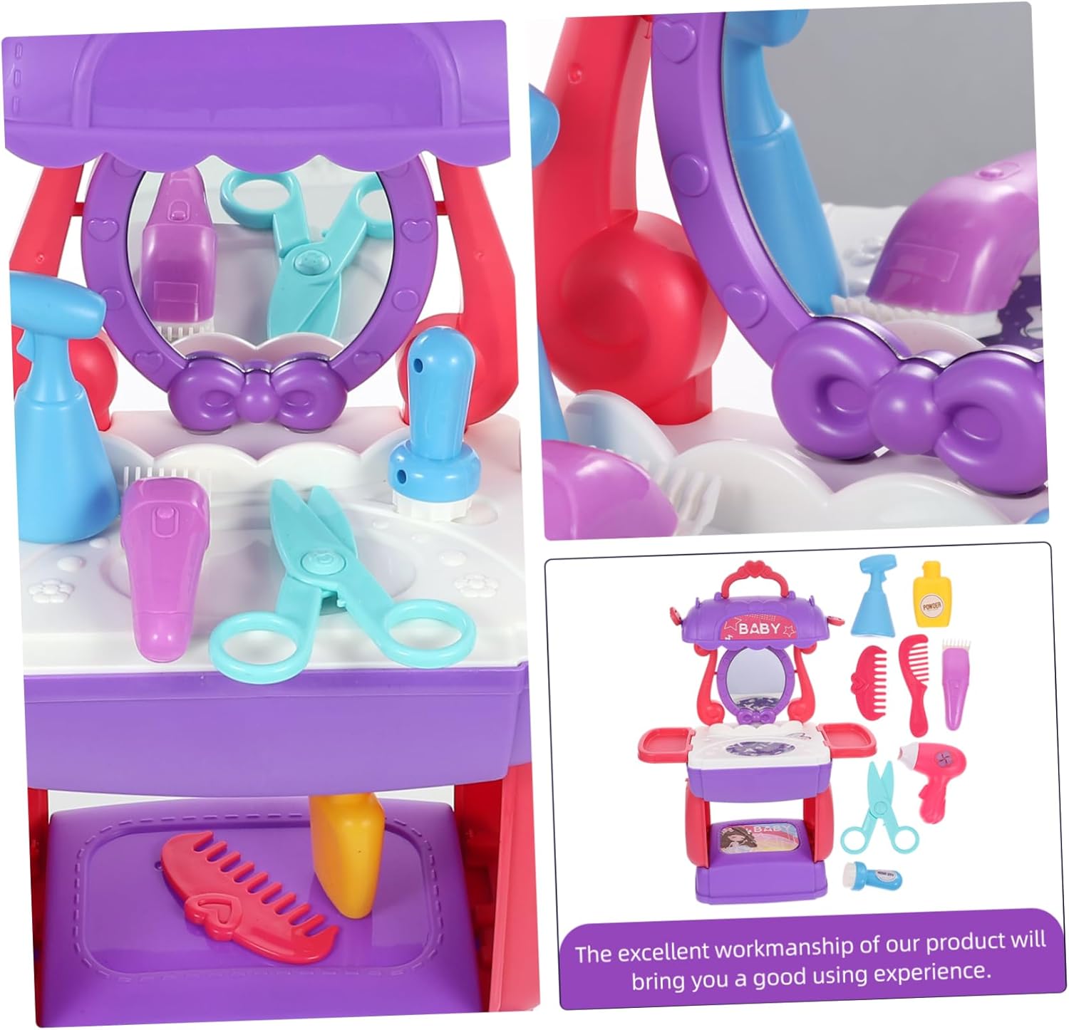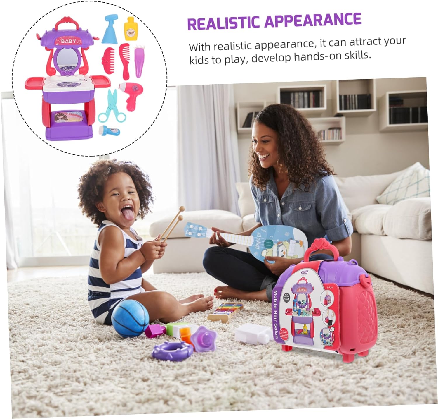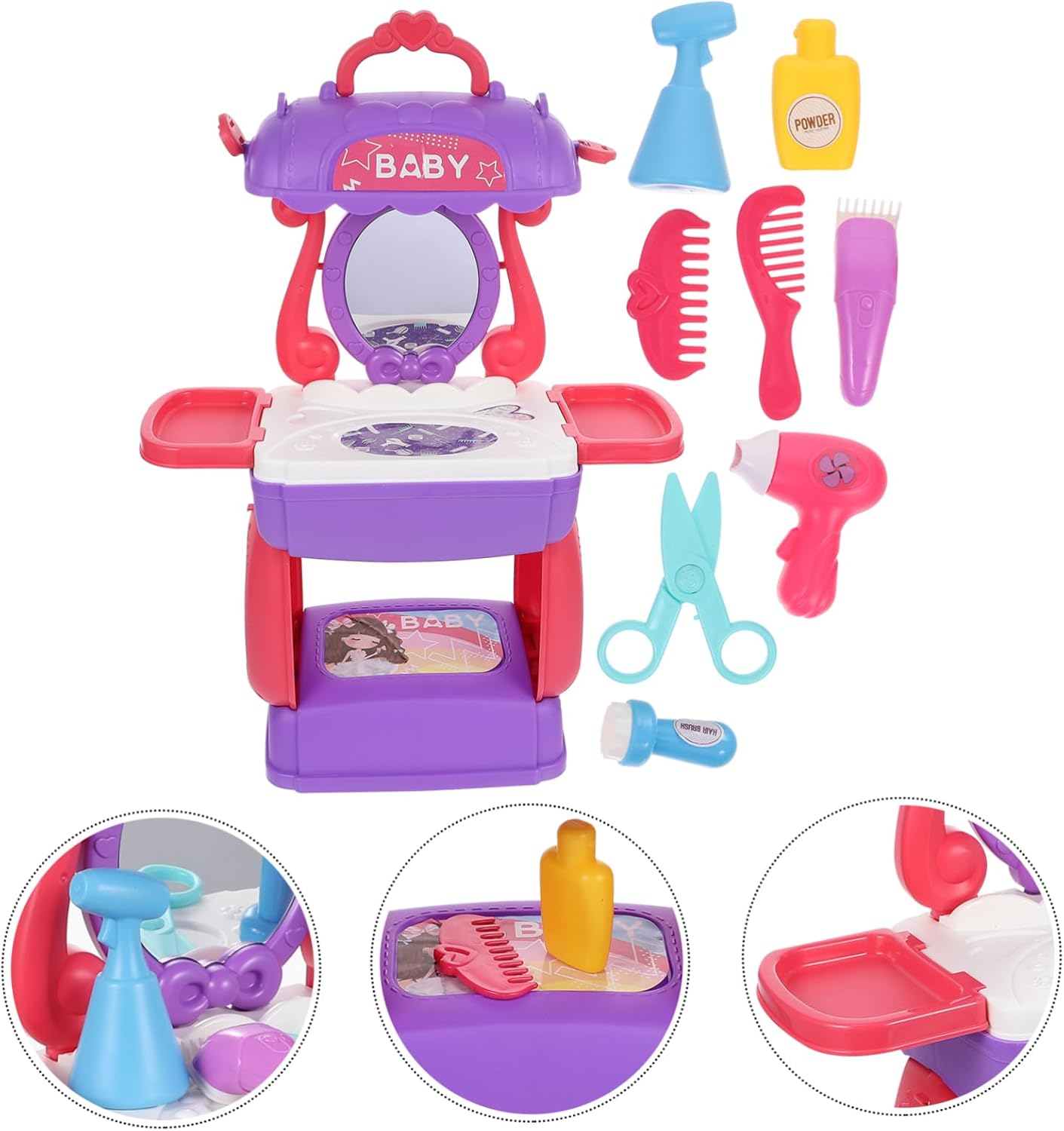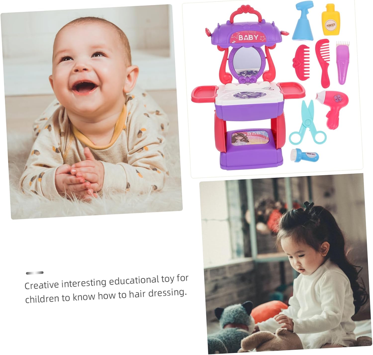 Strumento di simulazione per parrucchiere - design a valigia portatile, tutti gli accessori per parrucchieri possono essere facilmente riposti in questa custodia cosmetica pieghevole e portati ovunque e in qualsiasi momento, set da parrucchiere Simulazione giocattolo per parrucchieri: le bambine possono giocare di ruolo, giochi di parrucchiere, giochi di salone di bellezza e travestimenti, stimolando l'immaginazione e la creatività del parrucchiere. Divertente giocattolo per bambini in plastica per la bellezza dei capelli: i genitori possono accompagnarli a lavorare insieme per migliorare la relazione genitore-figlio. Giocattolo per l'educazione precoce Cognitivo - giocattolo didattico creativo e interessante per imparare a fare il parrucchiere, gioco di ruolo cognitivo - questo articolo è realizzato in plastica di alta qualità per un uso sicuro, simulazione dell'acconciatura