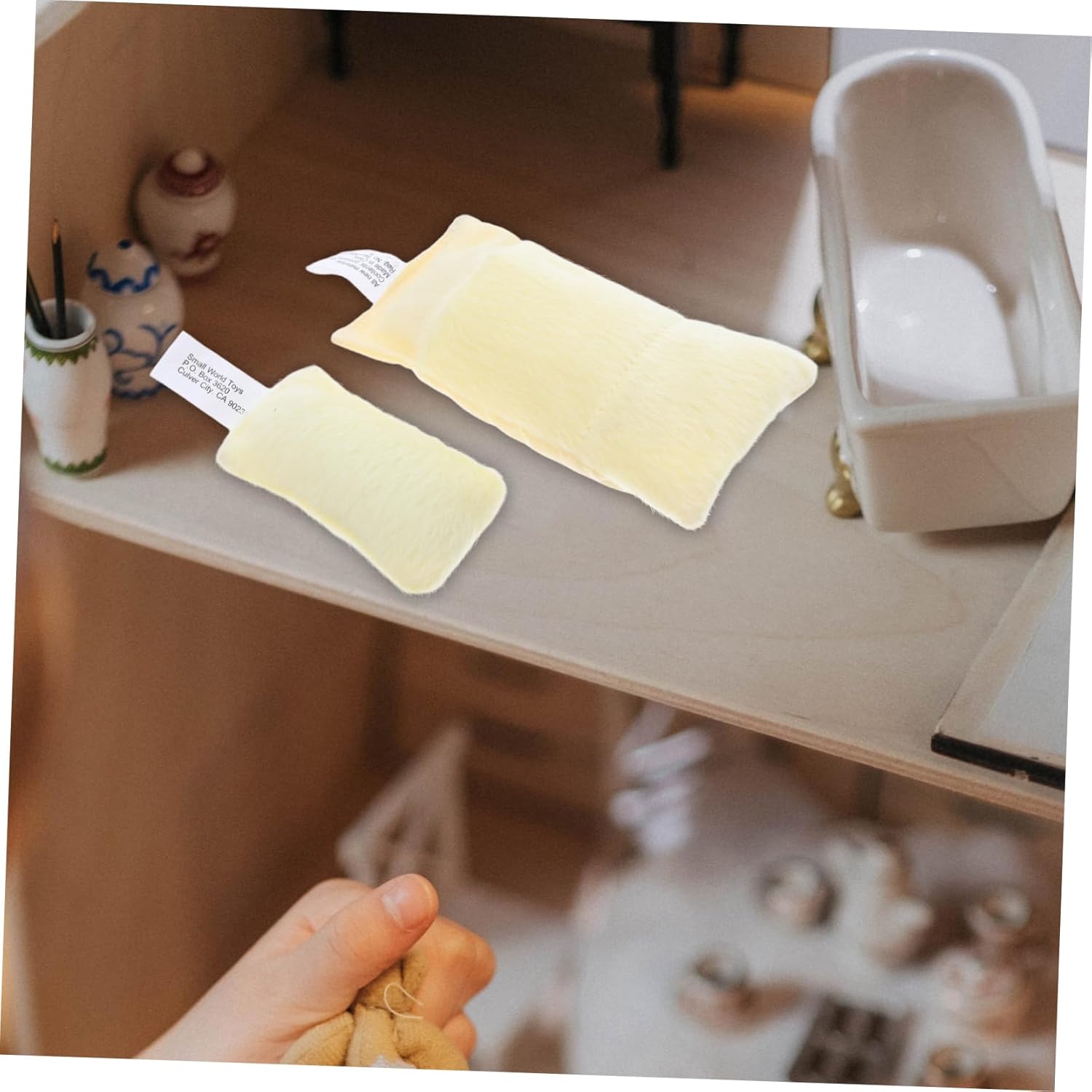 Miniatura autentica: crea un ambiente più realistico e attraente nel tuo letto in miniatura con il set di biancheria da letto per bambole in miniatura, composto da sacco a pelo e cuscino Compatto e portatile: questo set di biancheria da letto piccolo e portatile è adatto a bambole di varie dimensioni e consente una facile decorazione in movimento Gioco di ruolo fantasioso: incoraggia il gioco di ruolo fantasioso con fantastici accessori per bambole e aiuta i bambini a conoscere ruoli e responsabilità Aggiunta elegante: ideale per la camera da letto della tua casa dei giocattoli o per la camera dei bambini, questo set dona all'arredamento del tuo letto della casa delle bambole in miniatura un tocco di bello e confortevole: realizzato in cotone tessuto, tessuto morbido e imbottito in cotone, questo set di biancheria da letto per la casa delle bambole è comodo e facile da pulire