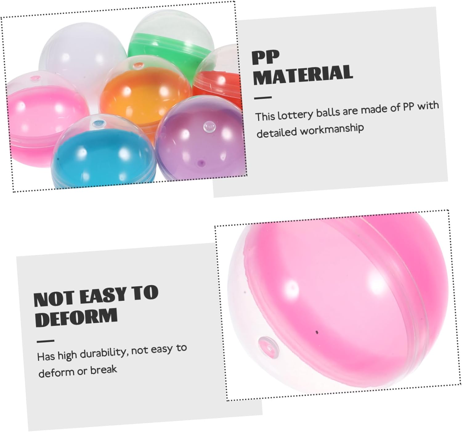 Palline della lotteria senza soluzione di continuità: le capsule vengono utilizzate come contenitori di premi per premi, regali per feste, cacce al tesoro e a premi, gare a sorpresa e piccole palline della lotteria Palline da gioco sferiche: la pallina della lotteria è molto comoda, devi solo inserire la pallina della lotteria, eliminando il problema della lotteria manuale. palline della lotteria per l'intrattenimento Palline di plastica senza cuciture: sono abbastanza resistenti, non si deformano o si rompono facilmente e possono servirti a lungo Palline per feste di attività: sono perfette per competizioni, riunioni annuali, attività ricreative e altro ancora, con le loro dimensioni ridotte e il design leggero, sono molto facili da trasportare e selezionare palline Palline di apertura della lotteria: ideali per programmi di arti e mestieri, palline decorative, feste, carnevale, giochi per feste di Natale, palline della lotteria