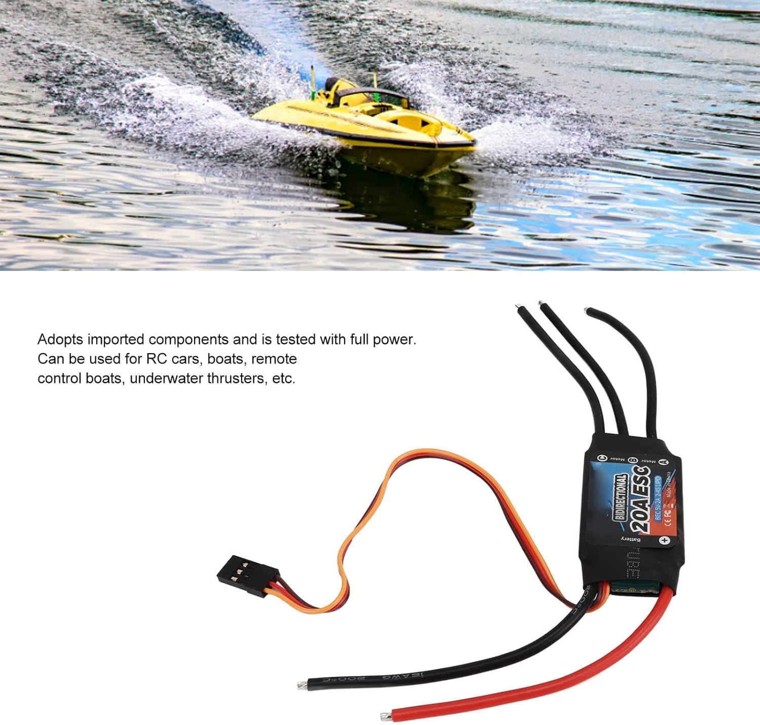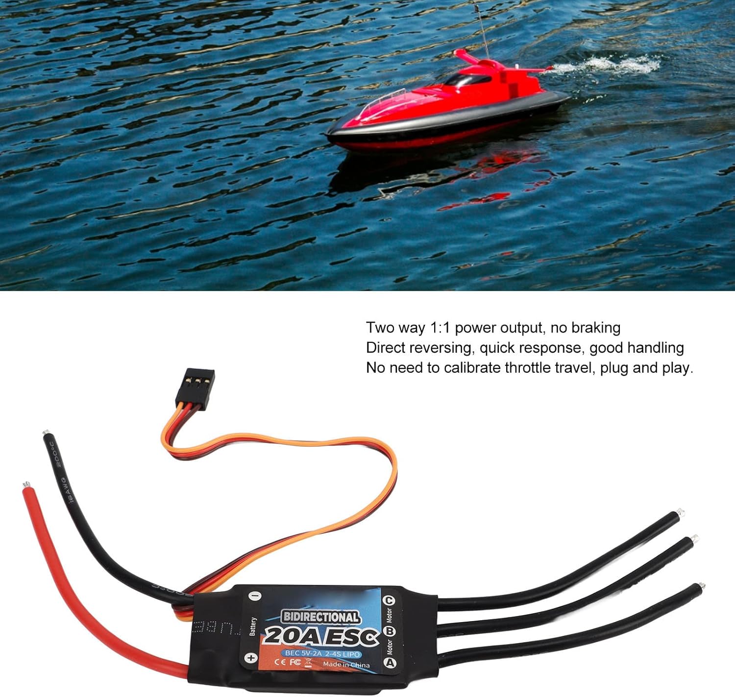 Ampia applicazione: questo ESC brushless può essere utilizzato per auto RC, barche, barche telecomandate, propulsori subacquei, ecc Prestazioni eccellenti: l'ESC è dotato di uscita di potenza 2 vie 1:1, nessun freno, retromarcia diretta, risposta rapida e buona maneggevolezza Facile da usare: ESC brushless bidirezionale, non è necessario calibrare la corsa dell'acceleratore, plug and play. È possibile installare rapidamente l'ESC e metterlo immediatamente in funzione Facile da trasportare: il regolatore di velocità elettronico è di piccole dimensioni e leggero, è possibile riporlo e trasportarlo facilmente per una facile sostituzione Sostituzione ideale: questo ESC possiede sia prestazioni eccellenti che facilità d'uso ed è un sostituto ideale per le parti vecchie e danneggiate