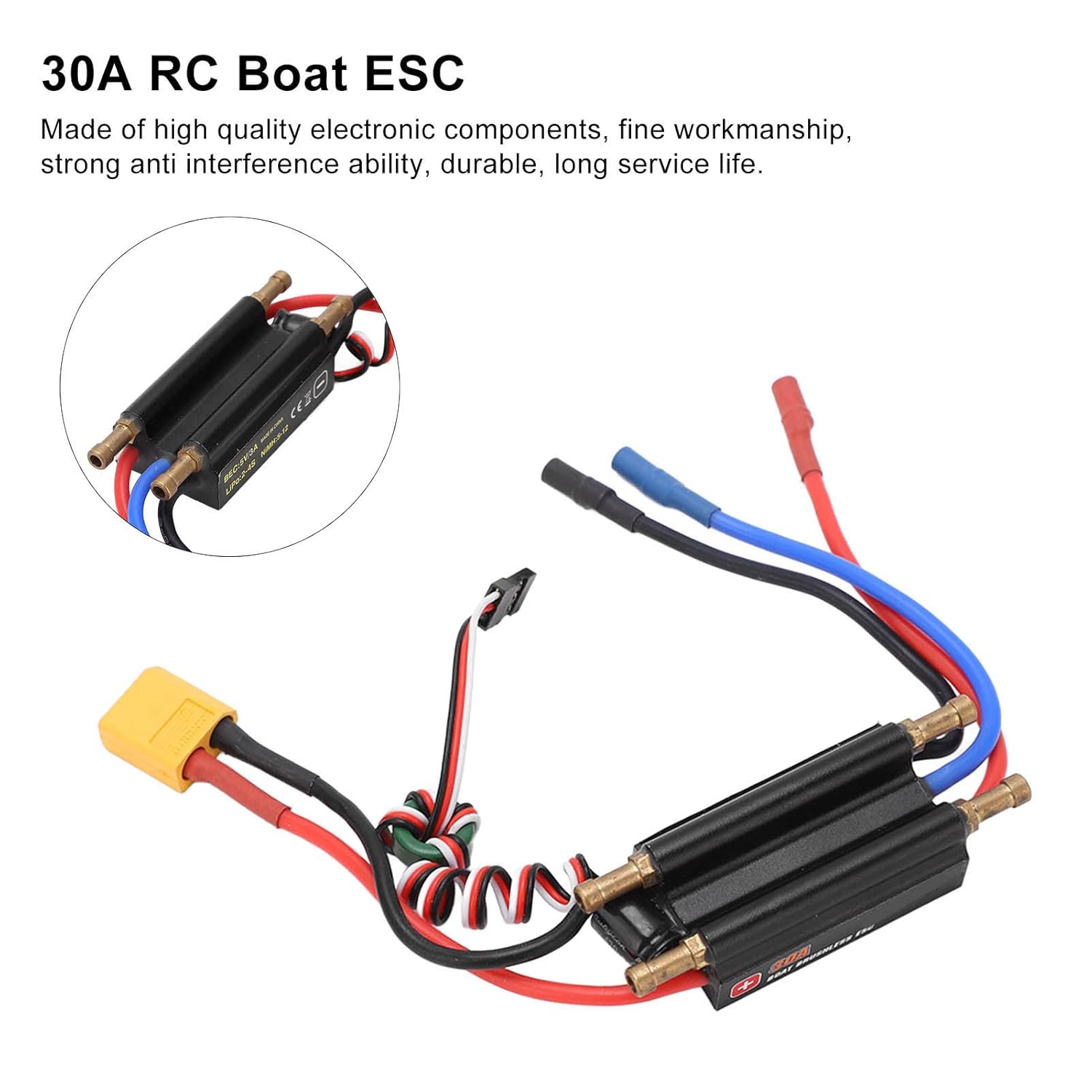 Materiale premium: realizzato con componenti elettronici di qualità, sottile fattura, forte capacità di interferenza anti -interferenza, durevole, durata di lunga durata. Il drenaggio a doppio canale, può rapidamente rinfrescarsi, è una scelta eccellente per migliorare le prestazioni delle barche a telecomando. Supporto LiPO: 2-4S, BEC: 5V/3A, NIMH: 5-12, Tipo di spina: XT60, Peso: circa 65 g/2,3 once, Materiale: componenti elettronici, corrente continua: 30a, corrente istantanea: 40a (10 secondi), lunghezza del cavo di potenza: circa. 100 mm/3.9in, dimensione: ca. 70x27x17mm/2.8x1.1x0.7in, navi RC compatibili, lunghezza: 450mm/17.7in navi RC 30A RC Boat ESC: adotta una nuova progettazione di circuiti, un carico elevato con servo, un consumo energetico inferiore, che aiuta a migliorare le prestazioni complessive. SBEC incorporato è super semplice e conveniente da utilizzare e i parametri possono essere configurati tramite trasmettitore o scheda di programma. RC Brushless ESC: RC Brushless ESC è realizzato con materiale metallico eccellente, compatto e robusto, a prova di usura e durata, resistenza e stabilità eccellenti, non facilmente danneggiate o rotte, l'ESC ha una forte capacità anti -corrente, alta efficienza, basso rumore, basso consumo di energia, buone prestazioni di dissipazione del calore Metodo di connessione: collegare il governatore elettronico senza spazzole al ricevitore. Collegare i tre fili del motore all'ESC con i colori corrispondenti. Collegare il cavo di alimentazione della spina XT60 alla batteria per accendersi.