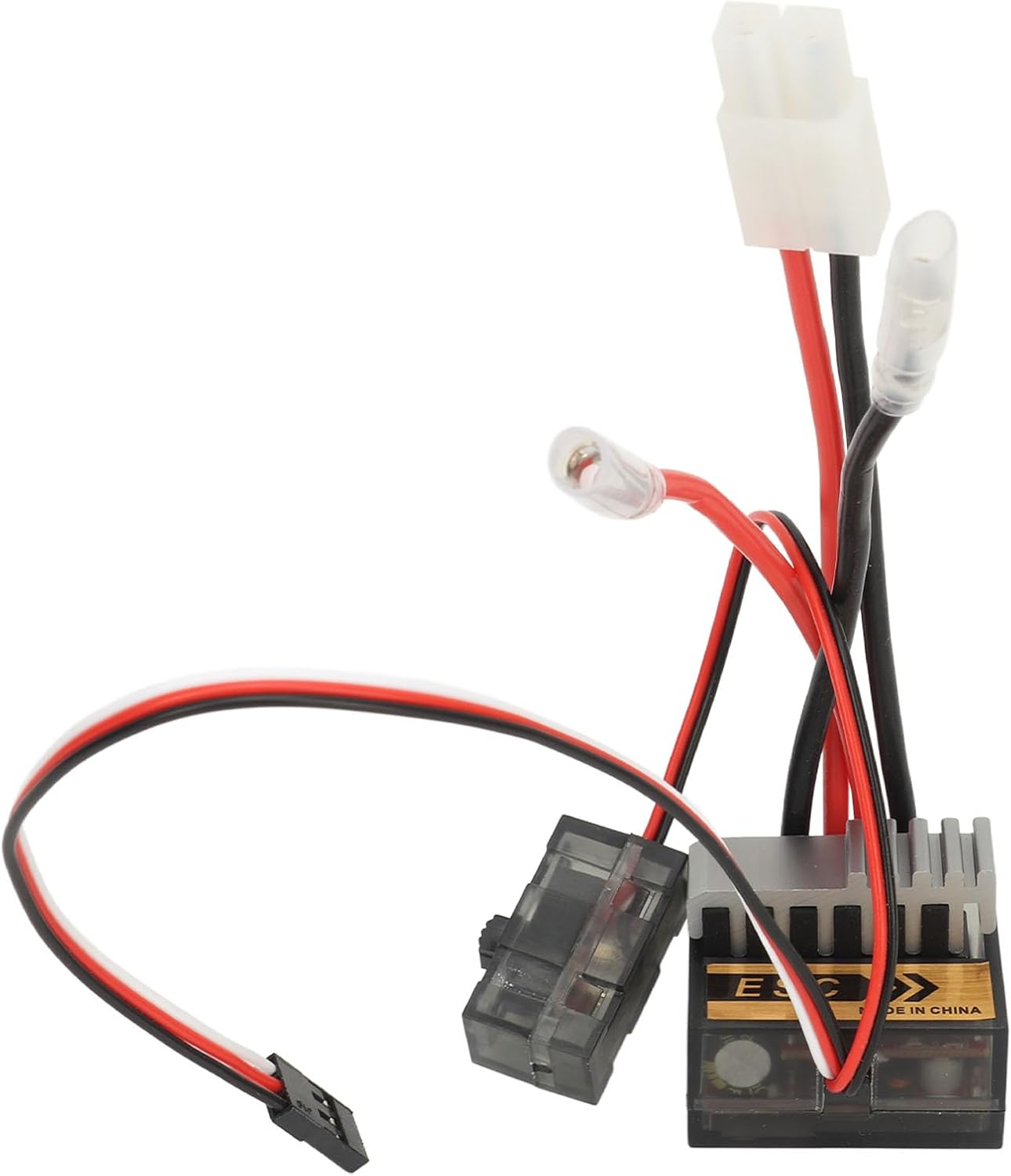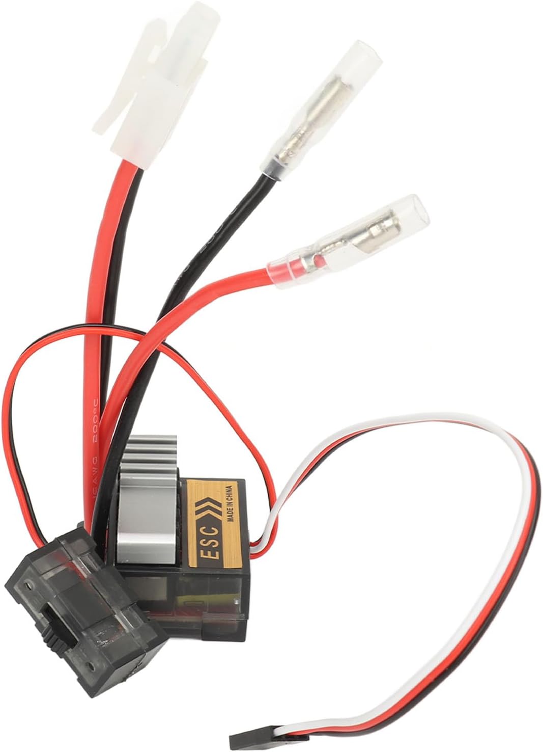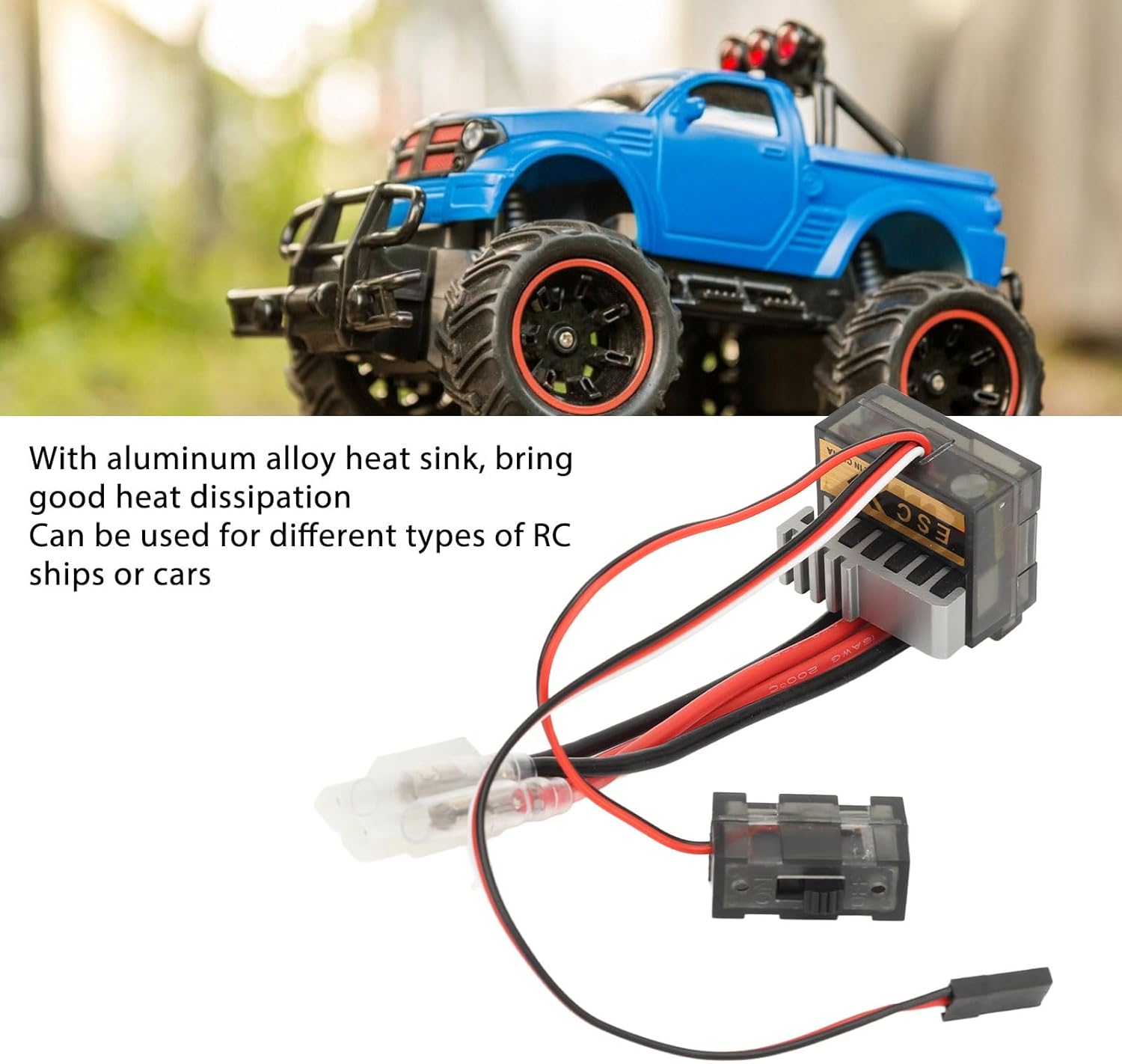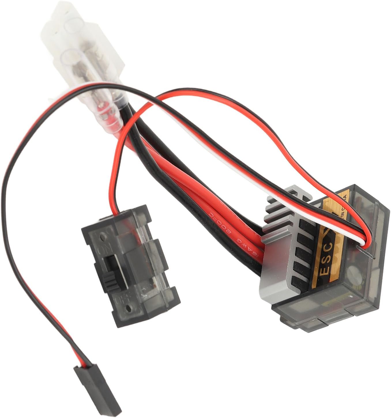 Dissipazione del calore: con dissipatore di calore in lega di alluminio, che può garantire una buona dissipazione del calore per gli ESC. Oggetti applicabili: questo ESC spazzolato è piccolo e potente e può essere utilizzato in diversi di o automobili RC. di azionamento ad alta frequenza: utilizza una camera d'aria con effetto di campo a bassa resistenza. Ha funzioni anteriori e posteriori per auto e barche RC. Durevole da usare: questo ESC spazzolato è realizzato in plastica di alta qualità e materiale in lega di alluminio, durevole e non facile da danneggiare, può essere utilizzato a lungo. Prestazioni stabili: quando collegato al motore, può fornire 320 A in avanti, picco istantaneo 600 A, 160 A inverso, corrente di frenatura 250 A.