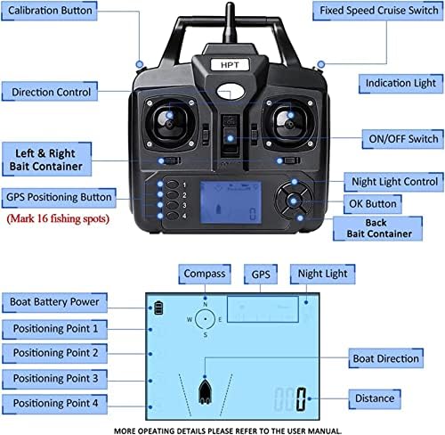 Wireless Sonar Fish Finder: Questa barca RC è dotata di un ecoscandaglio wireless che trasporta esca, ganci e apparecchiature di rilevamento nei luoghi di pesca scelti. Lo schermo LCD fornisce immagini chiare del paesaggio sottomarino e della presenza di pesci, con profondità di rilevamento che vanno da 0,6 a 45 metri, rendendolo adatto a vari scenari di pesca. Telecomando GPS con 16 posizioni: migliorato con funzionalità GPS per localizzare 16 punti di pesca, questa barca alimentatore garantisce un posizionamento accurato dell'esca. Dispone inoltre di una funzione di ritorno automatico in caso di perdita di segnale, insieme a uno schermo LCD che mostra lo stato della batteria, la direzione della bussola e la distanza dalla barca. Sistema automatico di crociera: attiva la funzione di crociera automatica tramite telecomando per un funzionamento senza sforzo. Un giroscopio integrato stabilizza la nave, correggendo automaticamente qualsiasi deriva per mantenere il suo corso, anche in acque ventilate o mosse. Design versatile e durevole: questa barca è alimentata da doppi motori e dotata di protezioni per eliche per prevenire gli zoccoli dalle alghe. La sua struttura in materiale ABS garantisce uno scafo completamente chiuso e anti-collisione, completo di luci a LED per una migliore visibilità durante le spedizioni di pesca notturne. Batteria a lunga durata da 5200 mAh: la barca è dotata di una batteria al litio ad alta capacità da 5200 mAh, che offre 2-3 ore di funzionamento con una singola carica. Il rilevatore supporta anche la ricarica USB e le batterie buffer opzionali sono disponibili per sessioni di pesca più lunghe.