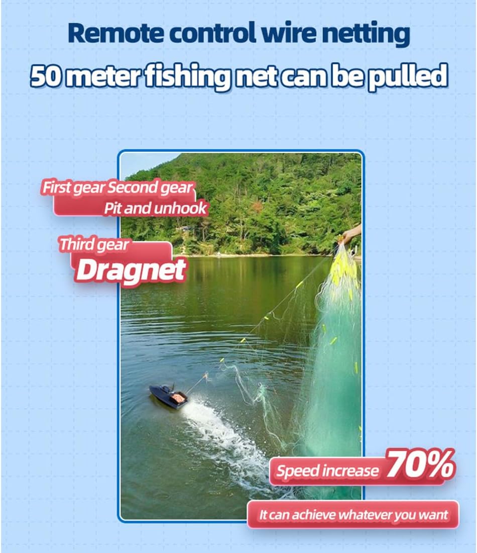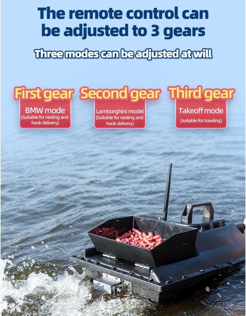 Esca GPS a tripla velocità con telecomando da 600 m - Caratteristiche bassa, media e alta velocità modalità per esca precisa, consegna gancio e pesca a strascico efficiente, alimentato da un motore tedesco serie 5 ad alto numero di giri per un funzionamento fluido e silenzioso. Perfetto per la pesca alla carpa e la pesca selvaggia in laghi e fiumi 50m Trawling & One-Touch Net Dropping – La pesca a strascico telecomandata supporta la trazione di reti da pesca fino a 50 metri, con un sistema di rilascio elettromagnetico per una distribuzione istantanea della rete nel punto perfetto Durata della batteria estesa da 18.000 mAh - Offre 7 ore a bassa velocità, 5 ore a media e 3 ore ad alta velocità, garantendo sessioni di pesca tutto il giorno senza frequenti ricariche. Ricarica USB per auto supportata (non compatibile con power bank o caricabatterie mobili) Design a doppio scafo per una stabilità superiore – Lo scafo aerodinamico migliora la resistenza alle onde e riduce la resistenza, mentre la gamma di controllo di 600 m garantisce un funzionamento affidabile anche con venti Force 6 99 Waypoint GPS e ritorno automatico a casa: segna con precisione fino a 99 waypoint GPS per esca strategica. La funzione di ritorno automatico si attiva con batteria scarica o segnale perso e le luci notturne anteriori/posteriori garantiscono una navigazione sicura in condizioni di scarsa illuminazione