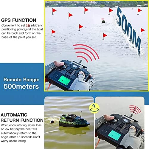 Ecoscandaglio sonar wireless avanzato: La nostra barca di alimentazione dispone di un sofisticato ecoscandaglio wireless sonar, che consente di trasportare esca, ganci e rilevatori direttamente ai punti di pesca mirati. Lo schermo LCD visualizza immagini dettagliate del paesaggio sottomarino e delle posizioni dei pesci, con capacità di rilevamento della profondità che vanno da 0,6 a 45 metri, rendendolo adatto per la pesca sul ghiaccio, la pesca fluviale, la pesca in mare e la pesca in kayak. Telecomando GPS migliorato: questa barca di alimentazione è stata aggiornata da 4 a 16 punti di pesca grazie al posizionamento GPS avanzato. Può facilmente navigare tra questi 16 posizioni. In caso di perdita di segnale o batteria scarica, la barca RC ritorna automaticamente al punto di partenza. Lo schermo LCD mostra anche lo stato della batteria, le direzioni della bussola e gli avvisi per il recupero della barca. Comodo sistema di crociera automatico: il motoscafo è dotato di un sistema di crociera automatico che gli consente di continuare ad avanzare senza richiedere cambi di direzione manuali. Con il giroscopio integrato, stabilizza il corpo e corregge il suo corso, consentendo una navigazione fluida anche in condizioni di vento o instabilità. Design versatile e durevole: il mangime è alimentato da doppi motori ed eliche, che sono protetti da coperture per tenere a bada le alghe. Realizzata in materiale ABS di alta qualità, questa barca completamente chiusa presenta un design dello scafo anti-collisione ed è dotata di luci a LED per una maggiore visibilità durante la pesca notturna. Affidabile batteria al litio ad alte prestazioni: la barca di alimentazione funziona con una batteria al litio da 5200 mAh che è facile da installare e può essere caricata separatamente. Dopo una carica completa, offre circa 2-3 ore di utilizzo, mentre il rilevatore può anche essere caricato tramite USB. Hai la possibilità di selezionare batterie tampone aggiuntive in base alle tue esigenze.