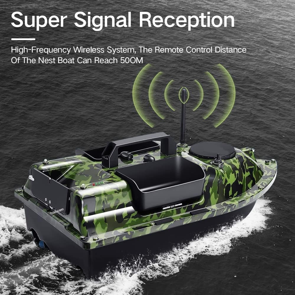 16 punti di memoria programmabili: facile da impostare e navigare tra 16 punti di memoria per un controllo preciso. La funzione di ritorno a un tasto consente un rapido ritorno alla posizione di partenza, garantendo un funzionamento semplice e conveniente. Batteria ad alta capacità da 12.000 mAh: dotata di tre batterie da 12.000 mAh, ognuna delle quali fornisce 4-6 ore di funzionamento continuo, garantendo un uso prolungato senza frequenti ricariche. Esca e gancio integrati: progettato per il posizionamento senza sforzo di esche e ami. La barca può essere controllata a distanza fino a 500 metri, con ritorno a un pulsante e crociera automatica per facilità d'uso. Indicatori LED per la pesca notturna: le luci LED integrate facilitano il funzionamento notturno indicando chiaramente la direzione della barca, consentendo un lancio preciso dell'esca in condizioni di scarsa illuminazione. Ricezione del segnale migliorata: offre un raggio di controllo remoto di 300-500 metri. Si noti che la presenza di ostacoli o interferenze del segnale può ridurre questo intervallo operativo.