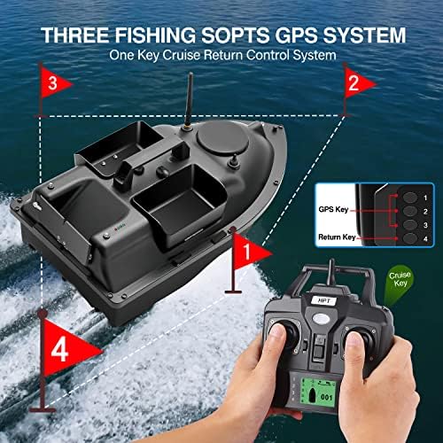 Costruzione durevole: realizzata in materiale industriale ABS di alta qualità, questa barca offre prestazioni stabili con proprietà impermeabili, resistenti all'usura e galleggianti. Le tre tramogge possono contenere oltre 2 kg di esca e potenti motori doppi sono dotati di eliche a tre pale per una maggiore manovrabilità, dotate di luci notturne per una navigazione accurata. Prestazioni eccezionali: con un corpo ampio e una gravità stabile, questa barca può resistere a venti fino al livello 7-8, rendendola adatta sia per laghi che oceani. È dotato di una robusta batteria da 5200 mAh, che fornisce un lungo tempo di standby di 2-3 ore, insieme a un sistema di correzione intelligente per una velocità costante e movimenti in linea retta. Controller GPS avanzato: il controller a due mani dispone di tre punti di pesca GPS con una portata fino a 500M. È possibile attivare facilmente il ritorno intelligente con un tasto e le funzioni di crociera automatica. Lo schermo LCD visualizza la posizione della barca in tempo reale e la distanza offshore per un comodo monitoraggio. Ecoscandaglio LCD high-tech: questo fishfinder LCD simula ambienti e terreni subacquei, mostrando la posizione e la profondità degli strati di pesce. Il sensore sonar rileva gamme subacquee fino a 90 gradi e profondità di quasi 100 m, rendendolo leggero e adatto per varie tecniche di pesca. Collegamento senza soluzione di continuità tra barca e fishfinder: basta legare la tramoggia posteriore della barca al sonar del fishfinder. Una volta attivato, quando raggiungi il punto GPS impostato, accendi lo schermo dell'ecoscandaglio per analizzare l'area dell'acqua e localizzare i pesci in modo efficace. La combinazione di entrambi gli strumenti migliora l'efficienza della pesca.