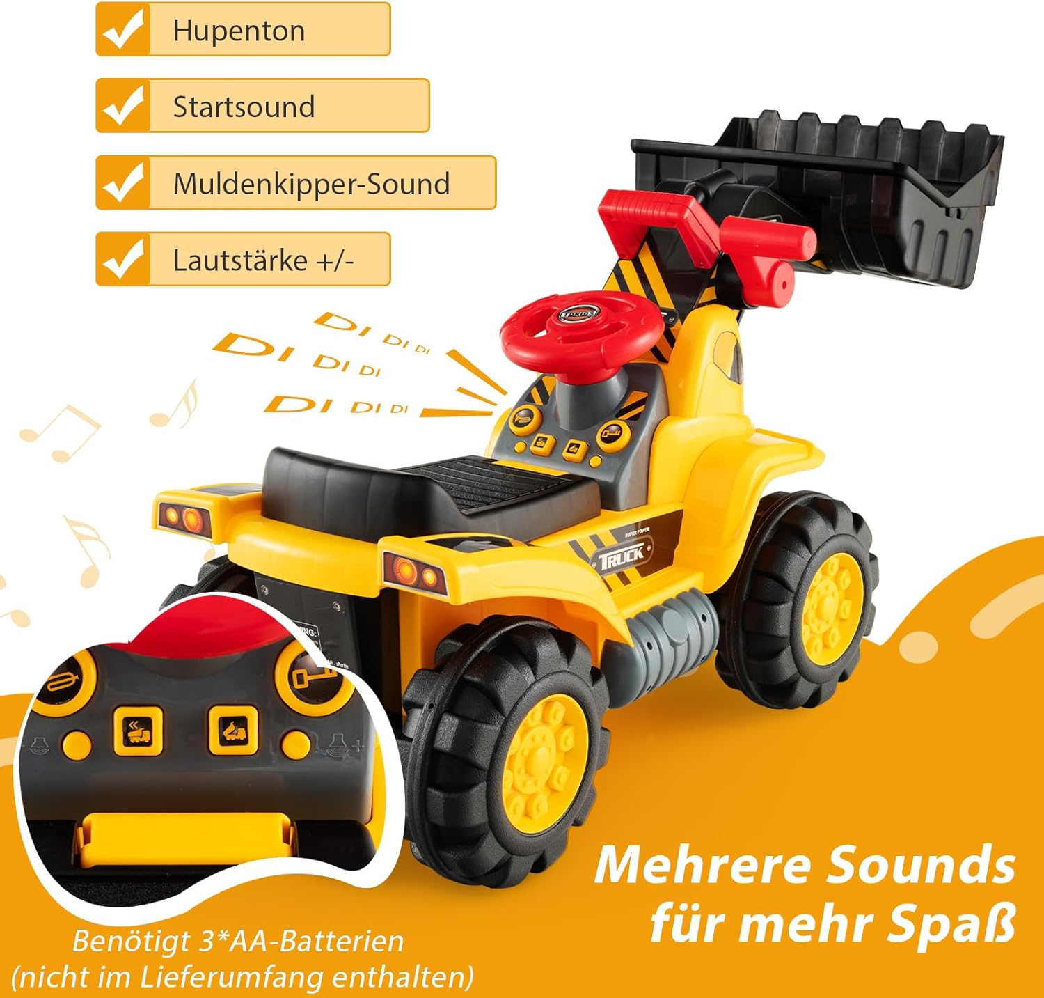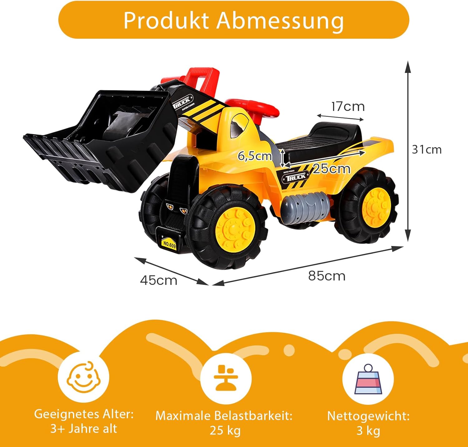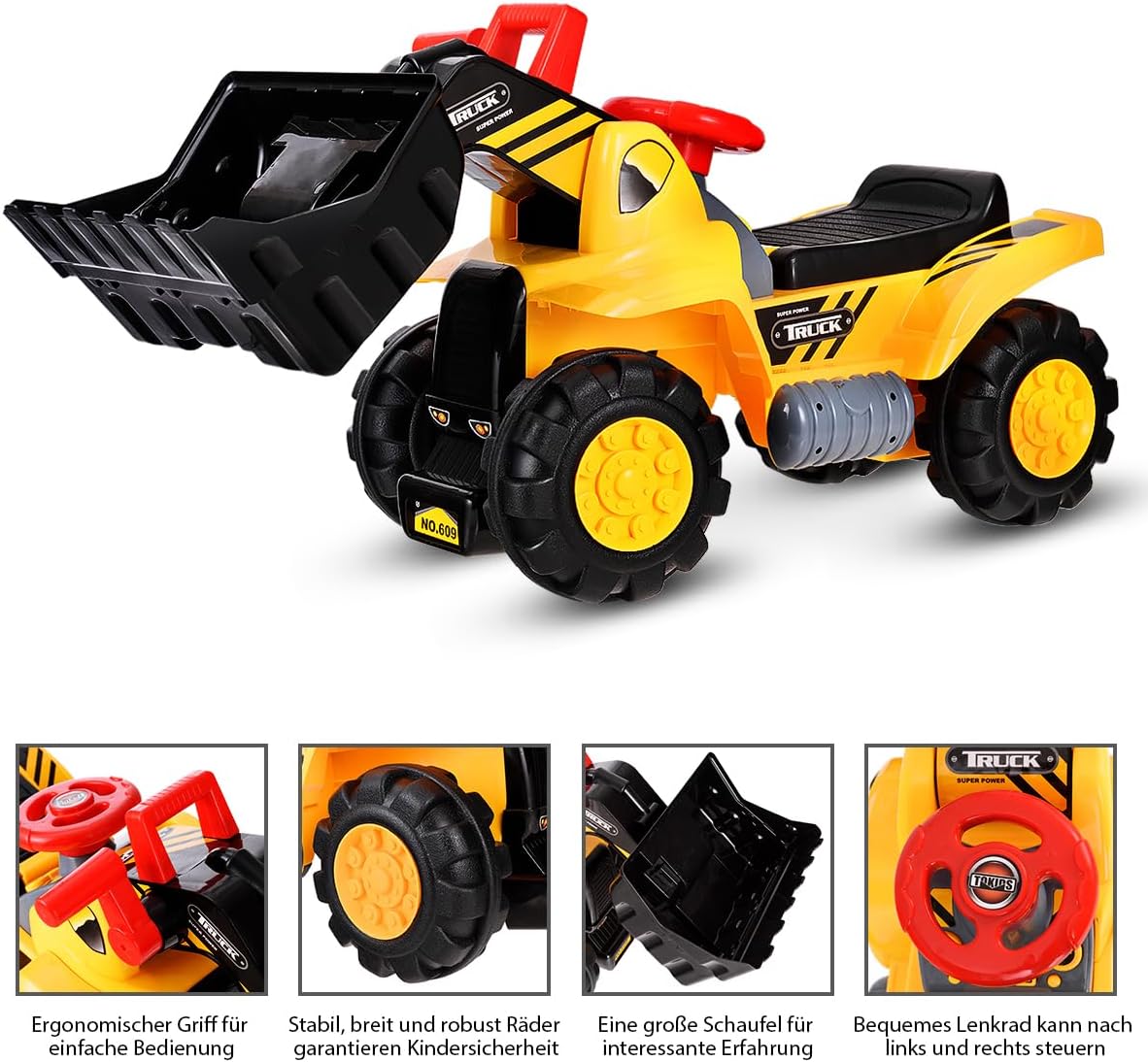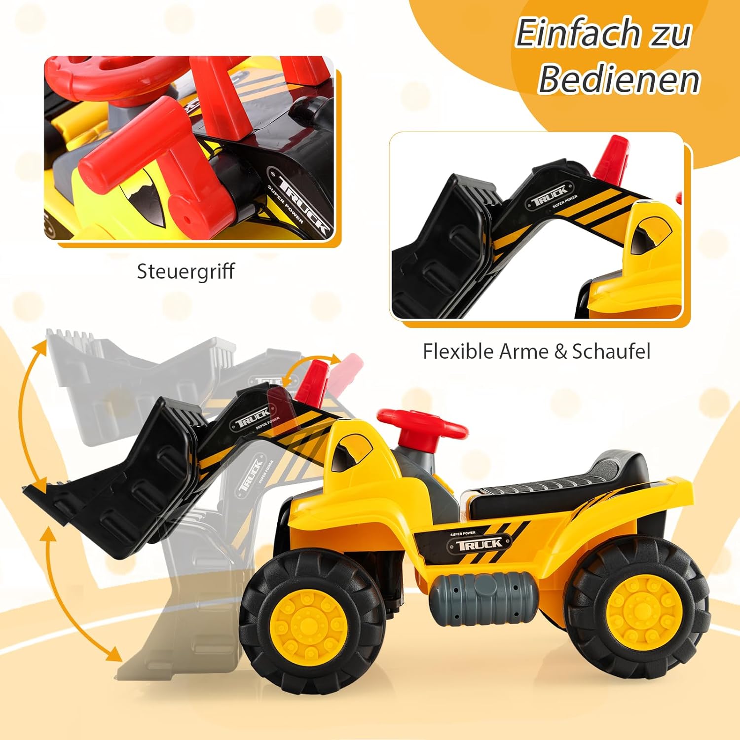 *Comfort e sicurezza* Dotato di un sedile comodo e ampio con schienale e superficie antiscivolo, l'escavatore con operatore a bordo offre sicurezza e comfort ottimali durante la guida. Inoltre, l'ampio spazio di stivaggio sotto il sedile garantisce che i tuoi giocattoli preferiti siano sempre con te. *Costruzione robusta e facile manutenzione* Realizzato in materiale PP di alta qualità, il nostro veicolo da guidare è resistente e leggero, ideale per il trasporto. Le ruote in polietilene ad alta densità sono grandi e antiscivolo, il che garantisce un'elevata stabilità su varie superfici. Dopo aver giocato nella sabbiera, l'escavatore è facile da pulire. *Funzionalità interattive per un divertimento di gioco realistico* Dotato di volante e pala regolabile tramite maniglia rotante, il nostro escavatore giocattolo offre un'autentica esperienza di gioco. Il clacson integrato rafforza la sensazione di lavorare in un vero cantiere edile e rende il gioco ancora più emozionante. *Modalità di funzionamento manuale ed elettrica* Il trattore per bambini è pratico e offre la possibilità di essere azionato manualmente o con un motore elettrico semplicemente installando una batteria da 1,5 V (non inclusa). I tuoi bambini potranno controllare facilmente l'escavatore premendo i pulsanti per divertirsi a scavare terra, sabbia o piccoli sassi. *Ideale per i giovani esploratori* Questo veicolo escavatore è perfetto per i bambini dai 3 anni in su e promuove le capacità motorie e l'immaginazione. Che sia nel giardino di casa, nella sabbiera o nella cameretta dei bambini, l'escavatore da seduta per bambini consente avventure creative in cantiere e ore di divertimento per i vostri piccoli.