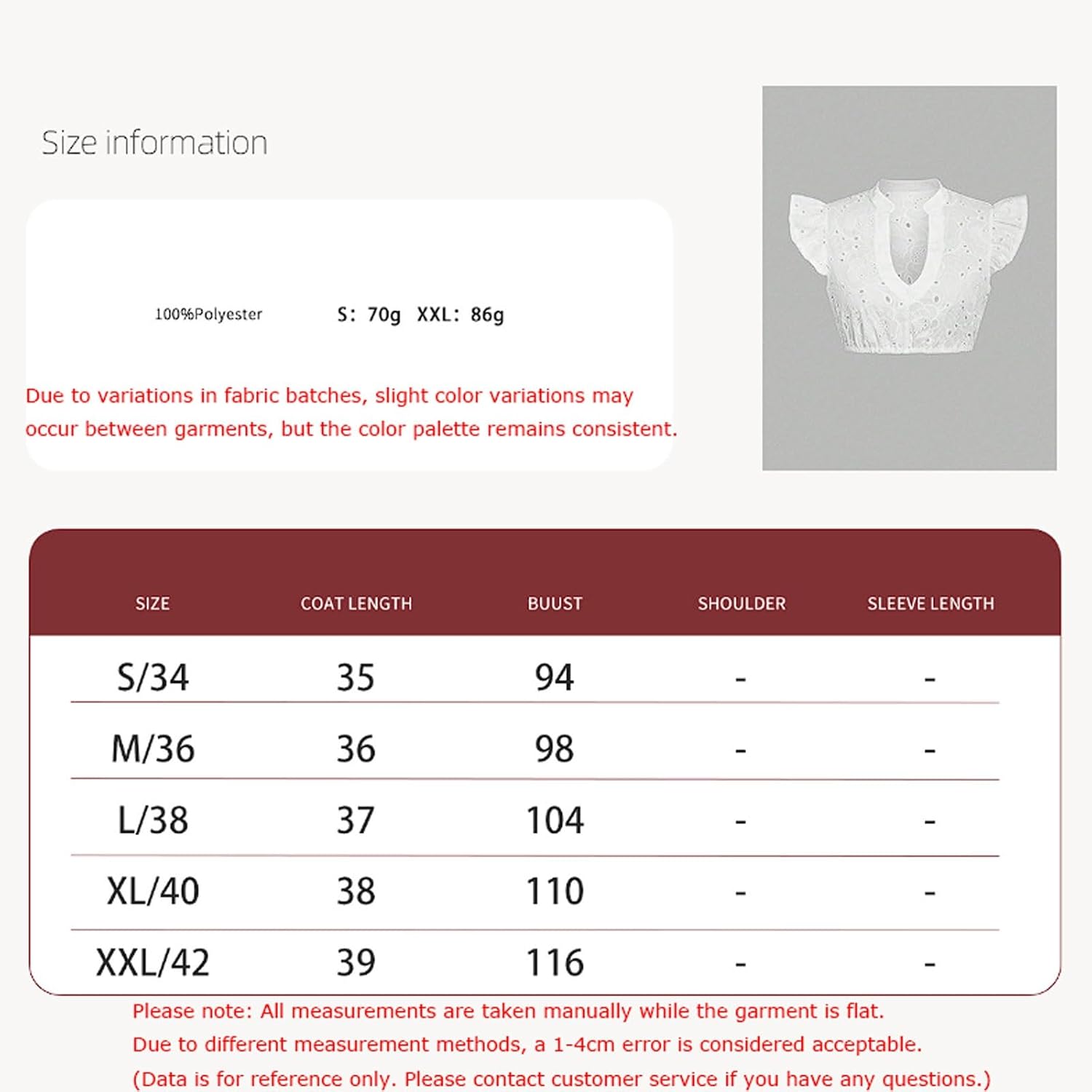 Punti salienti del design: Tonalità bianco puro: fornisce una base fresca e versatile che si abbina facilmente a qualsiasi costume o accessorio. Scollatura a V allungata: crea una silhouette lusinghiera attirando l'attenzione verso l'alto e accentuando la scollatura. Ricamo e uncinetto intricati: aggiungono un tocco di arte e femminilità al design classico. Tessuto in poliestere morbido: garantisce comfort e traspirabilità for un utilizzo quotidiano. Taglie e vestibilità: Questo top è disponibile nelle taglie S, M, L, XL e XXL. Ha una vestibilità aderente che lo rende perfetto sotto gli abiti Dirndl. Consigliamo vivamente di consultare la tabella delle taglie dettagliata fornita nelle immagini del prodotto prima di effettuare l'ordine, for garantire la migliore vestibilità for il tuo costume. Materiale e cura: Tessuto: 100% poliestere Cura: si consiglia il lavaggio a mano o in lavatrice con ciclo delicato. Stendere ad asciugare for preservare i ricami e i dettagli all'uncinetto. Nota importante: A causa delle variazioni nei lotti di tintura dei tessuti, potrebbero verificarsi lievi differenze nella tonalità del bianco. Questo è uno standard del settore. for qualsiasi domanda riguardante le taglie o lo stile, il nostro servizio clienti è a tua disposizione!