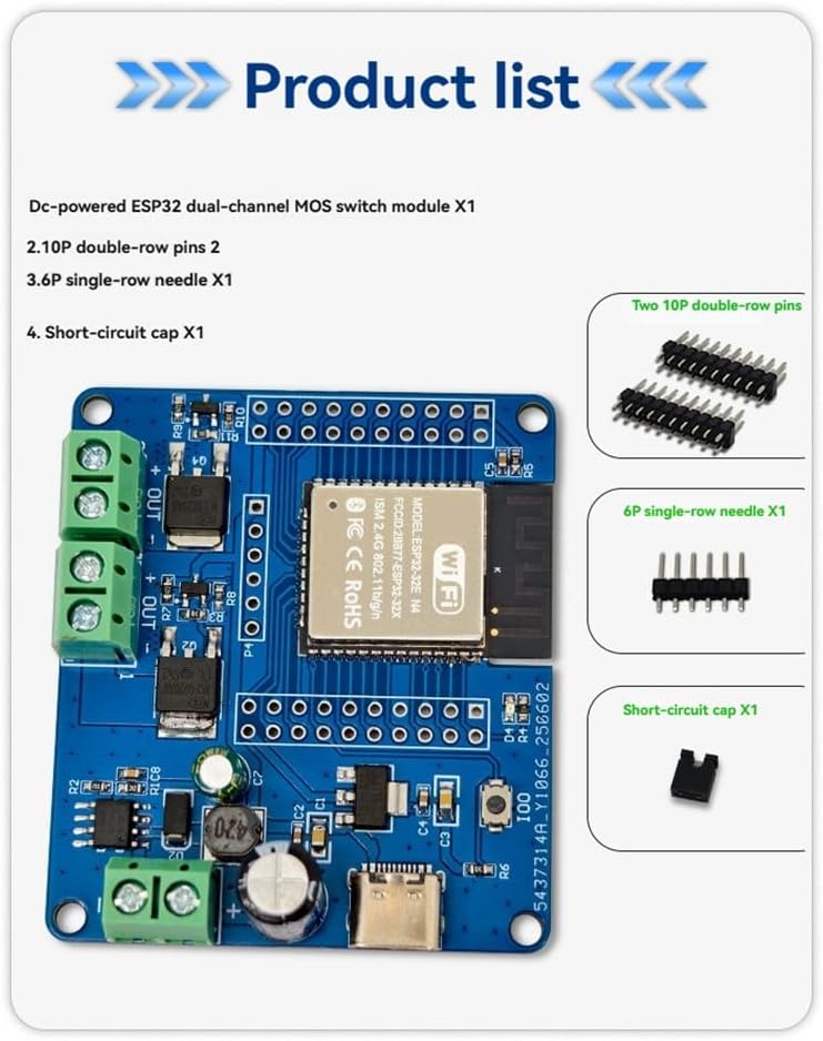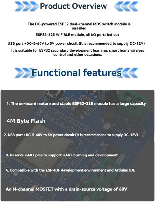 2. Connettore USB + circuito di alimentazione DC 5-60 V fino a 5 V (si consiglia l'alimentazione C-12 V) 3. Pin UART riservato, supporta lo sviluppo di urt UART 1. Integrato maturo e ESP32-32E, grande capacità 4 MB Flash 4. Compatibile con l' di sviluppo ESP-IDF e per IDE 5. Tubo MOS a canale N con tensione di scarico di 60 V